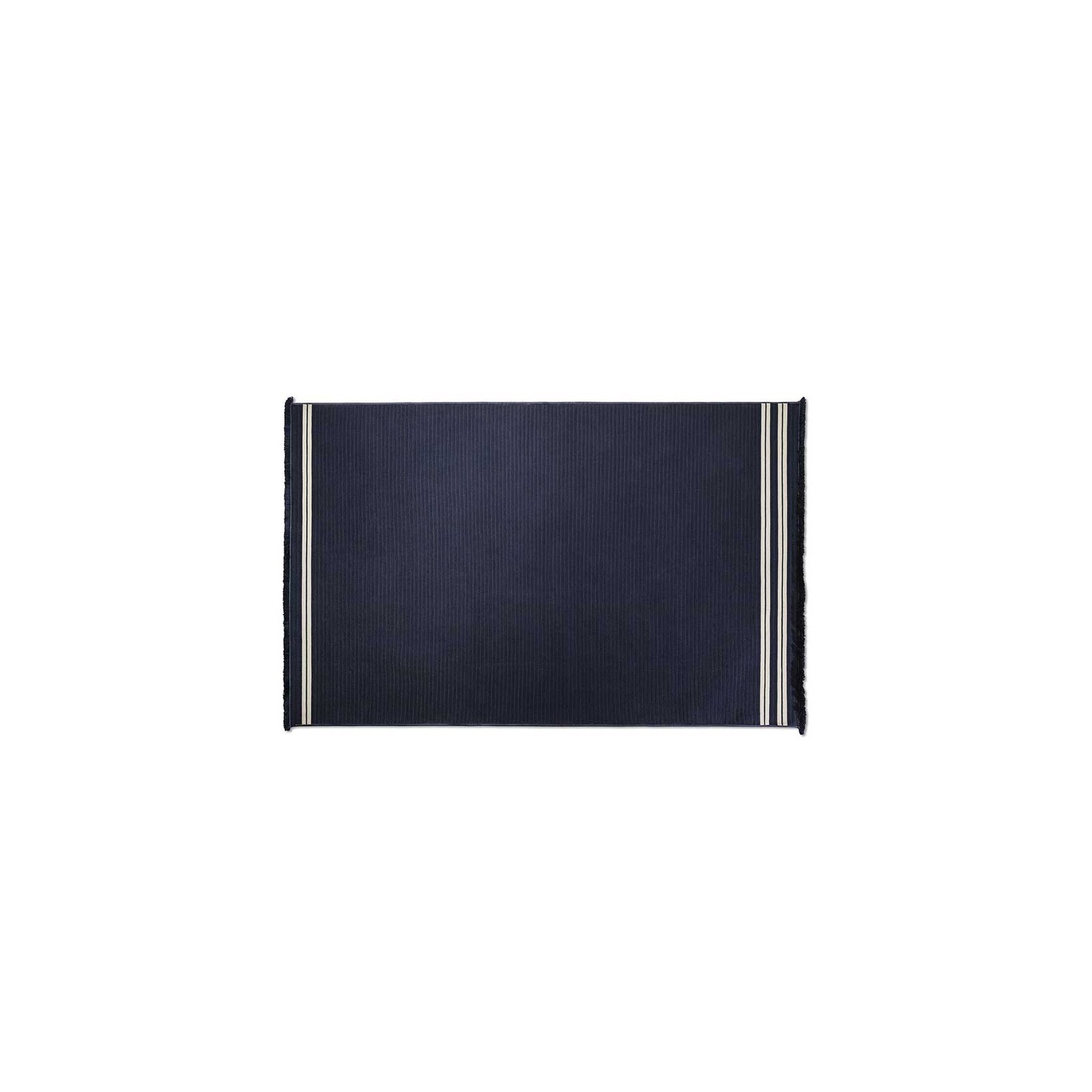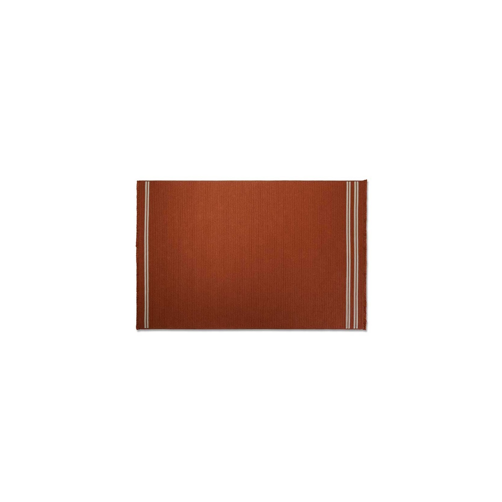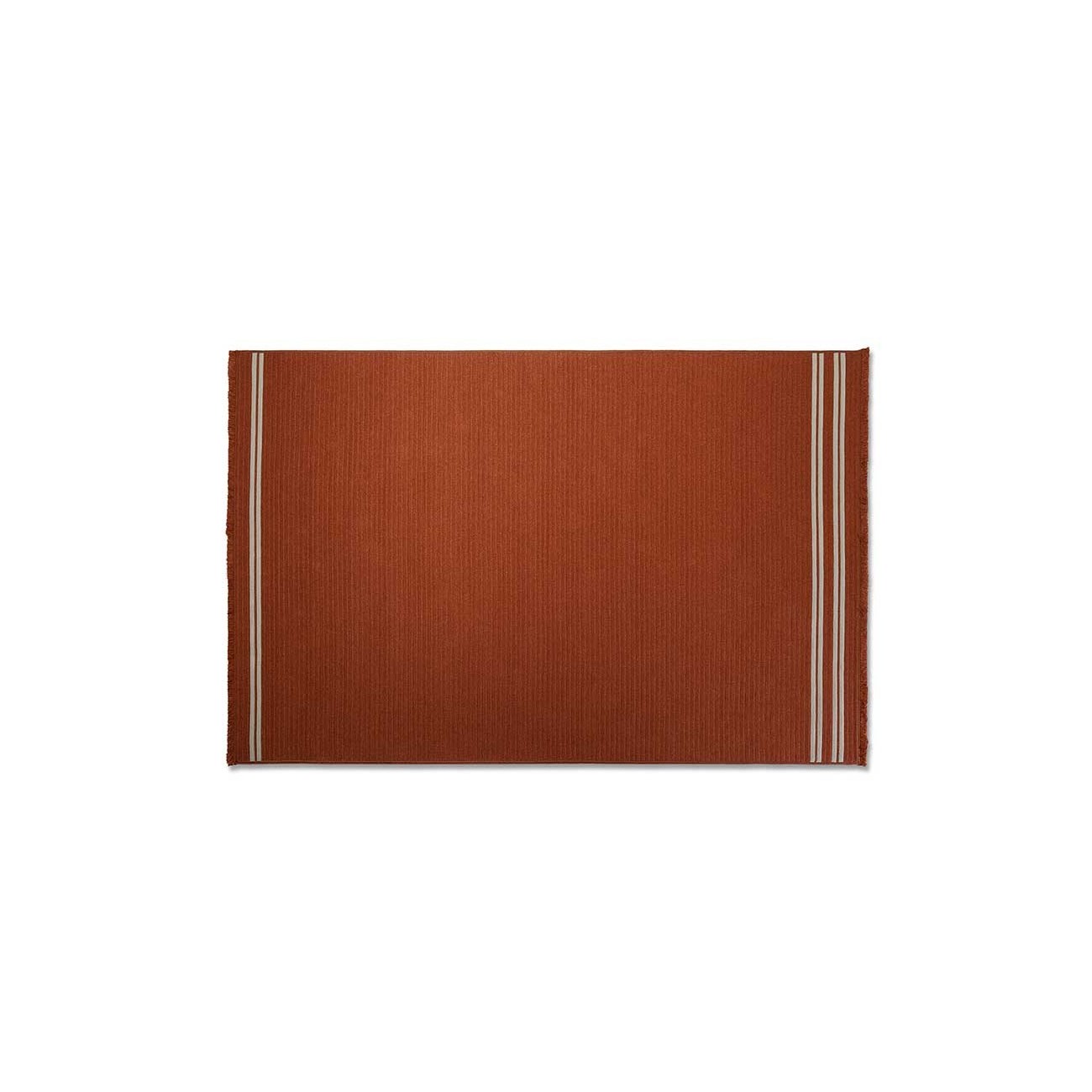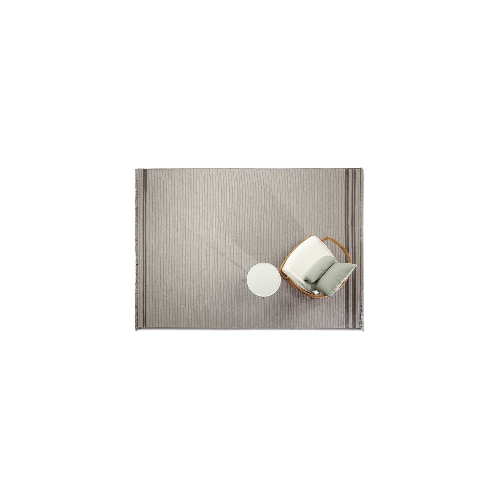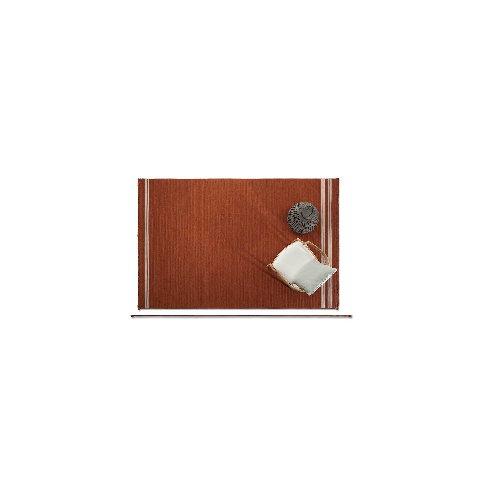 The Sherazade rug by Poltrona Frau is available in two main sizes: 200x300 cm and 250x350 cm, with the option to create custom sizes up to a maximum of 18 sqm. The design size and proportions may vary depending on the chosen size. The rug is double-sided and comes in three color variants: Ecru with grey bands, Blue with beige bands, and Rust with beige bands. The crafting technique involves using rectangular braids sewn together in a parallel pattern. The braids are made of polypropylene fibers with a mélange yarn, giving the surface a striped appearance, which is accentuated at the ends by contrasting braids. The terminal edges feature a decorative fringe made of polypropylene. The overall thickness is approximately 7 mm, with a weight of 3 kg/sqm. The Poltrona Frau® logo is displayed on a fabric label near one corner. The rug is sustainably made in Italy. Routine maintenance involves frequent vacuuming or gentle brushing to avoid surface damage. Non-greasy stains can be cleaned with a mild detergent solution, while grease stains should be treated with acetone. The fabric should be washed in cold water and air-dried.