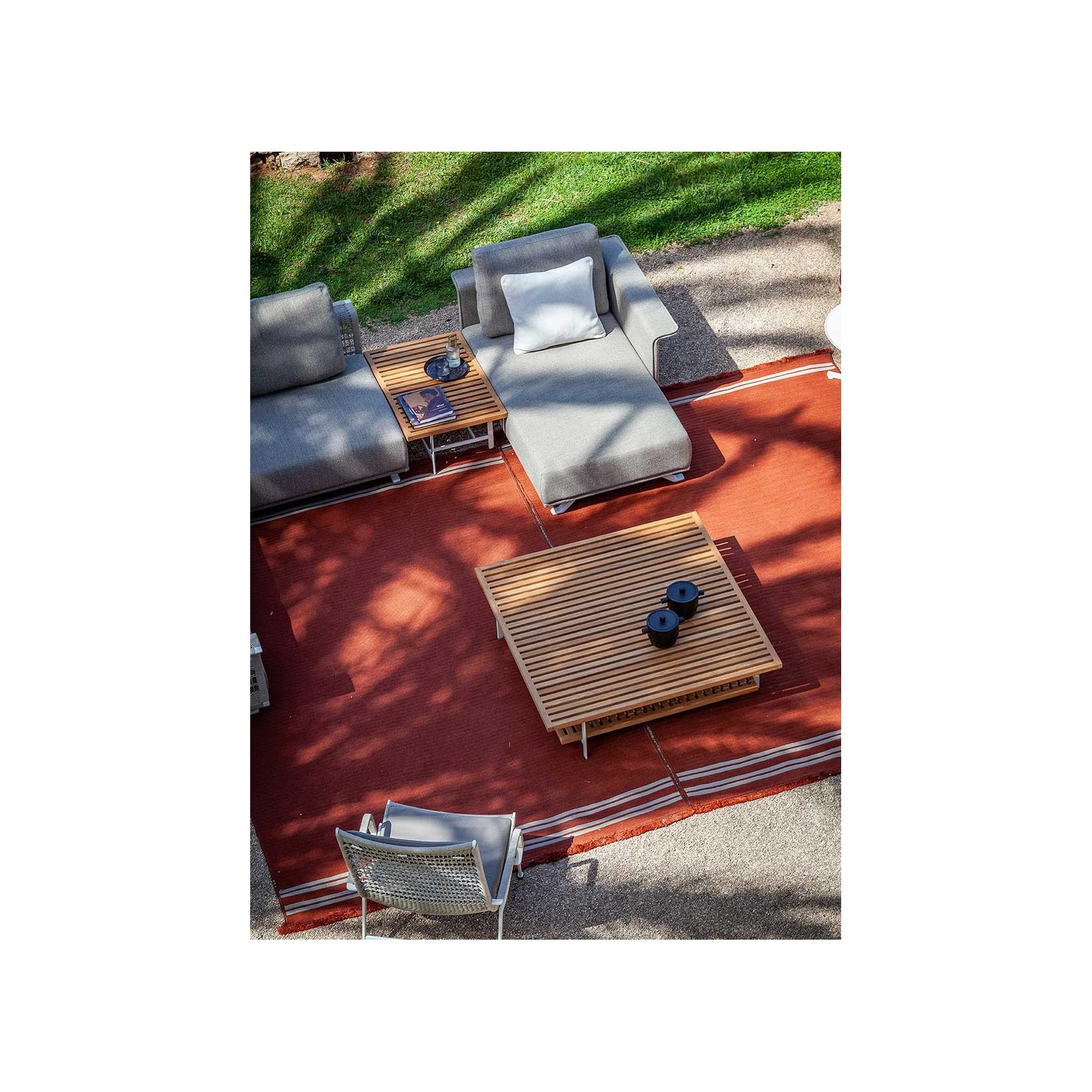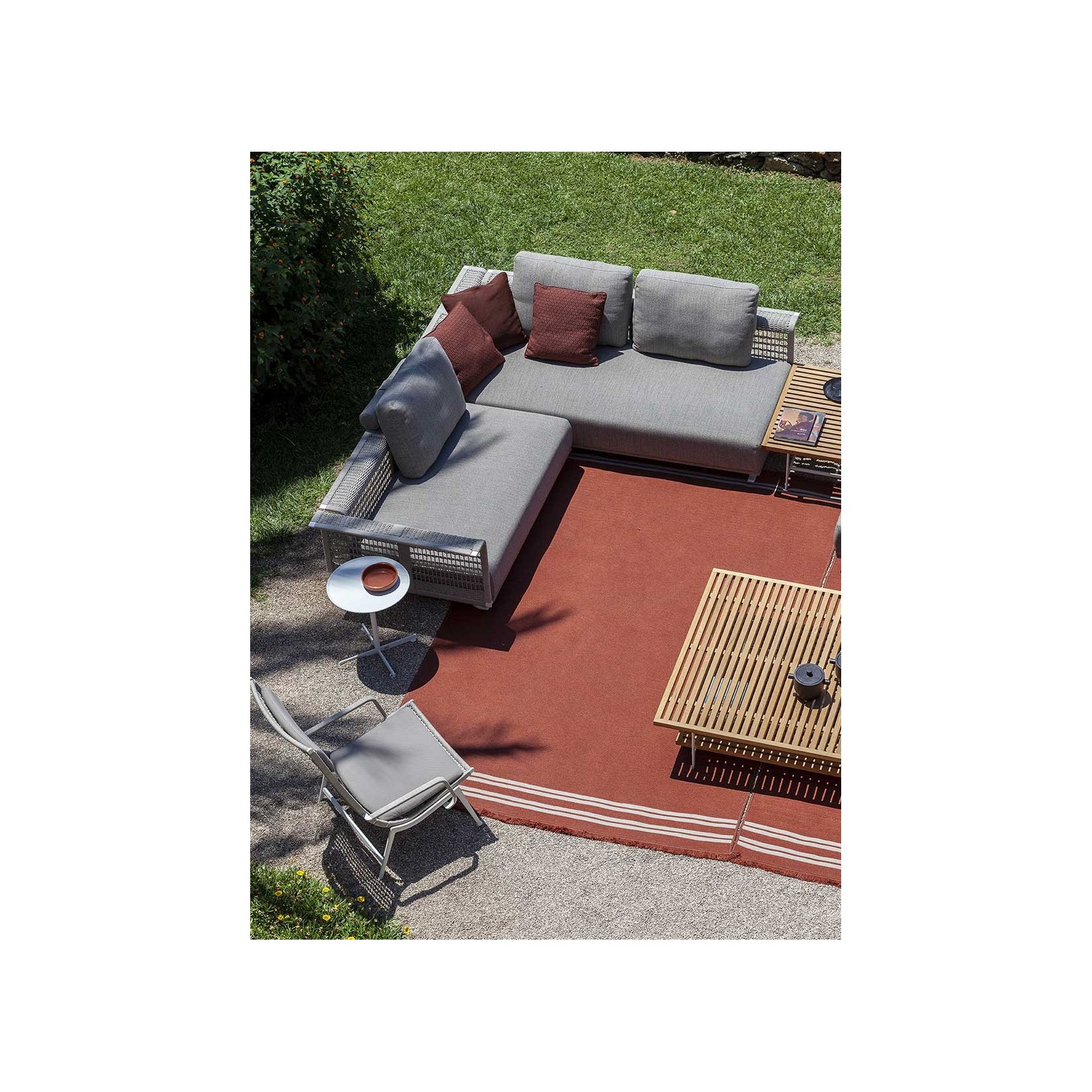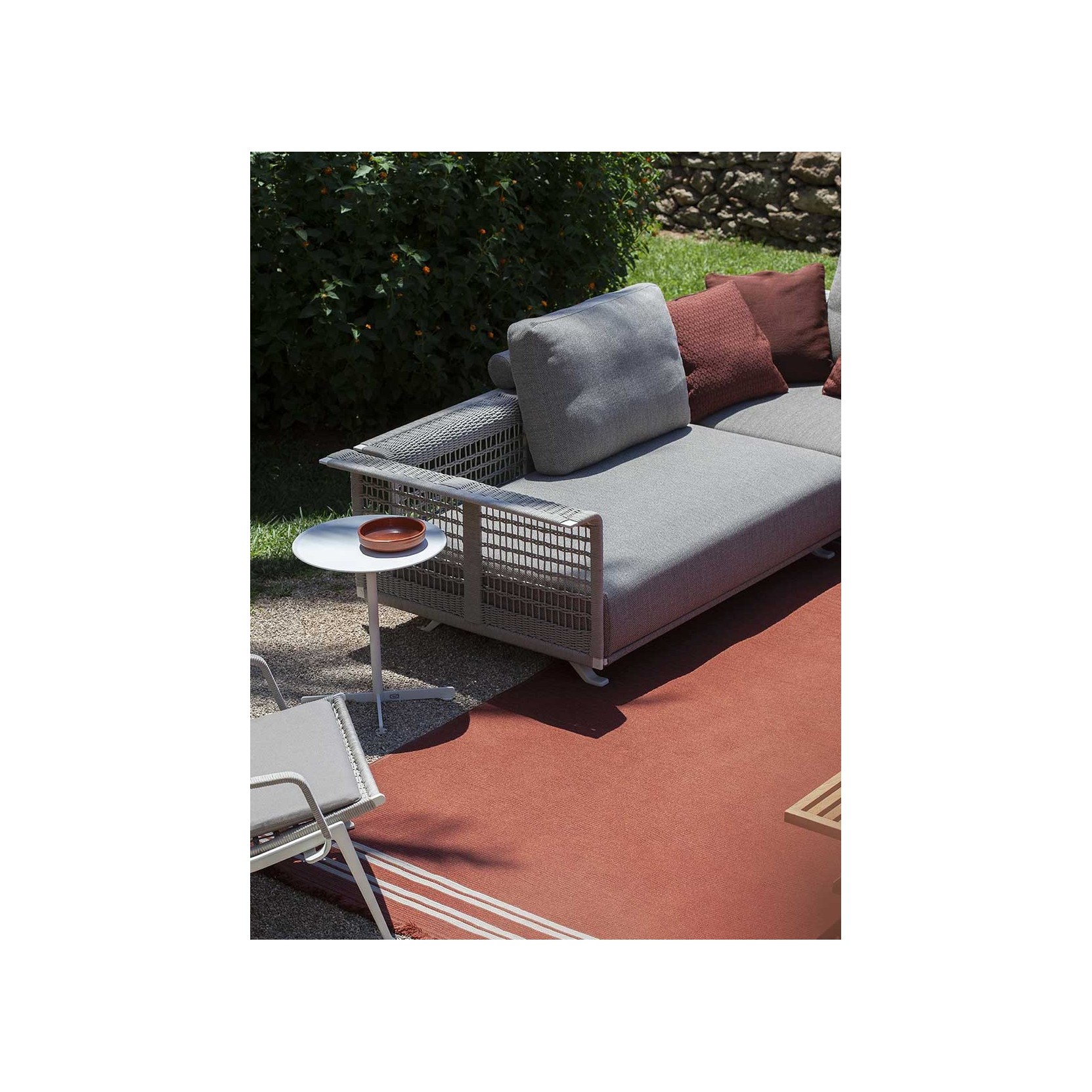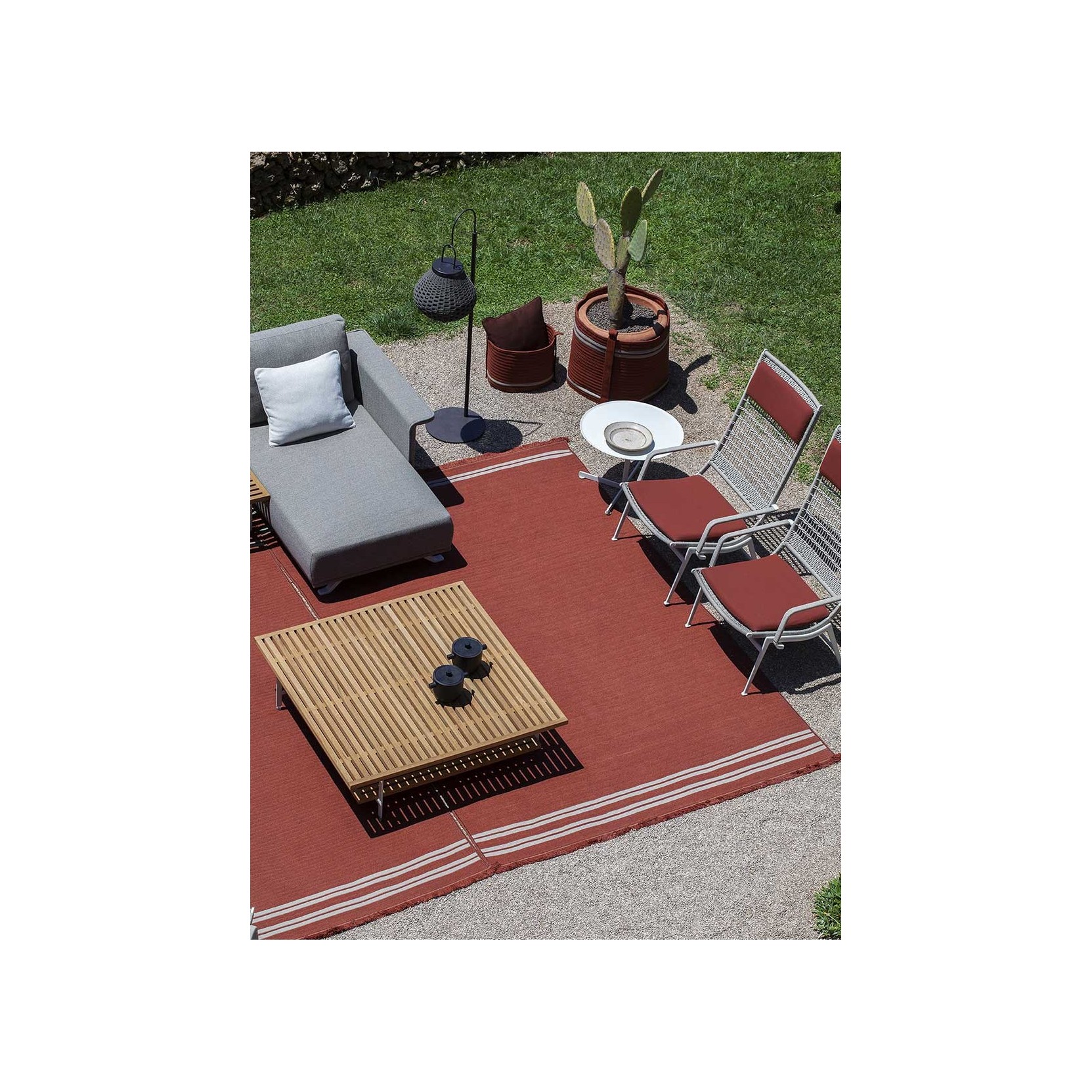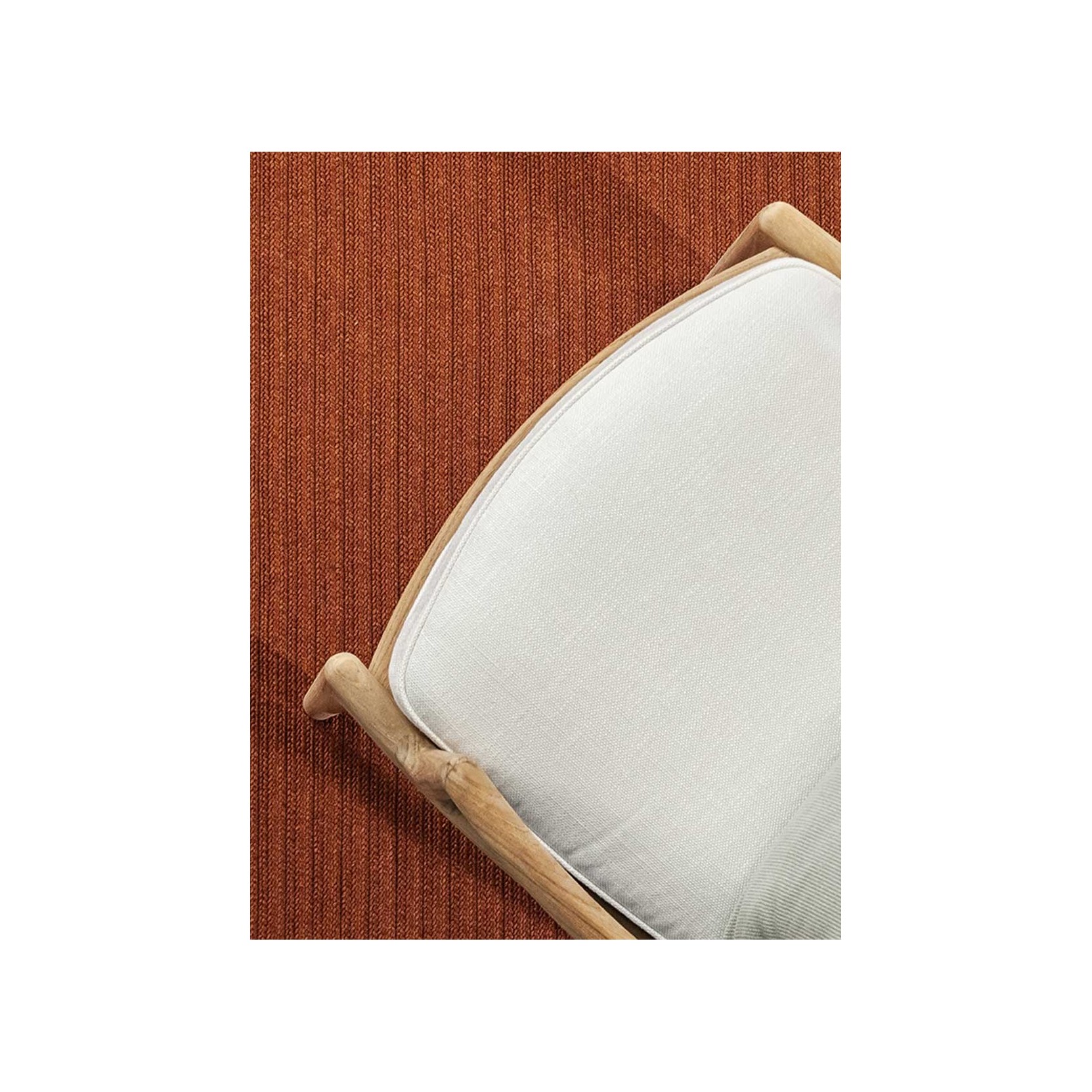 The Sherazade rug by Poltrona Frau is available in two main sizes: 200x300 cm and 250x350 cm, with the option to create custom sizes up to a maximum of 18 sqm. The design size and proportions may vary depending on the chosen size. The rug is double-sided and comes in three color variants: Ecru with grey bands, Blue with beige bands, and Rust with beige bands. The crafting technique involves using rectangular braids sewn together in a parallel pattern. The braids are made of polypropylene fibers with a mélange yarn, giving the surface a striped appearance, which is accentuated at the ends by contrasting braids. The terminal edges feature a decorative fringe made of polypropylene. The overall thickness is approximately 7 mm, with a weight of 3 kg/sqm. The Poltrona Frau® logo is displayed on a fabric label near one corner. The rug is sustainably made in Italy. Routine maintenance involves frequent vacuuming or gentle brushing to avoid surface damage. Non-greasy stains can be cleaned with a mild detergent solution, while grease stains should be treated with acetone. The fabric should be washed in cold water and air-dried.