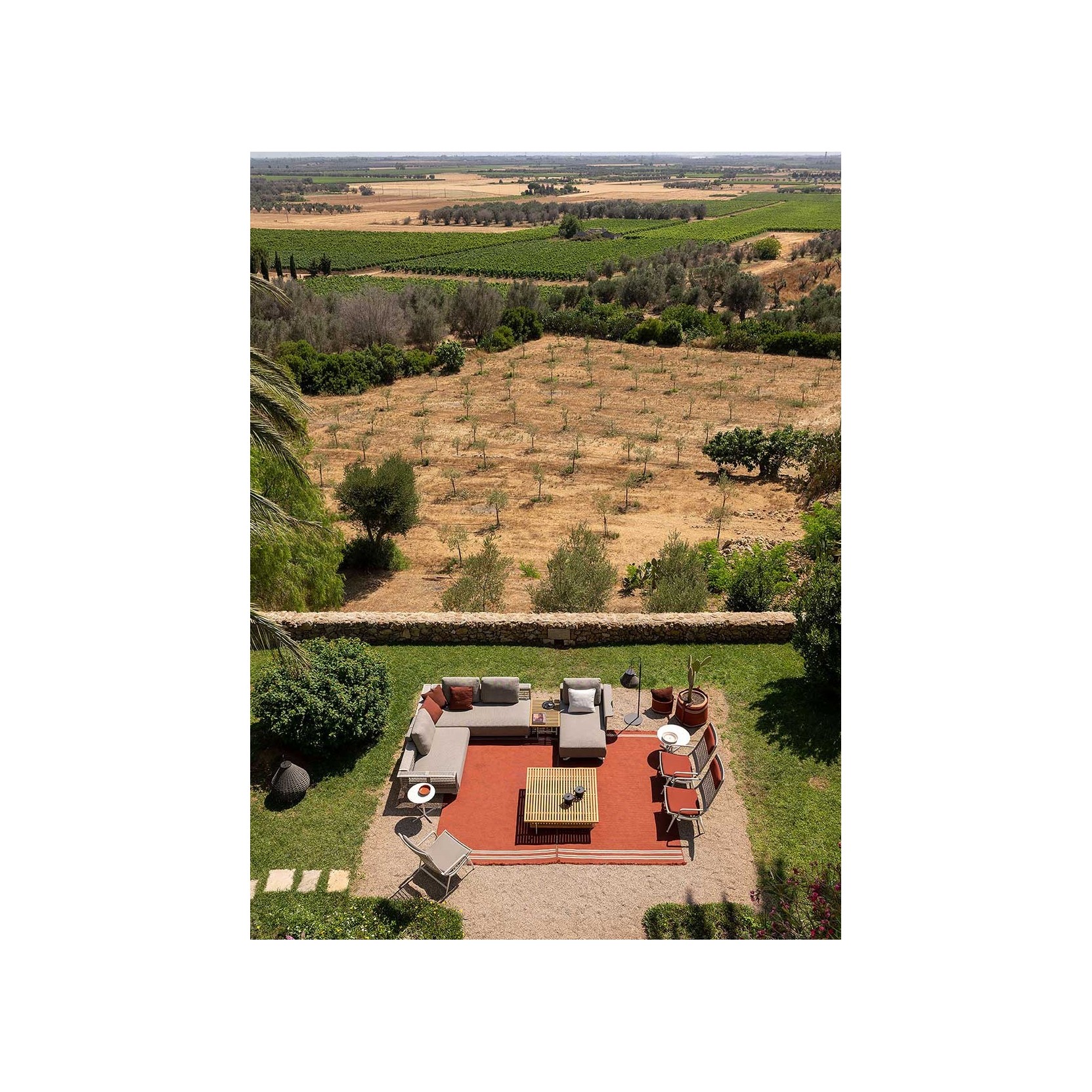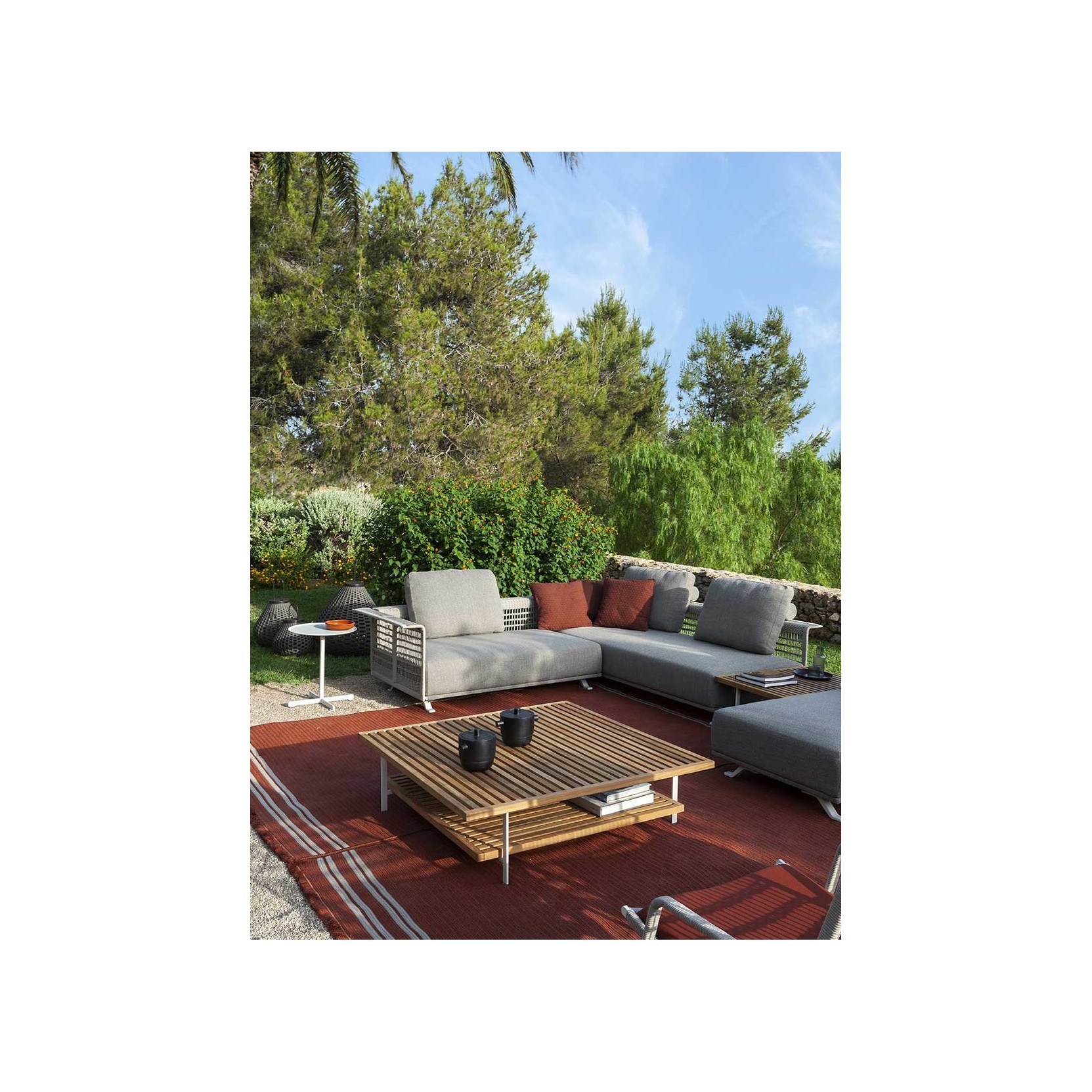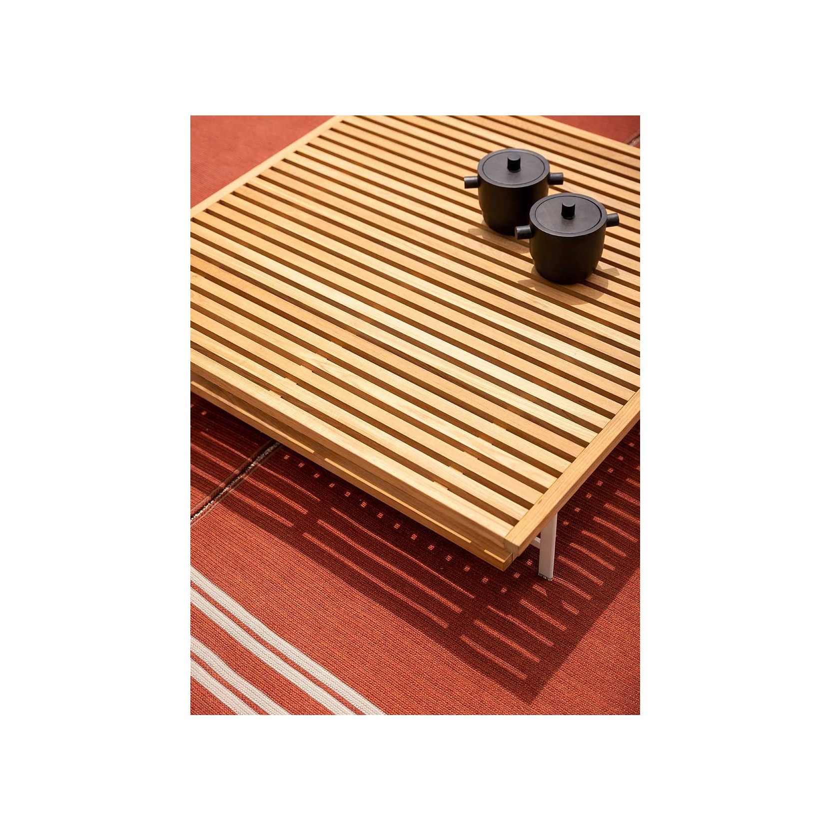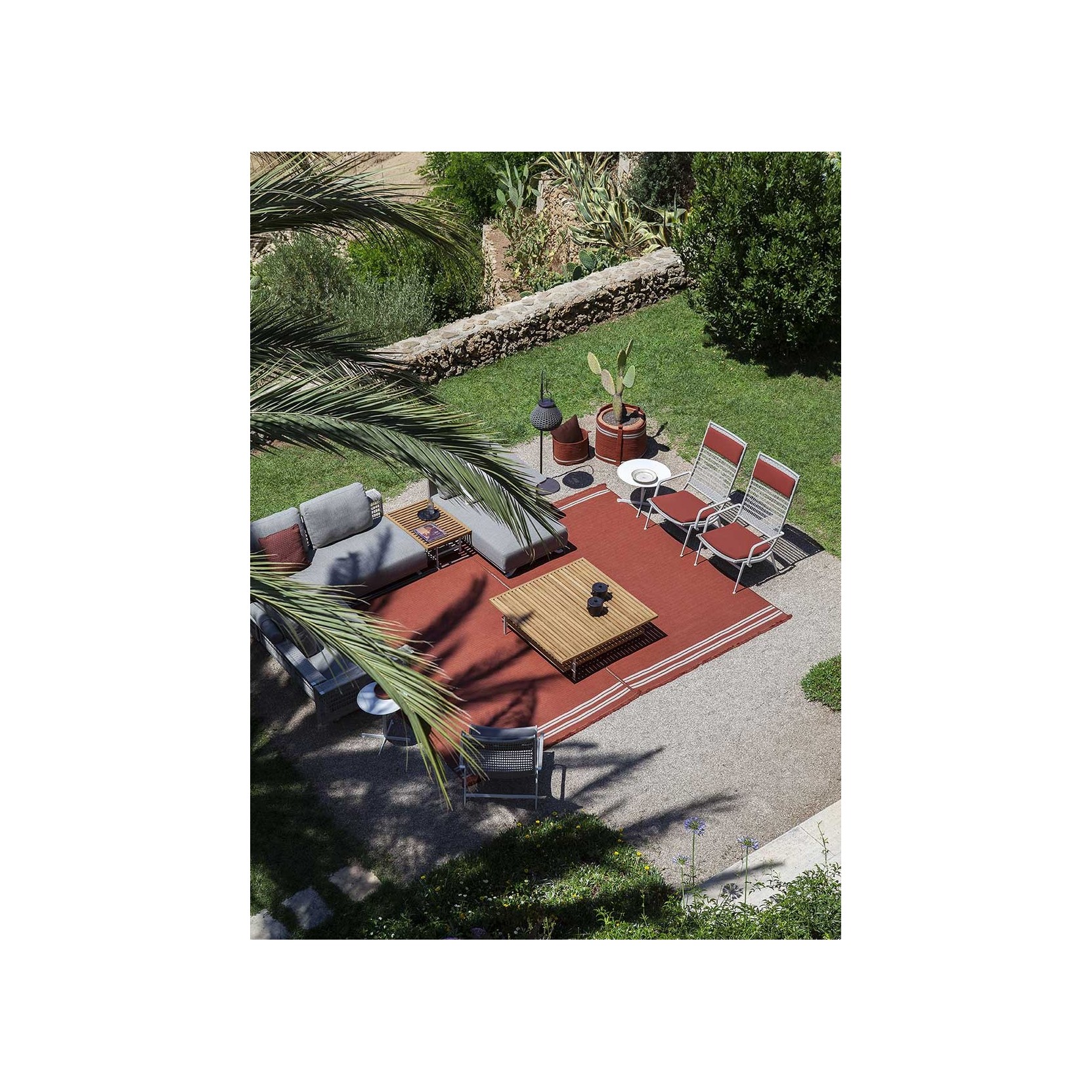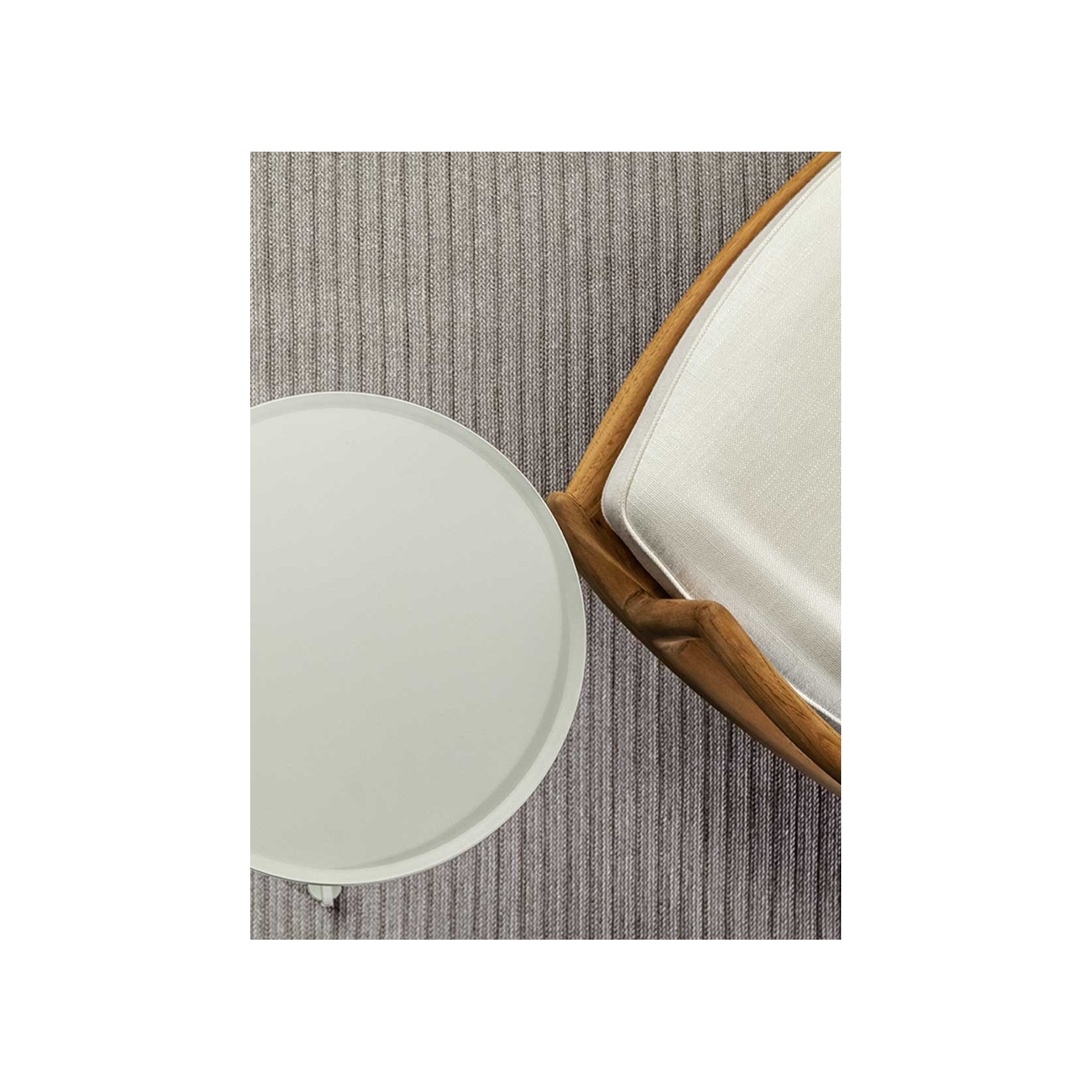The Sherazade rug by Poltrona Frau is available in two main sizes: 200x300 cm and 250x350 cm, with the option to create custom sizes up to a maximum of 18 sqm. The design size and proportions may vary depending on the chosen size. The rug is double-sided and comes in three color variants: Ecru with grey bands, Blue with beige bands, and Rust with beige bands. The crafting technique involves using rectangular braids sewn together in a parallel pattern. The braids are made of polypropylene fibers with a mélange yarn, giving the surface a striped appearance, which is accentuated at the ends by contrasting braids. The terminal edges feature a decorative fringe made of polypropylene. The overall thickness is approximately 7 mm, with a weight of 3 kg/sqm. The Poltrona Frau® logo is displayed on a fabric label near one corner. The rug is sustainably made in Italy. Routine maintenance involves frequent vacuuming or gentle brushing to avoid surface damage. Non-greasy stains can be cleaned with a mild detergent solution, while grease stains should be treated with acetone. The fabric should be washed in cold water and air-dried.
