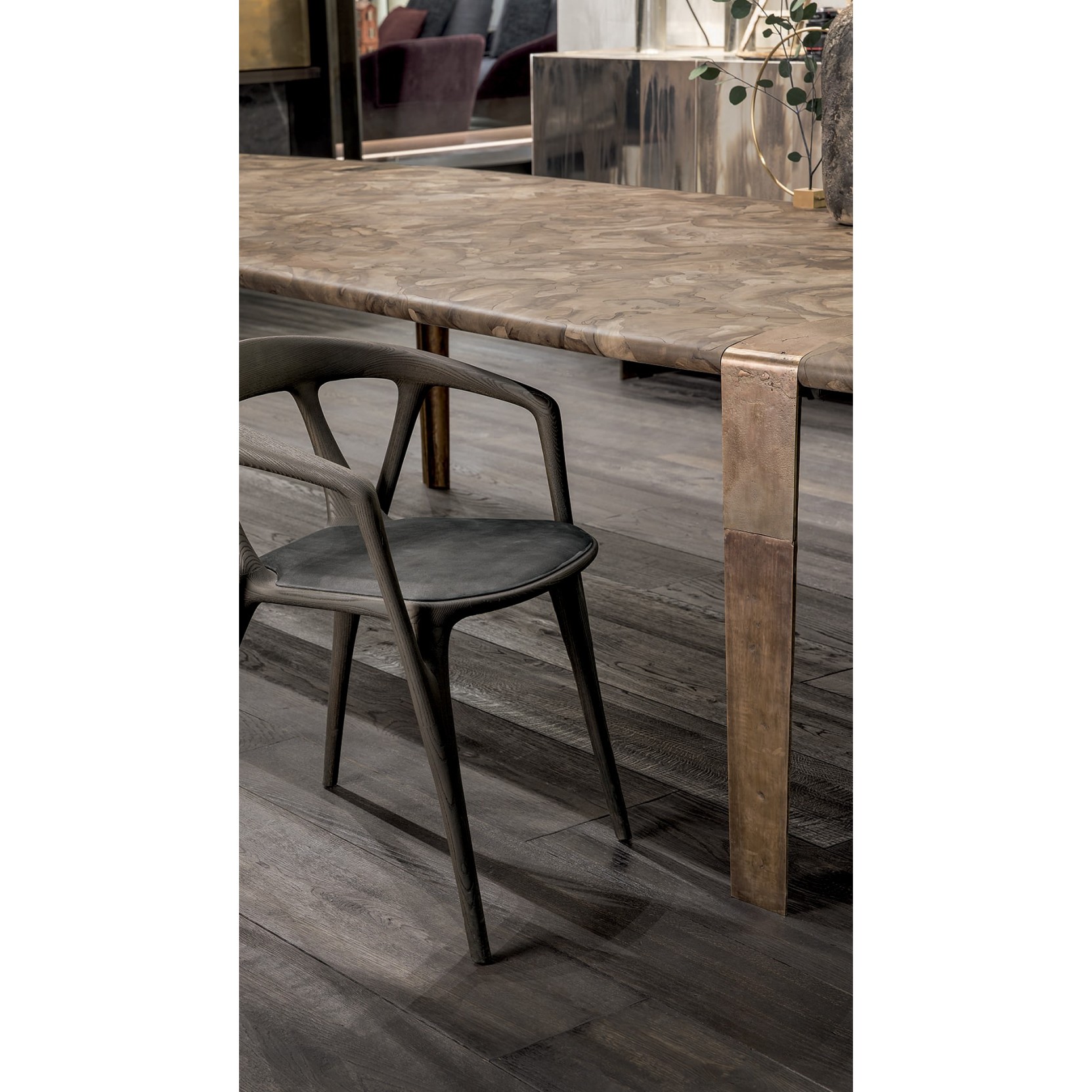 With its intriguing walnut wood fusion top in a micromosaic pattern, supported by slender legs in sand-cast bronze, it becomes one of the brand's most iconic pieces. The structure is made of black steel, and the legs are in Sand Cast Bronze, creating an elegant and refined design. The top is made of 6 cm-thick plywood with Forest Fusion or H-Piuma veneer. The dimensions vary, with options of 380x120x75h cm, 330x120x75h cm, 300x110x75h cm, 250x110x75h cm, 330x150x75h cm, 300x150x75h cm, and 250x150x75h cm.