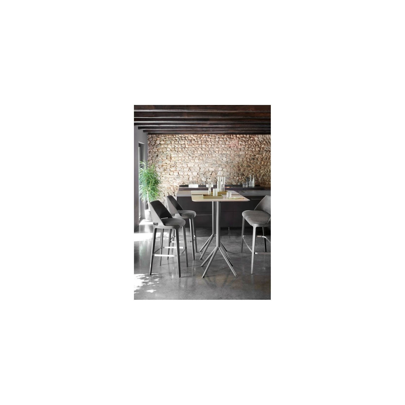 Designed to adapt to interiors as well as open spaces, Otx tables stand out for the three-dimensional square top in Hpl, which can be reclined vertically, and the central metal leg in two heights.