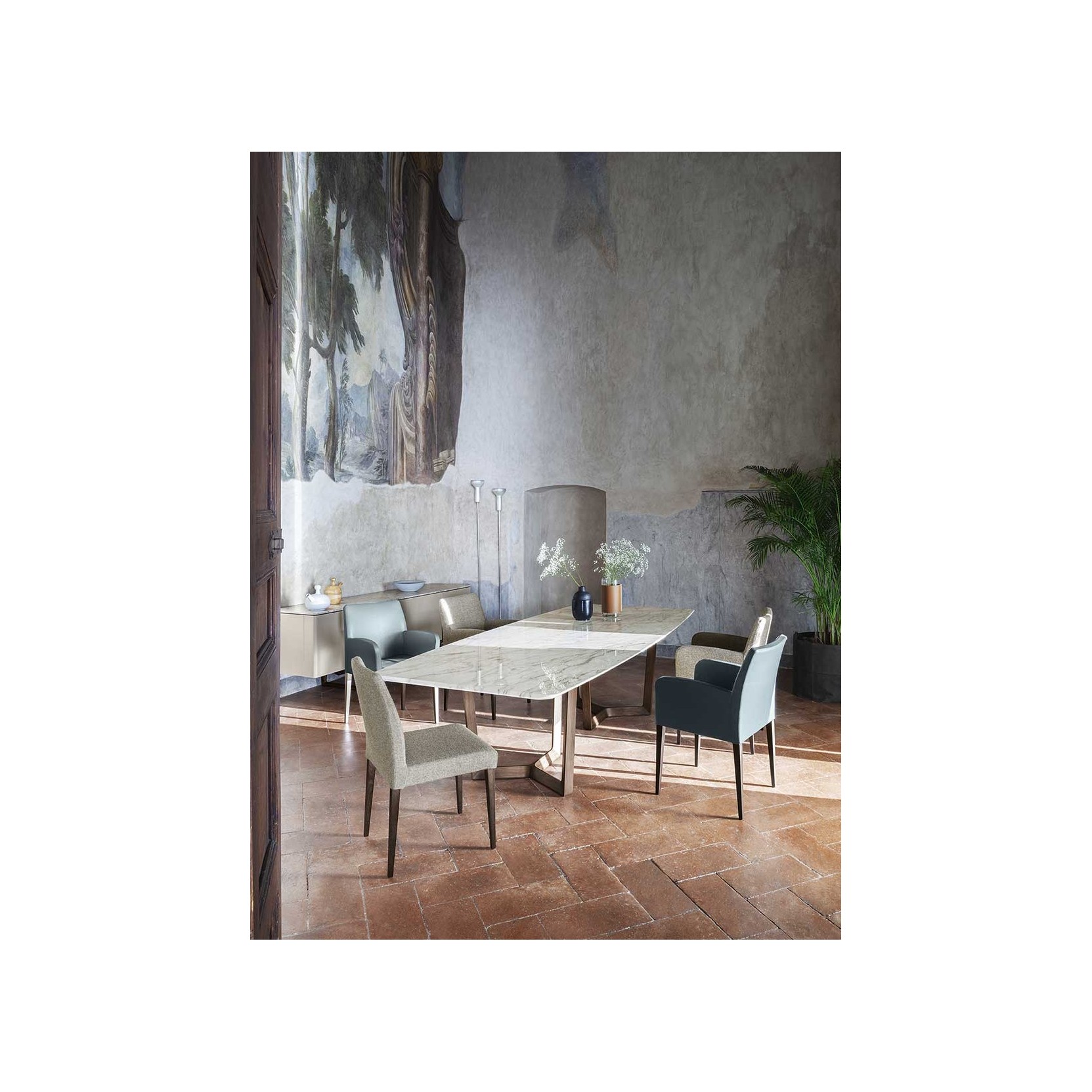 Roberto Lazzeroni’s table is inspired by the sensuality of Ravel's Bolero, creating a harmonious composition of elongated and suspended lines, which, despite the use of precious materials, conveys a sense of lightness and refinement.