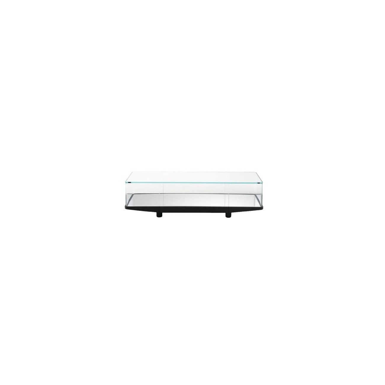 Collector is a coffee table container designed by Edward Barber & Jay Osgerby for Glas Italia, with sides and top in transparent extralight mm. 8 and base in solid ash or with mirror. Collector is a collection of coffee tables, display unit, display case and storage unit and sideboard with sides and top in transparent extralight 8 mm. glass. The sides are curved to fit the shape of the top, to which they are attached. A special and unique design characterizes this collection, the coffee tables Collector are available in two different sizes with the base finish solid open pore black lacquered ash, or with a flush recessed mirror.
