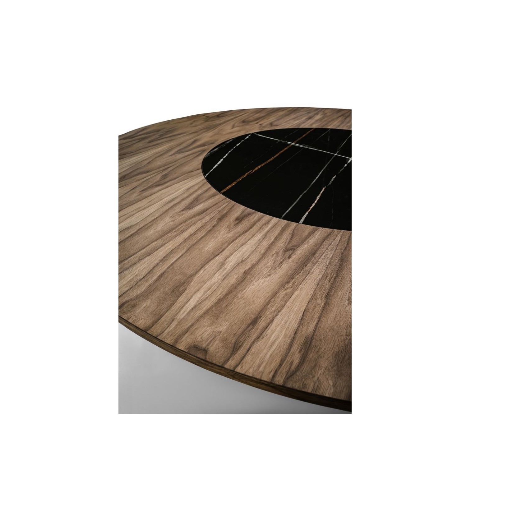 Round table made of blockboard top with solid wood edging and central marble insert, equipped with a Lazy Susan swivel system. The base, composed of strips of solid wood, symbolizes the symbol of infinity. Finishing: based on oil / natural wax of vegetable origin with pine extracts