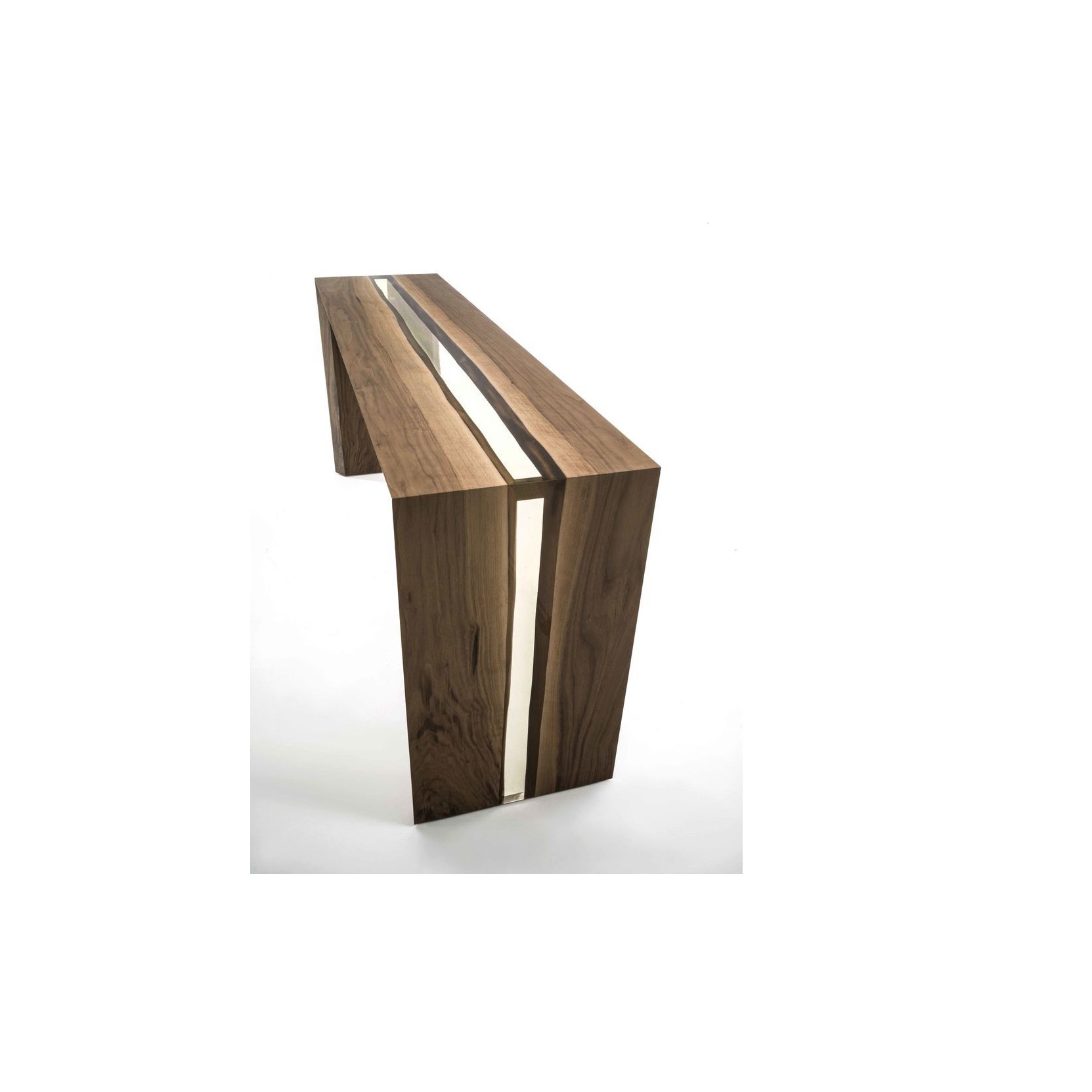 Console made of solid wood with internal natural sides, featured by a central space with transparent resin filling. Finishing: based on natural oil/wax of vegetable origin with pine extracts.