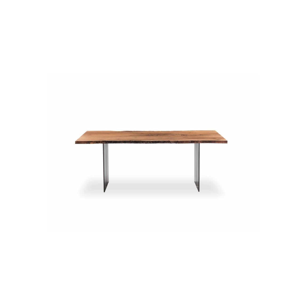 Table with top made of solid Briccola wood, disused poles from the Venetian Lagoon, characterised by boards placed side by side with natural edges. The base is composed of iron legs with a central gap.Finish: base of oil / natural wax of vegetable origin with pine extracts.