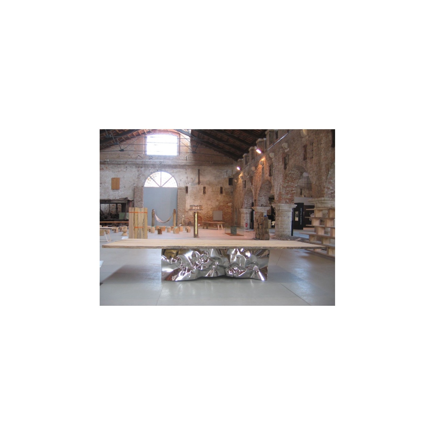 This work is the result of a fusion between, on the one hand, the briccole, for centuries the supporting structures of the city of Venice, weathered and scored by its history, and, on the other hand, steel whose sheen represents the gleam of the waters of the Lagoon, a witness to the passage and rhythm of life with its ships, its people and its culture. The base of the table is made of mirror-finished stainless steel with a polished surface on one side representing still water and with the other side moulded to reproduce the effect of water in motion. Resting on this are planks made out of the briccole, which preserve their original form shaped by the history of Venice itself.