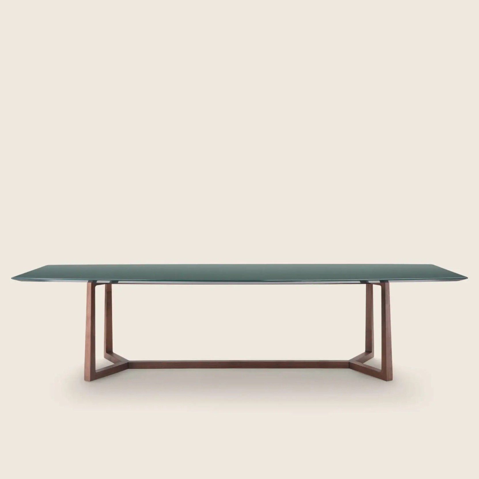 The Gipsy table features an elegant solid wood base offered in a wide range of finishes, with square-section legs that meet the floor in a refined interplay of geometric forms that highlight the material beauty of wood. The top, available in high-gloss lacquer or back-painted glass, is presented in a sophisticated palette of shades and stands out for its distinctive design—sharp at the table ends and gently rounded along the long sides—creating a perfect balance between precision and softness. Selected models are also available with glossy glass tops in silk white, coffee, grey, and black, offering further stylistic versatility.