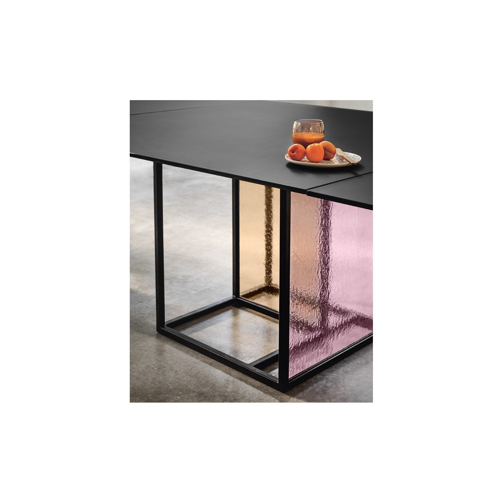 Fixed or extendible table with metal painted base, opaque black finish, where two 6 mm thick fused and tempered glasses are placed, available with striped texture or with embossed texture. Top in 12 or 15 mm tempered glass available in: back-lacquered glass with monochrome shade; acid-etched and back-lacquered glass with metal shades; glass hand-finished with Ecomalta, finer-grained texture finish.