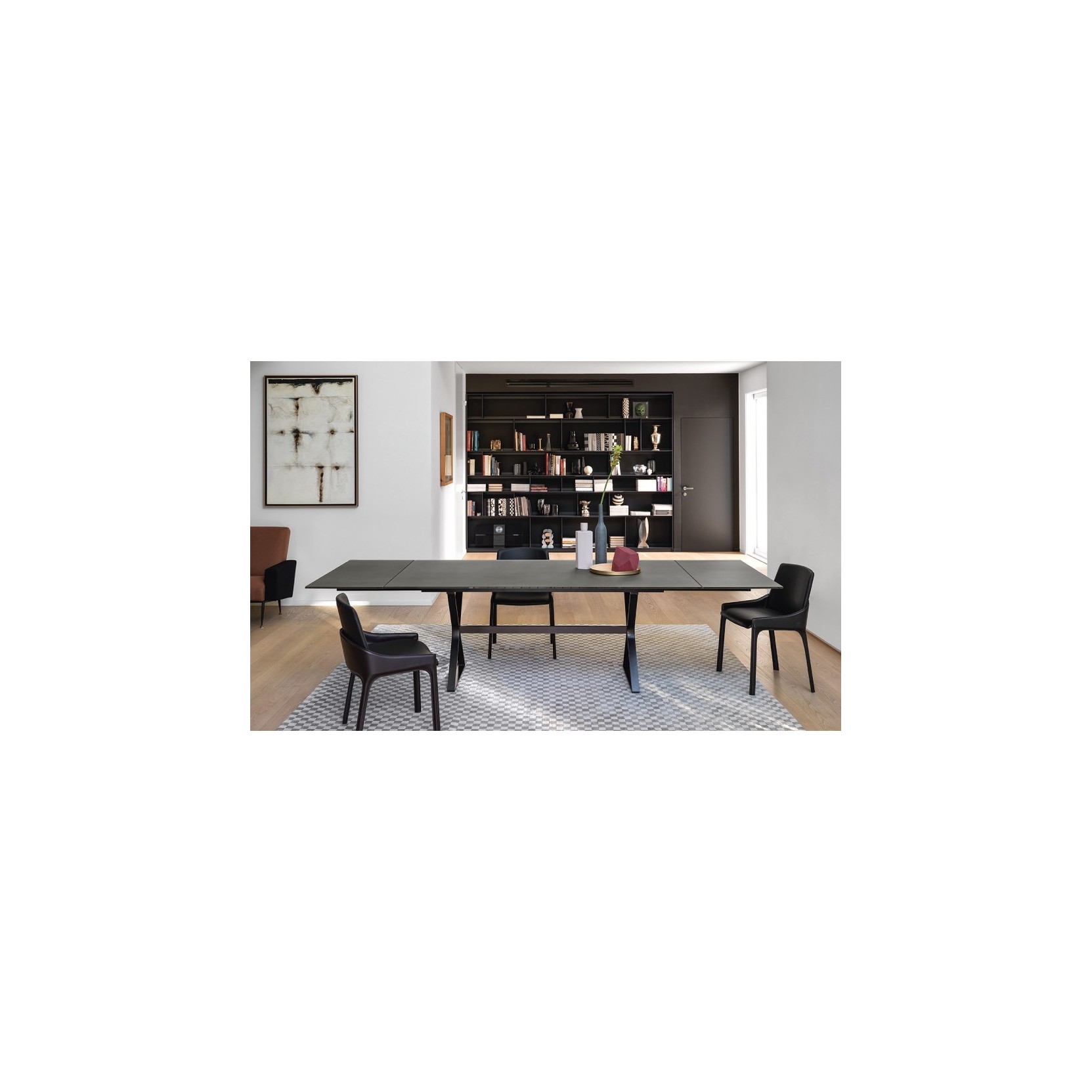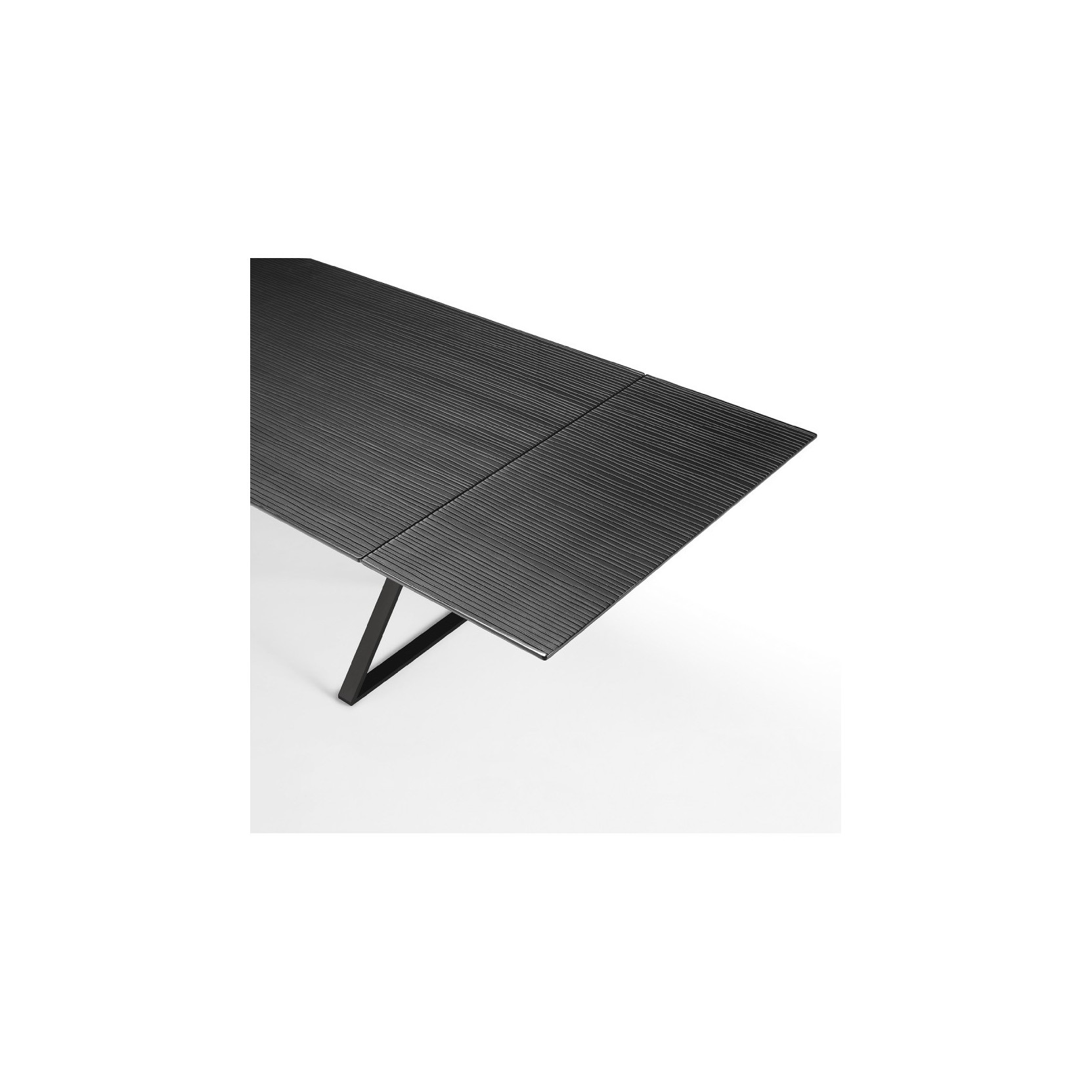 Table with metal painted base, “Lava Grey” finish. Top available in 12 or 15 mm high temperature melted glass, back-lacquered with metal shades, or transparent or extralight glass back-lacquered with monochrome shade or with a textured effect.