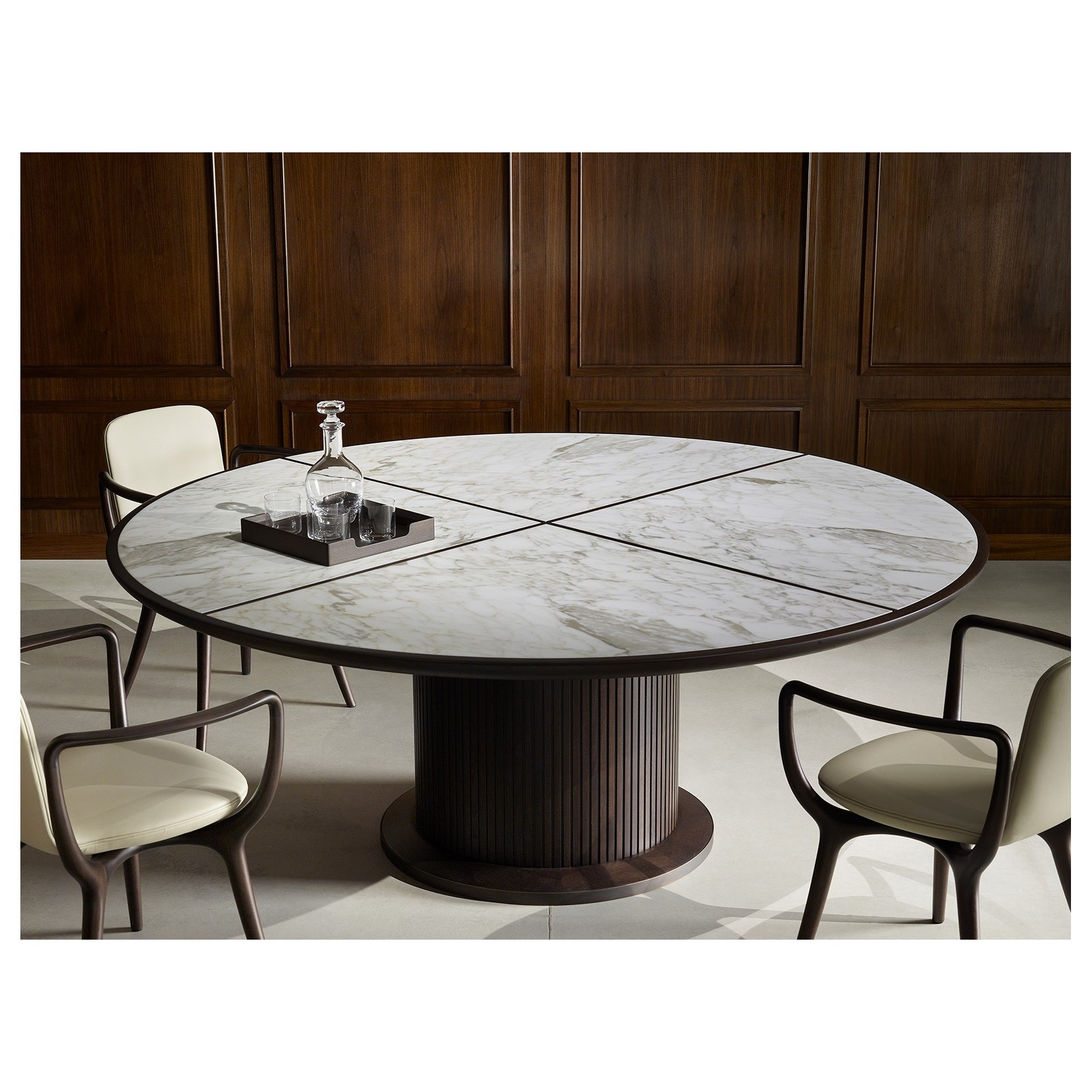 The round version of Full can also be completed with the elegant and functional Lazy Susan – a rotating tray with a diameter of 90 or 120 cm, made in solid walnut – perfect for enhancing the table’s convivial use without compromising its visual harmony.