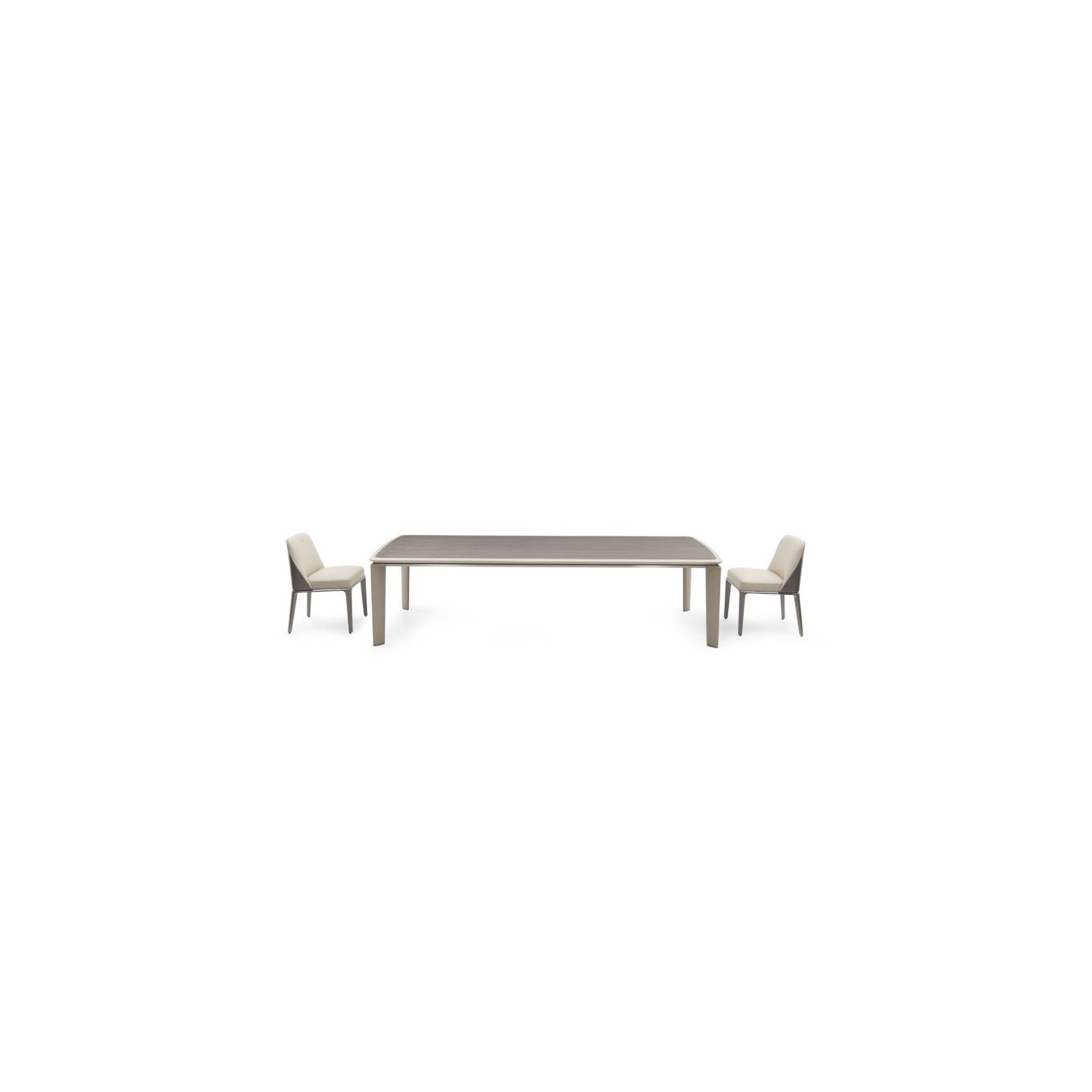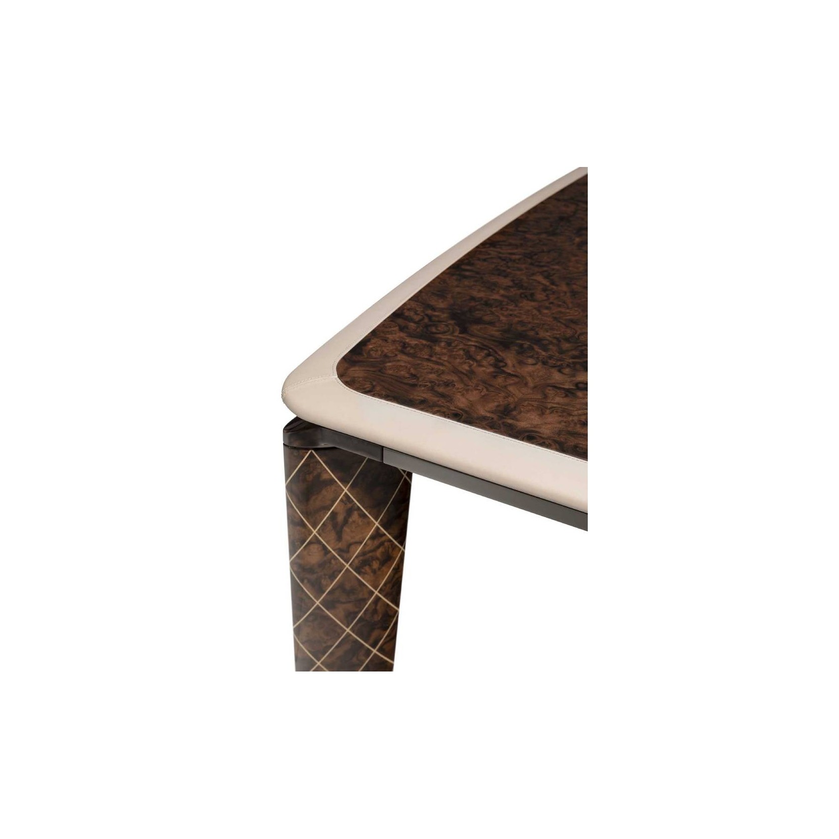 The elegant, linear Sherwood table is embellished with steel details in gun-metal finish. The top made of wood features a shaped edge covered in Vermont leather. The legs coordinated with the top (optional) are skilfully worked in white maple diamond marquetry, an explicit reference to the Bentley codes.