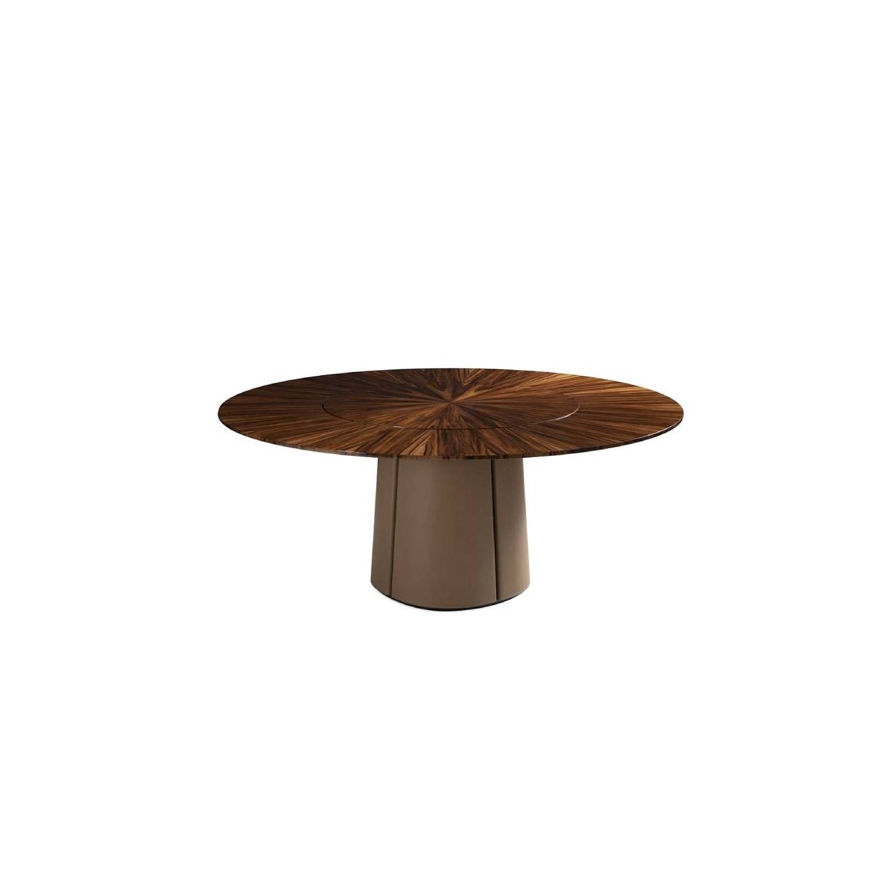 A radial patterned grain characterises the exclusive Smoked Liquidambar finishing of the Whitby table, also available in Warm Grey Fiddleback Sycamore, Toffee Brown Smoked Larch or Burr Walnut briar-root. Optional built-in Lazy Susan featuring wood, design and finishing coordinated with the top.