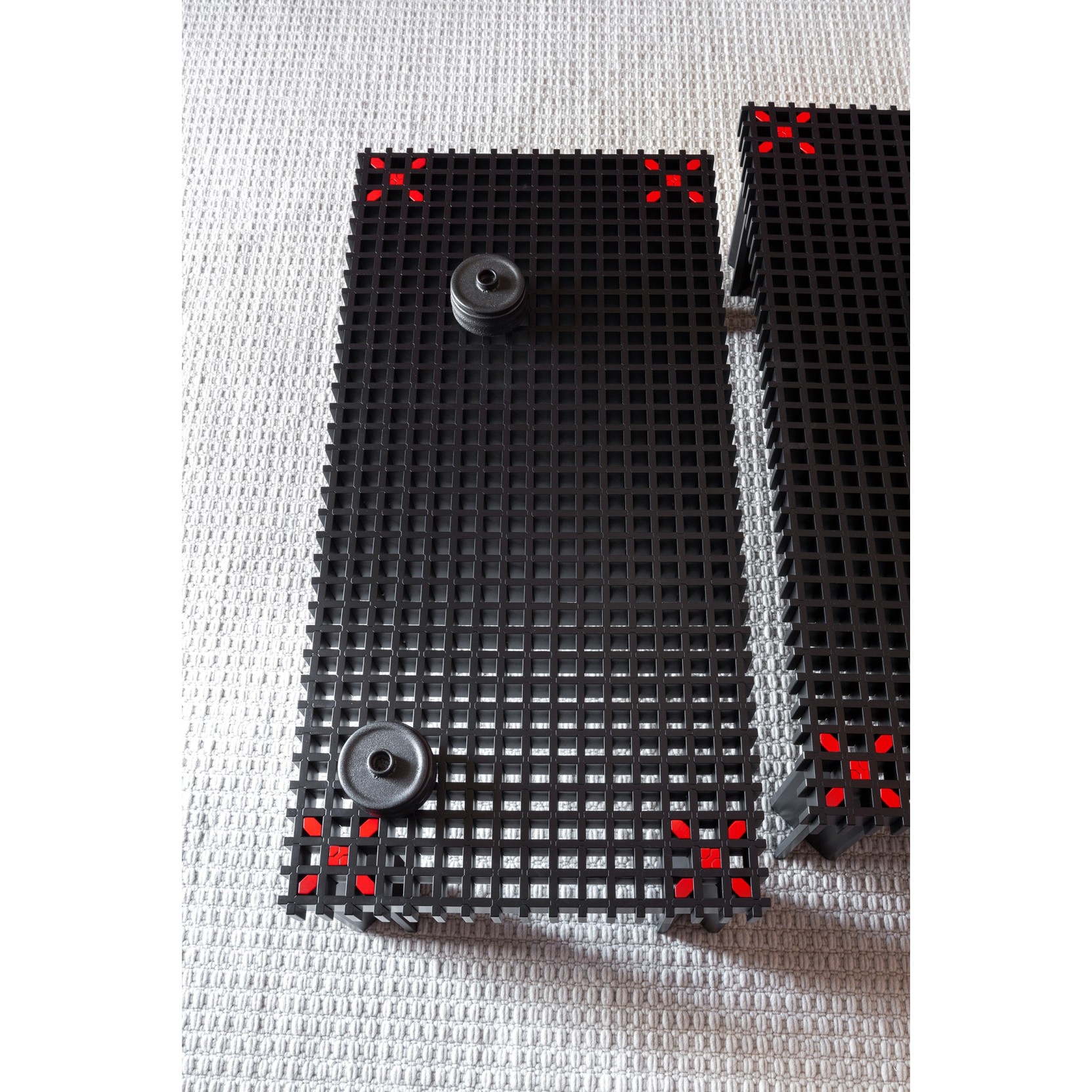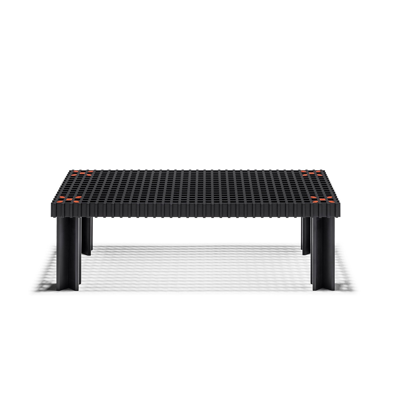 The Kyoto table is available in two sizes: 102x102 cm with a height of 32 cm and 102x49 cm with the same height. The structure, top, and legs are crafted from extra light solid beech wood and offered in two finishes. The first version features natural extra light beech wood with solid Canaletto walnut inserts at the ends of the boards of both the top and legs. The second variant is finished in matt black lacquer (RAL 9005) with red lacquered inserts (RAL 3002) at the ends of the boards. The wooden slats are joined using 45° dovetail joints, forming a refined square pattern. All surfaces are protected by a transparent matt varnish. The legs, designed with a distinctive cross structure, can be easily removed and repositioned as desired. A unique detail is the laser engraving of the Poltrona Frau logo and the designer’s signature on one of the faces of the leg supports.