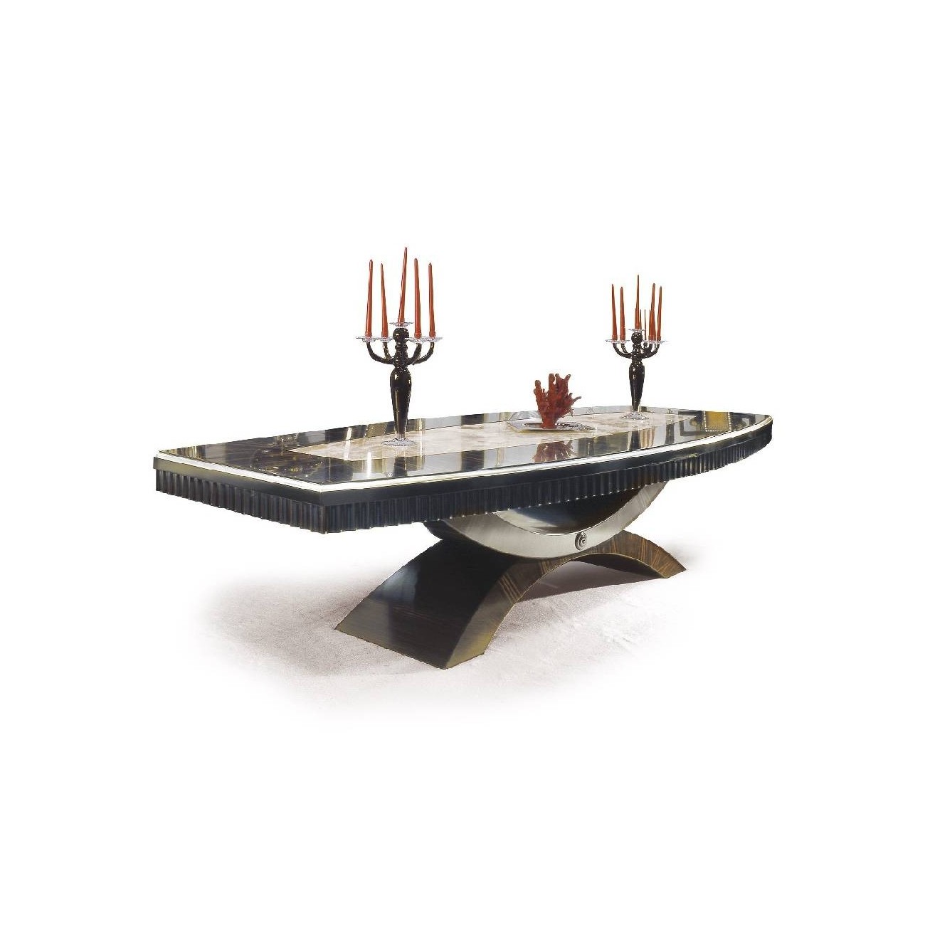 ‘CALICE’ DINING TABLE, WITH BACKLIGHT ONYX TOP-EBONY MAKASSAR DINING TABLE, LACQUERED DETAILS AND SOLVER LEAF, BACKLIT HONEY ONYX TOP, EBONY MAKASSAR AND POLISHED STAINLESS STEEL BASE