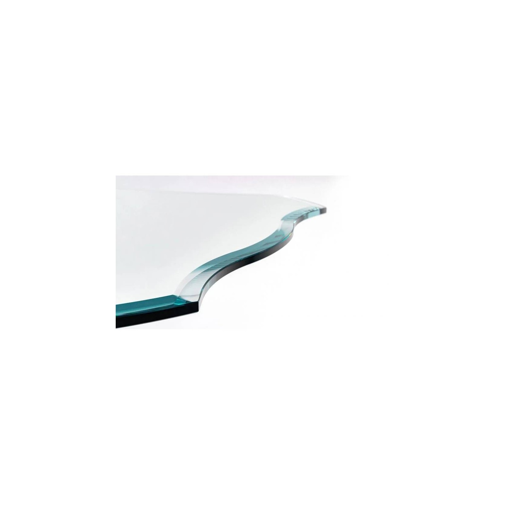 Dining table with legs made of various elements in engraved crystal on a plinth in extra clear mirror glass. Top in extra clear glass 19mm thick with shaped sides. LED lighting in each leg with rechargeable battery. Can be made in various sizes and shapes, up to 6 meters long.