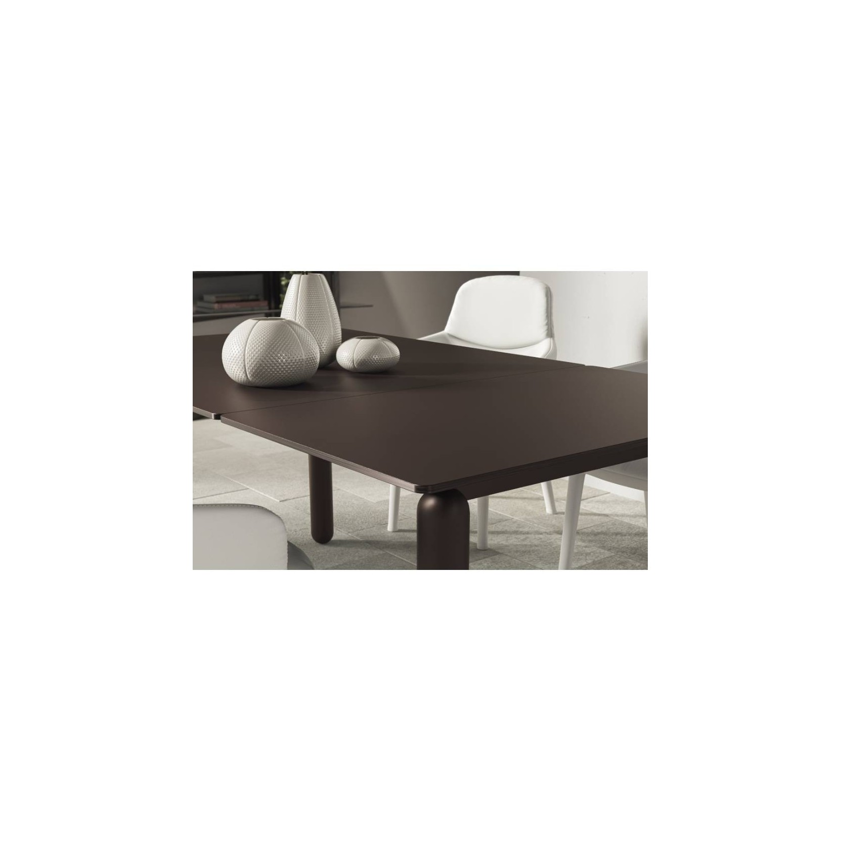 Virgola is a dining table designed by Claudio Bellini to respond to the multifunctional needs of the contemporary home. Thanks to its extendable function, the project is characterized by flexibility and functionality, without sacrificing the value of contemporary design. With a light and refined look, the Virgola table is available in the light grey and dark brown versions, with a painted metal structure and top made of single-colour FENIX: an innovative, high-performance material. The laminate extension is in marble shade for the light grey version and in stone shade for the dark brown version..