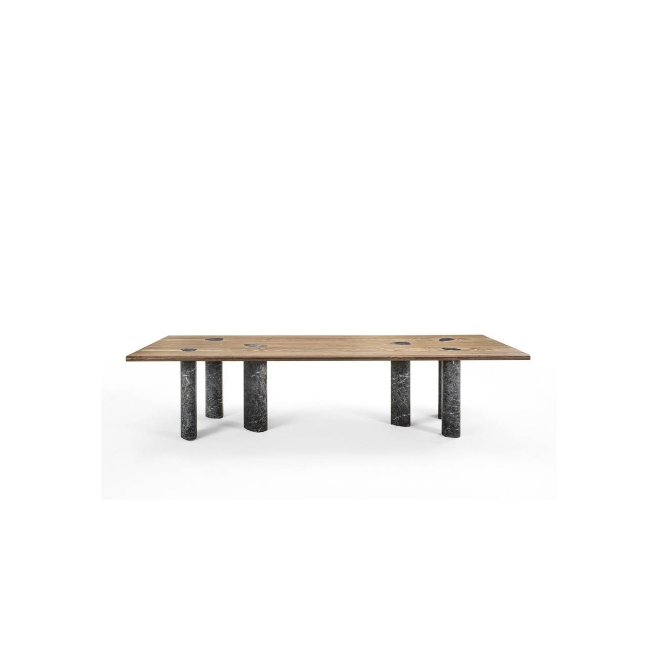 Dining table with canaletta walnut top, shaped edges in solid wood and marble legs. The top features marble inserts in the same finish as the legs, in the same position of the legs themselves.