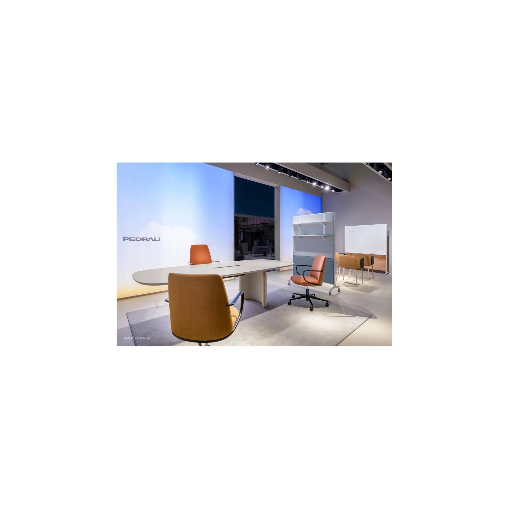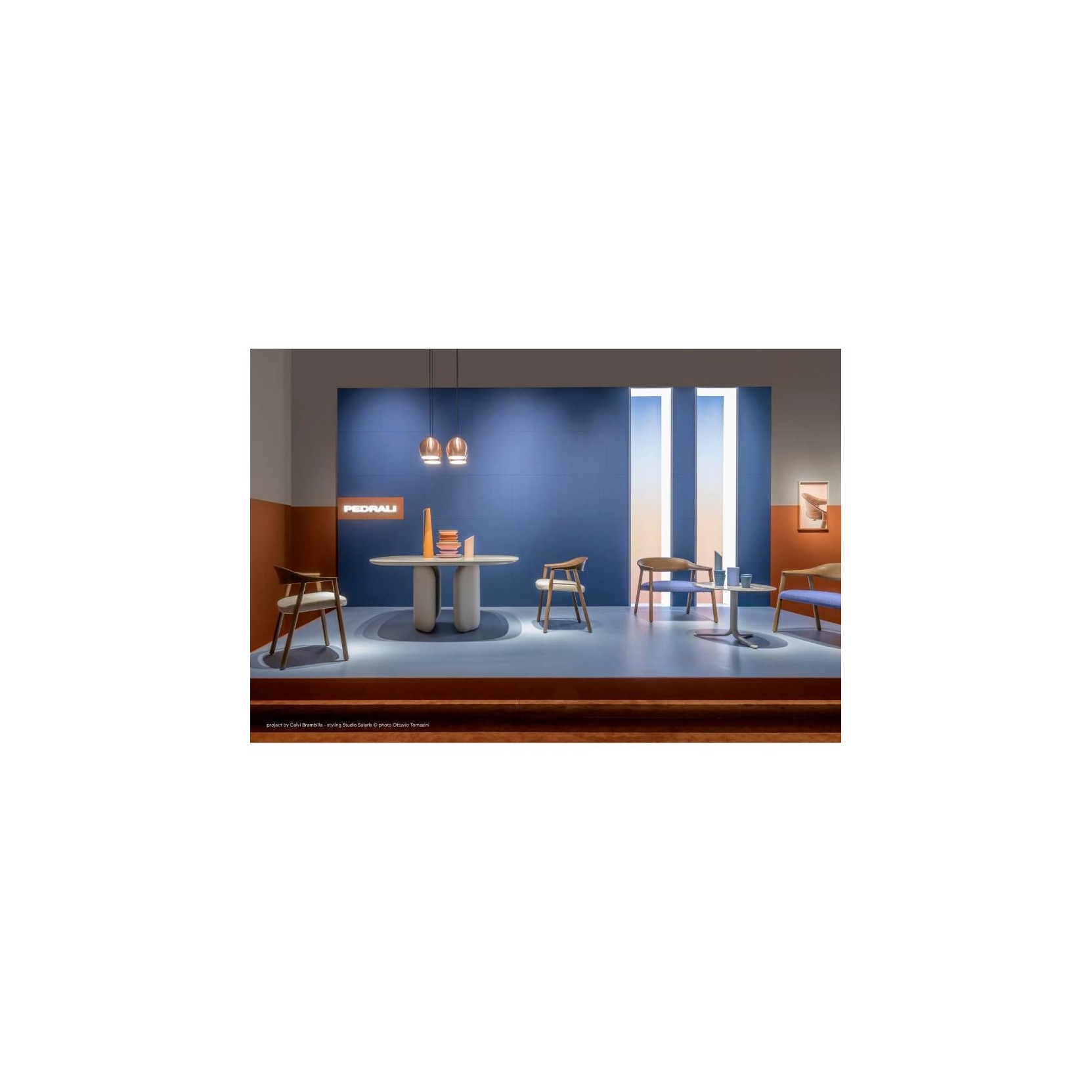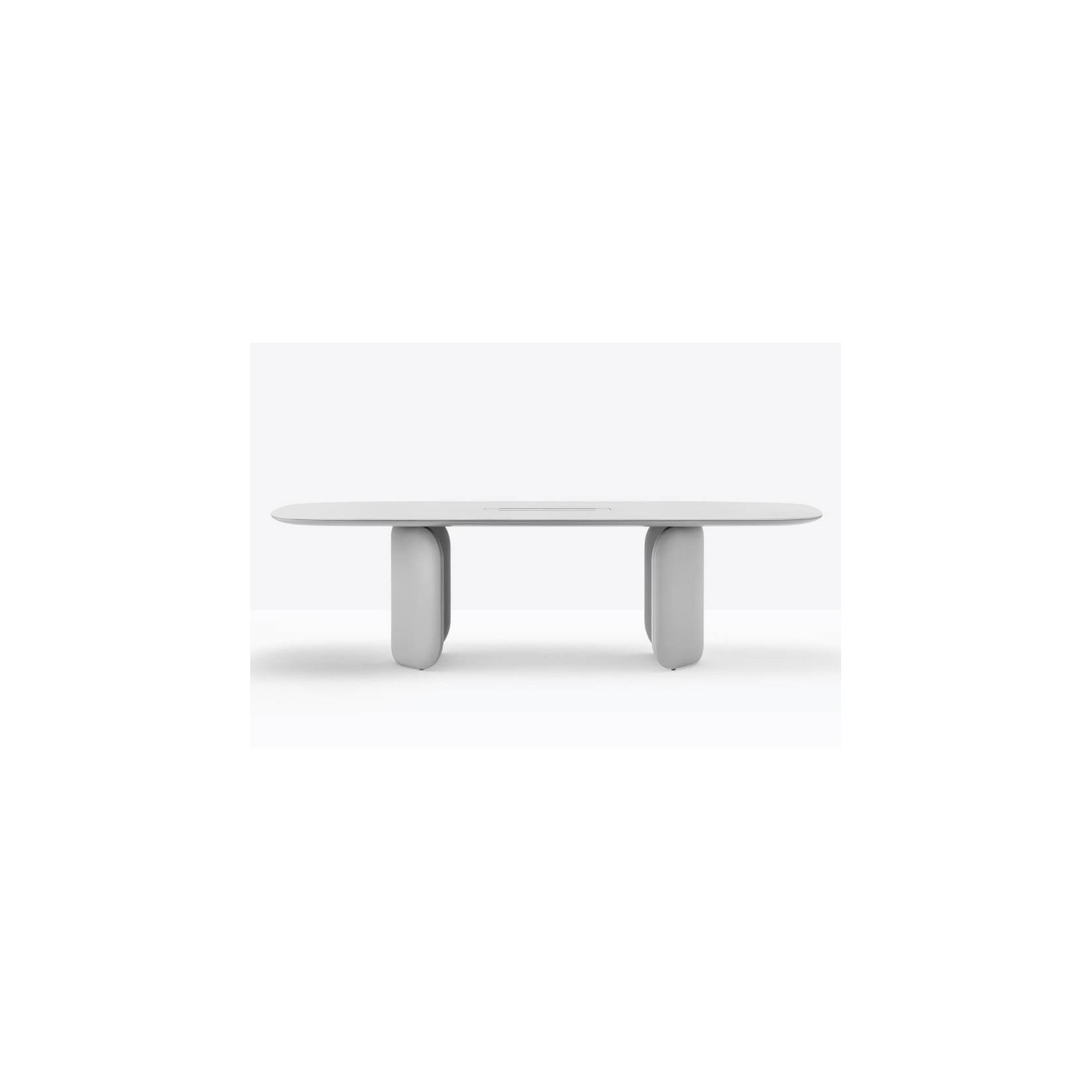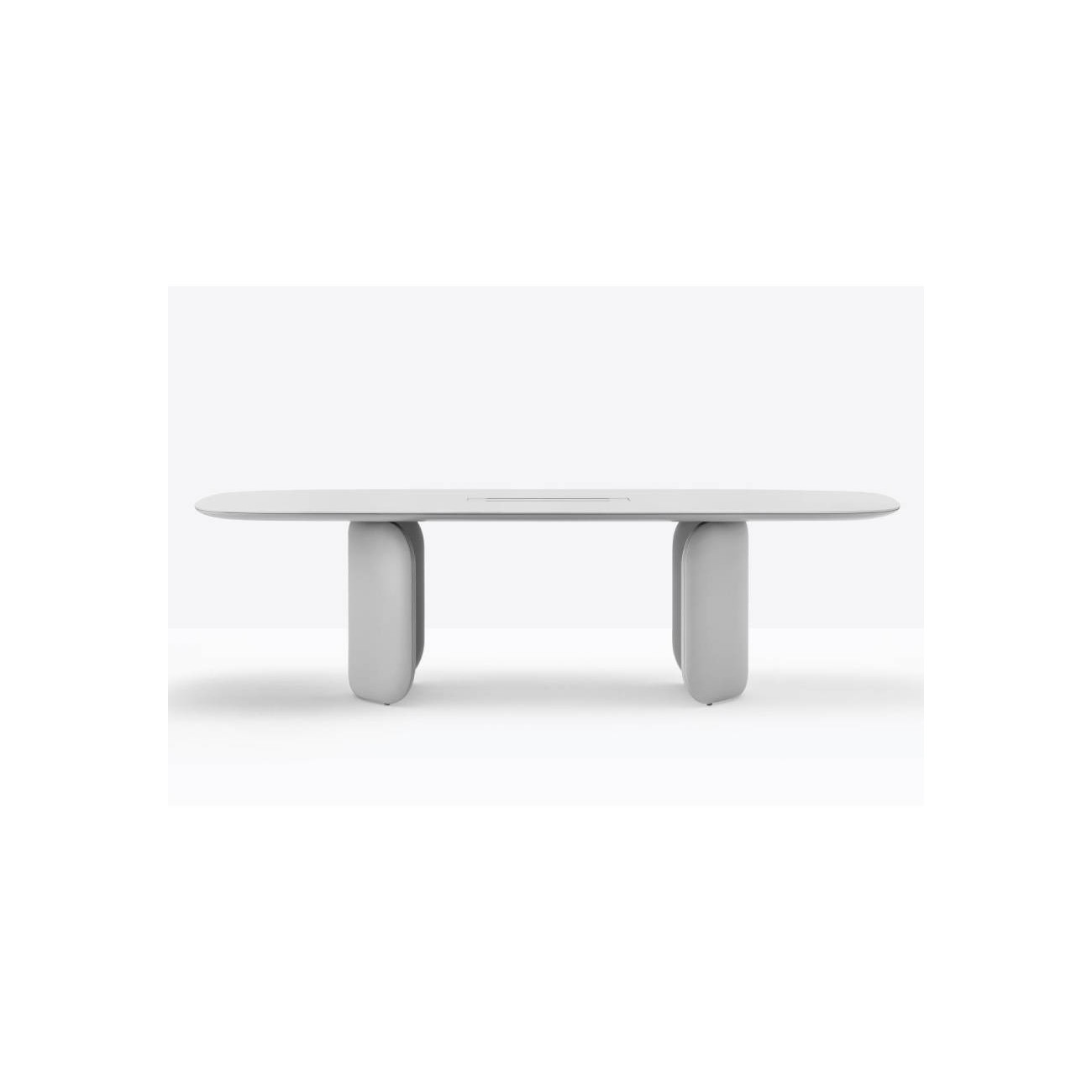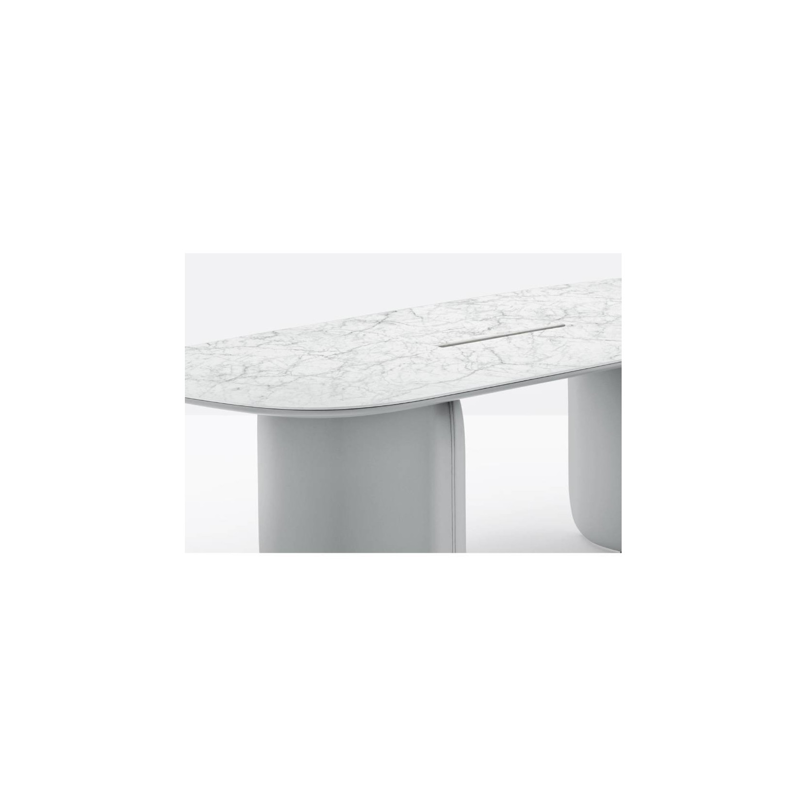 The Elinor table collection, with its soft and curving lines, conveys a refined yet contemporary image. The base is formed of two moulded elements of fixed dimensions, made from rigid polyurethane foam and upholstered in genuine leather; they support a square table top in ultra-thin 6mm solid laminate with cable access and a rounded lacquered MDF support beneath it which conceals the steel structure. The two elements of the base are arranged symmetrically. Available in two layouts that allow different aesthetic results: they can be positioned in a way that recalls closed or open brackets.