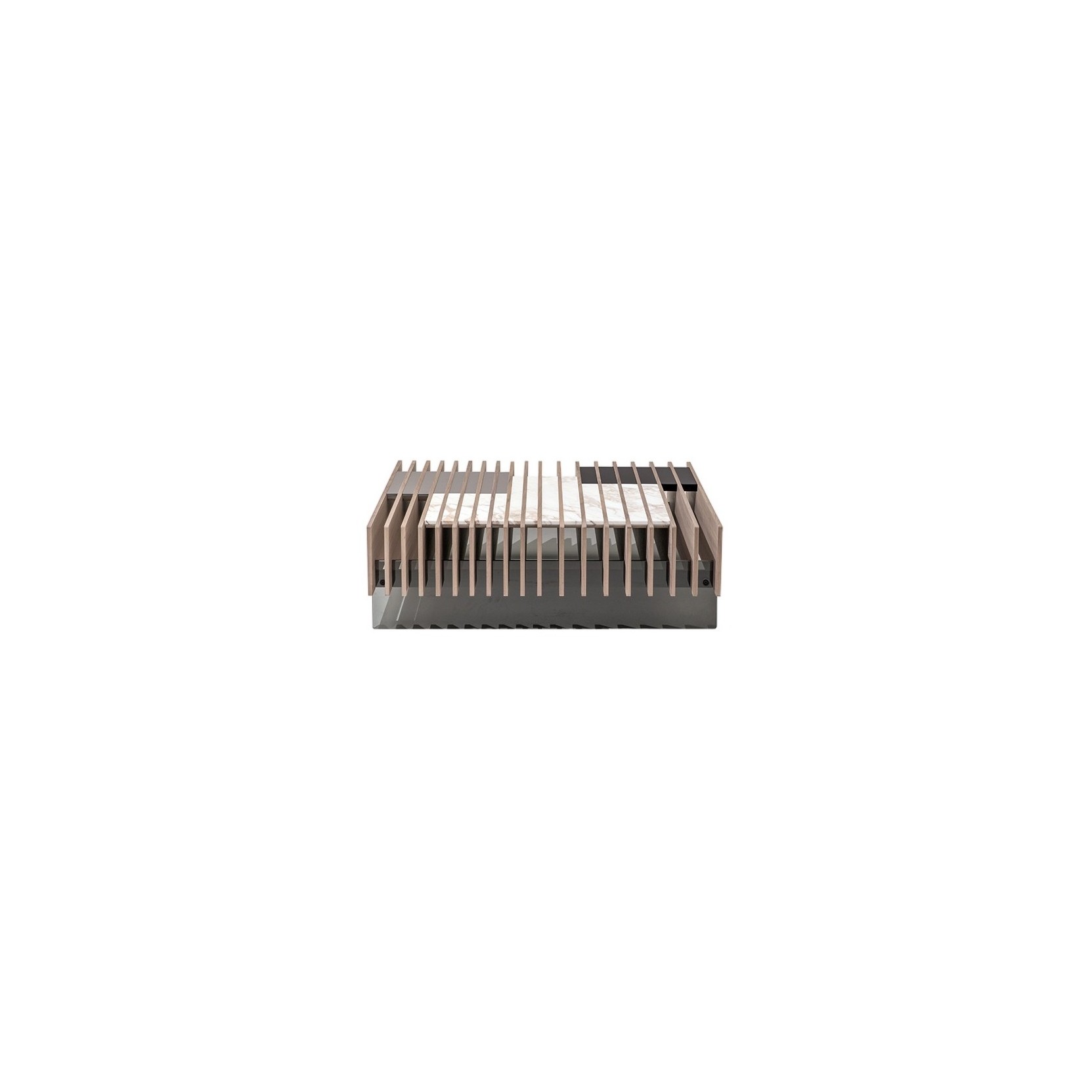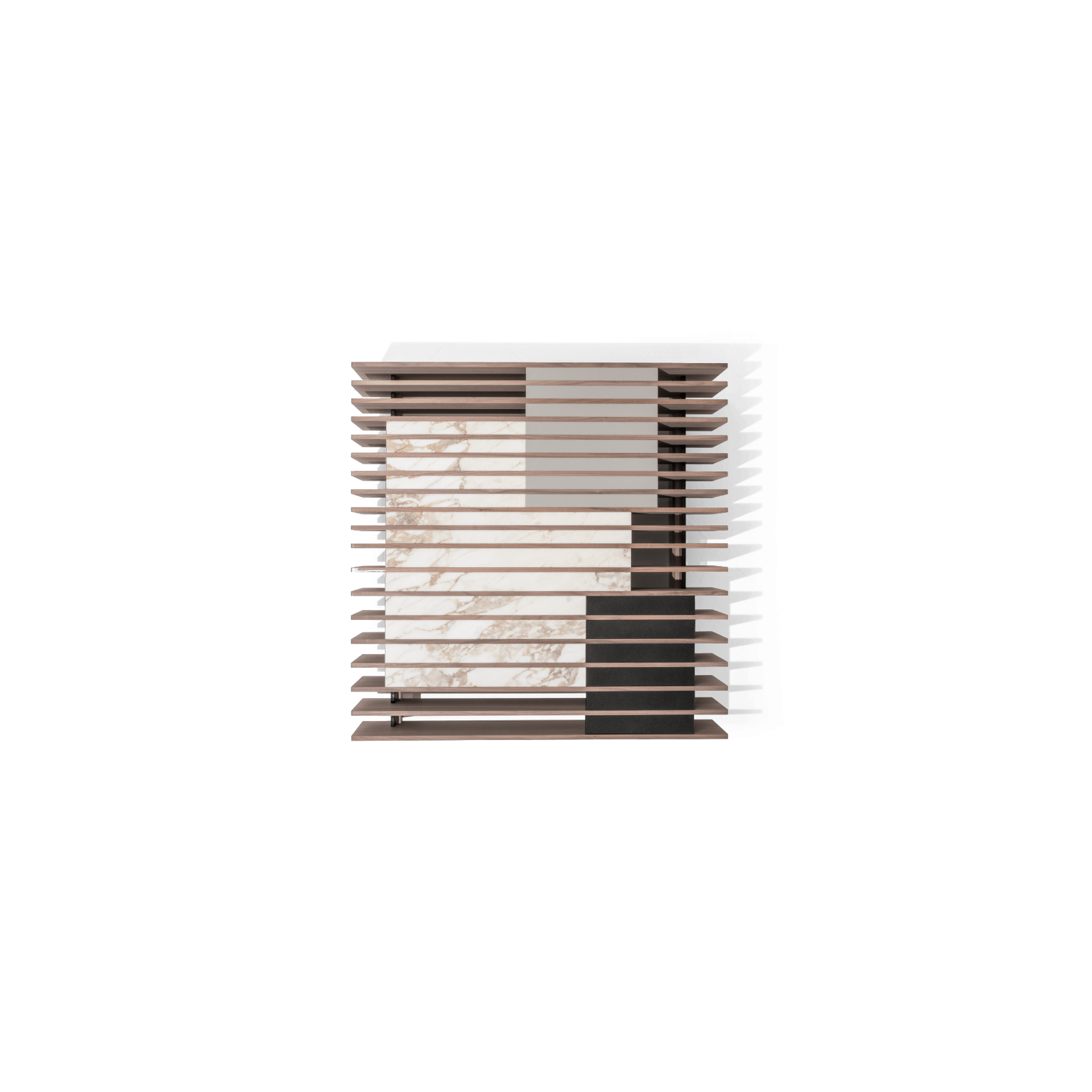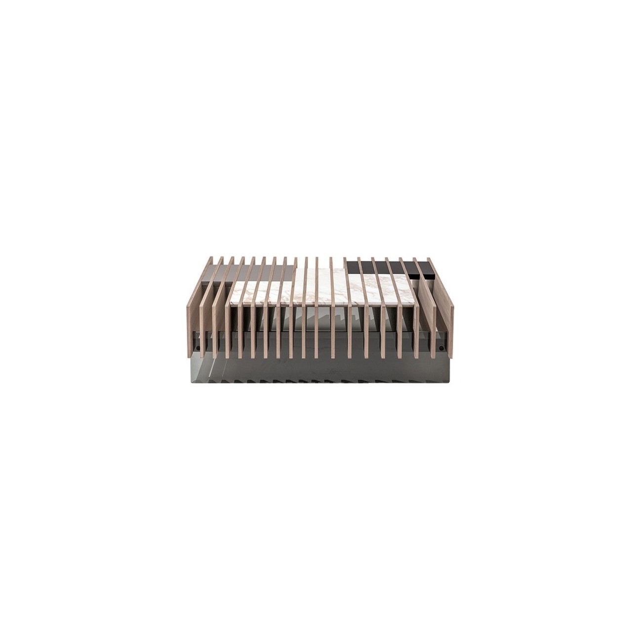 The slats in solid canaletto walnut interact with the tempered grey glass base, creating a refined visual contrast. Three decorative inserts, available in marble or painted metal, complete the piece with a distinctive tactile touch.