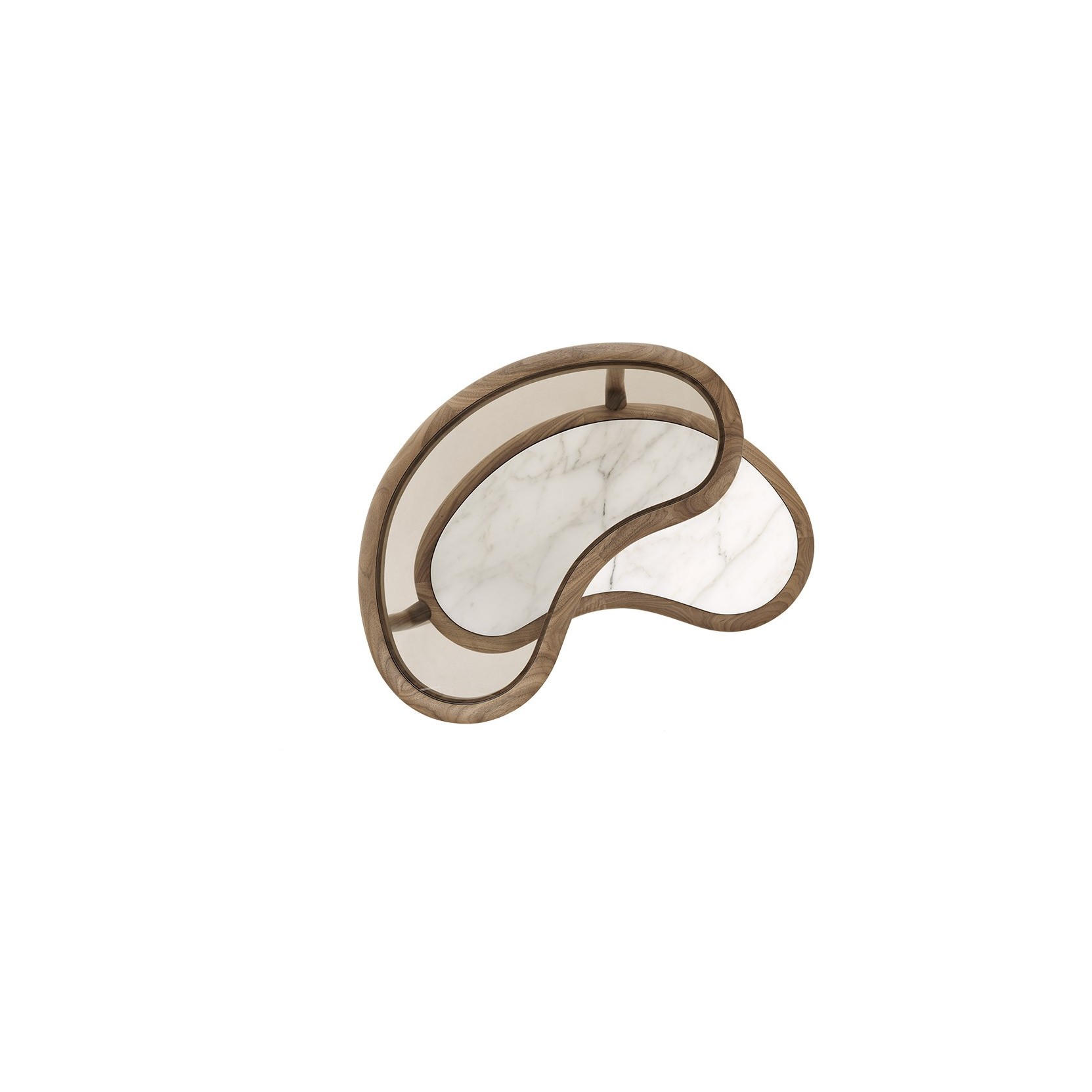 Both decorative and functional, Fagiolo is the small table designed by Roberto Lazzeroni in 2014 as part of the “Saturn and Sons” reading corner, alongside the Saturn armchair and the Lampo lamp. Conceived for a space devoted to rest and reflection, Fagiolo stands out for its organic, soft shape and dual-surface design. Its name, inspired by the bean-like form of the two overlapping tops, reflects its playful yet refined essence.