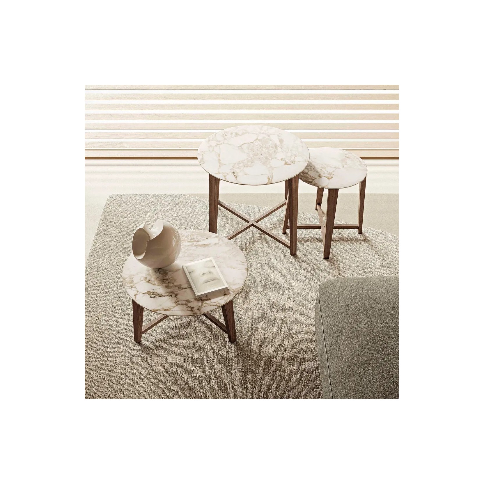 Crafted in solid iroko wood and offered in a wide selection of finishes – natural, grey-stained, brown-stained or white lacquered – the structure is defined by four tapered legs that intersect at the base to form a cross-shaped detail. The round tabletop, softened by a beveled edge, can be crafted in the same wood as the base or in elegant marble, lending a touch of sophistication. Available in four different sizes, Tris tables can be used individually or arranged in overlapping compositions, pairing seamlessly with any of the outdoor seating pieces from the Flexform collection. To preserve their original appearance and ensure durability, the use of the dedicated waterproof cover is strongly recommended; available upon request with an additional charge.