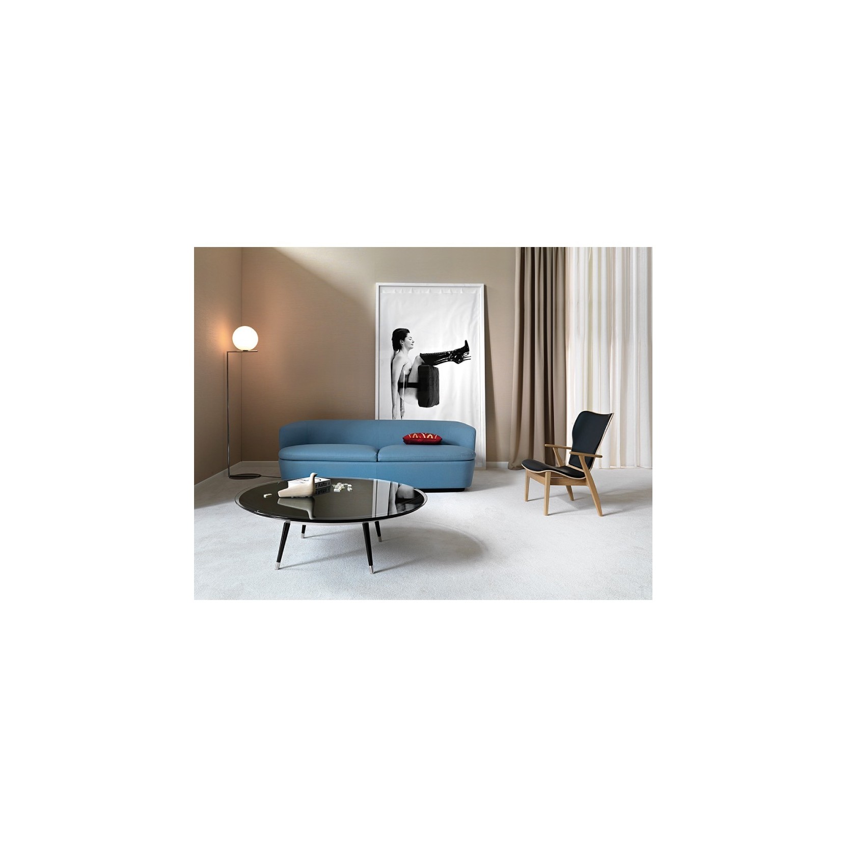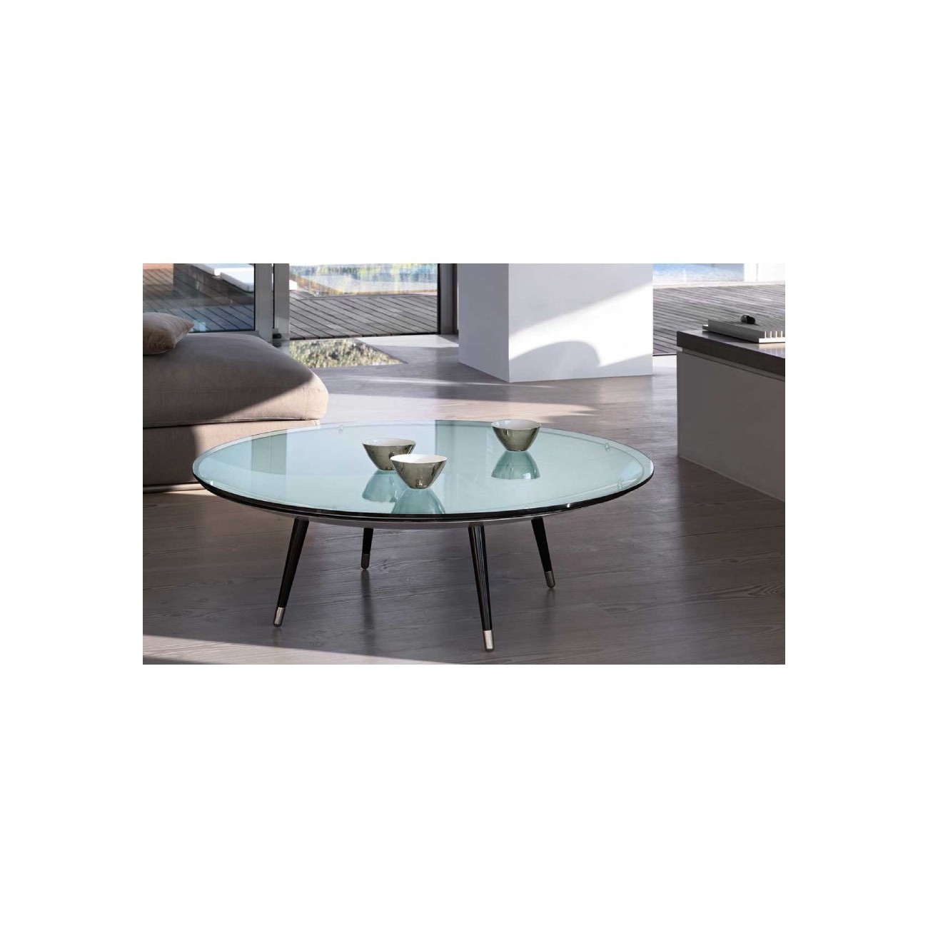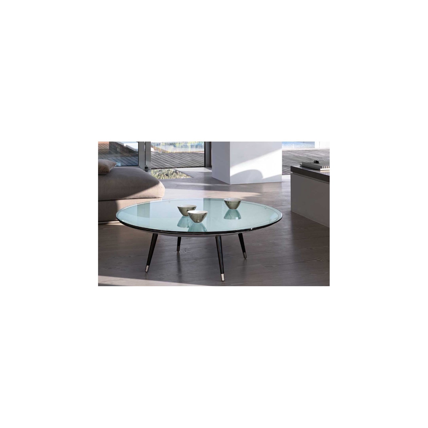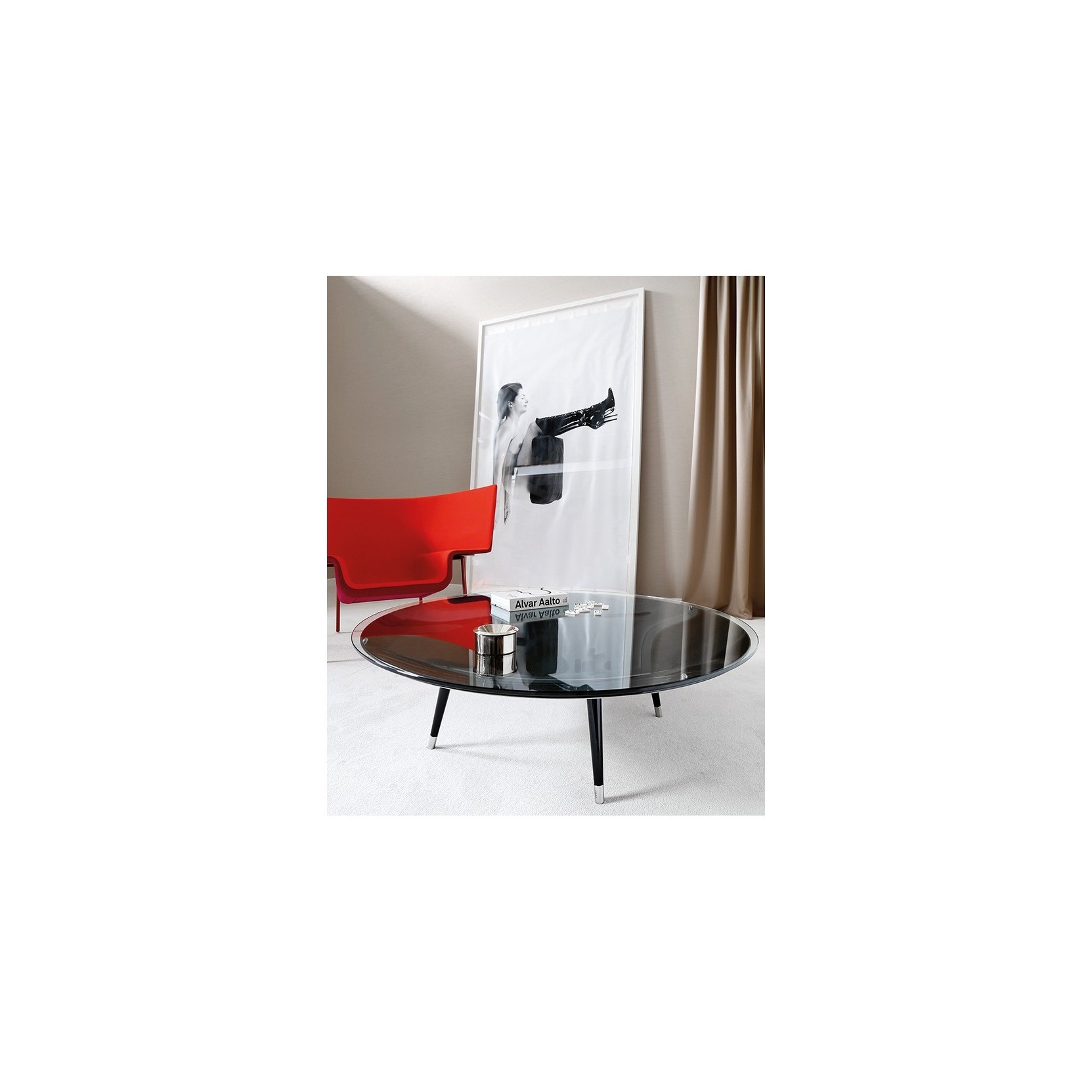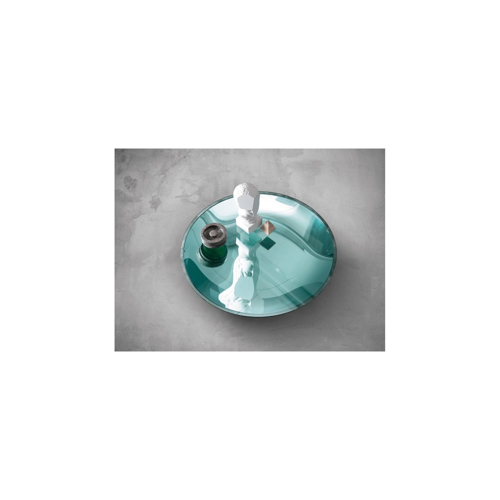 Coffee table consisting of a glass top restingon a concave base in 10 mm curved mirrored glass, available in various finishes, mounted on 4 removable black or white painted legs with brushedsteel feet.
