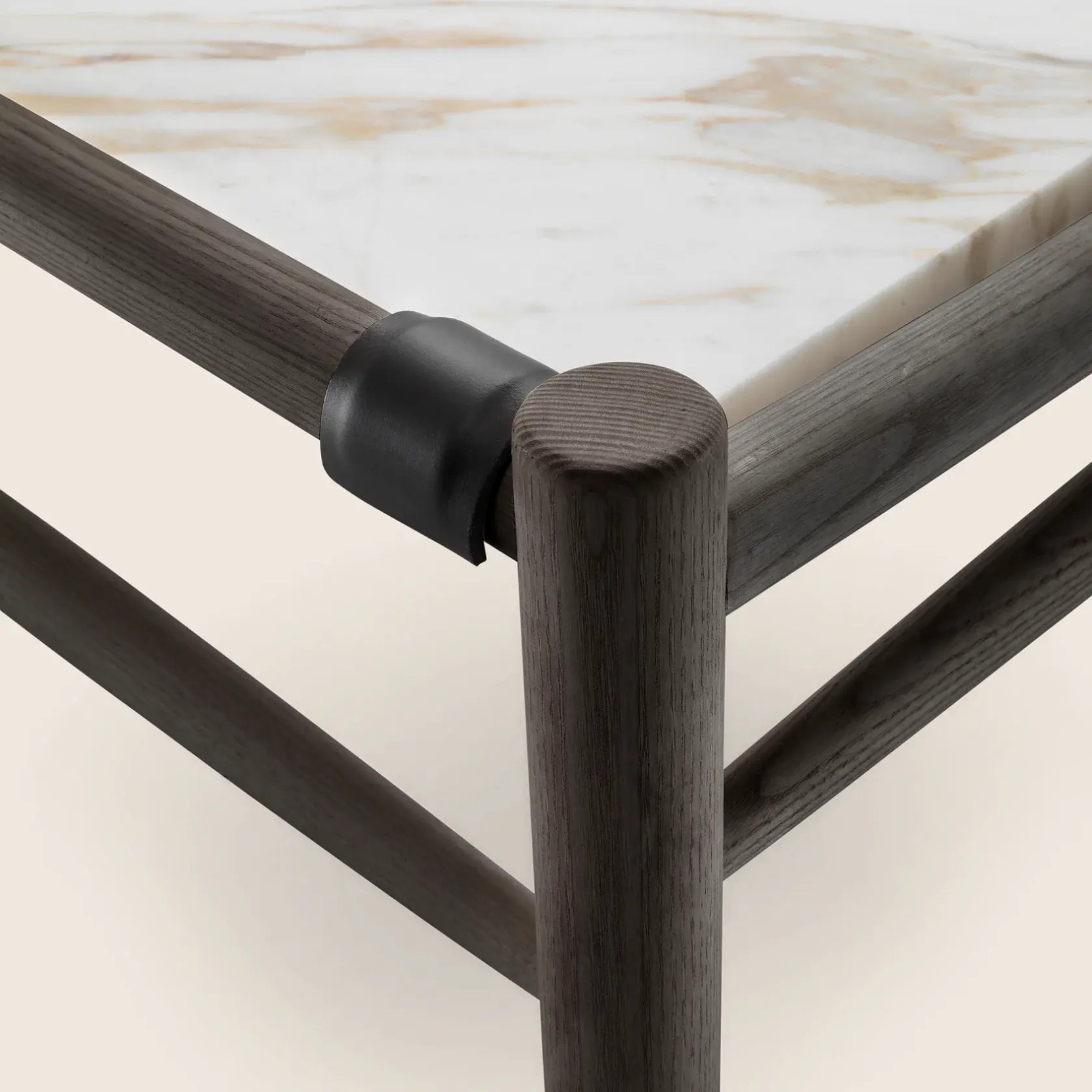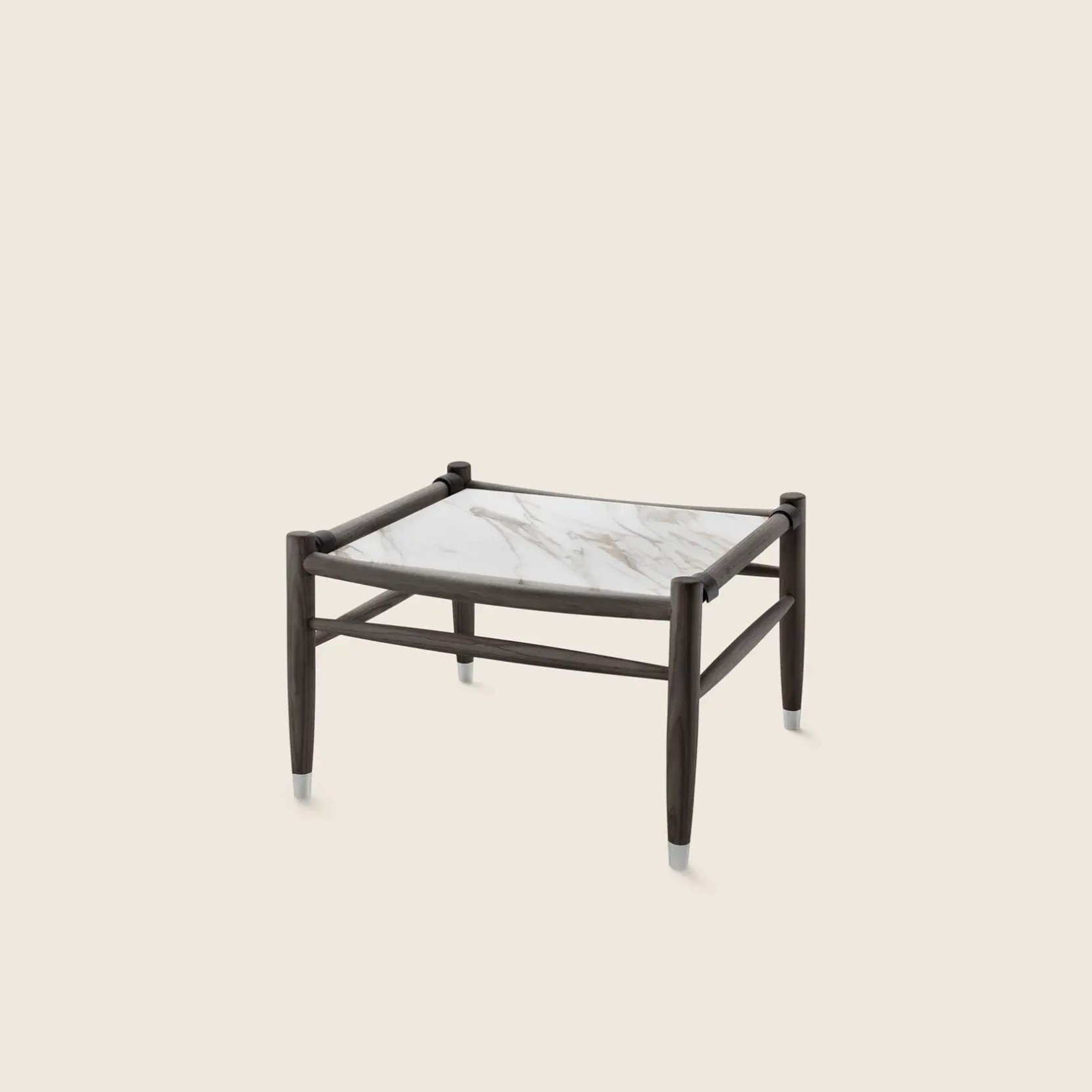 Its structure is made of turned solid wood, offered in a wide range of finishes that enhance the beauty of this natural material. The tabletop, crafted from a curated selection of fine marble varieties, brings a timeless sense of elegance, while the leather-clad supports and die-cast zama feet lend subtle sophistication to the design. This understated yet distinctive piece integrates seamlessly into both residential settings and hospitality projects, perfectly complementing the armchairs, ottomans, and benches in the Tessa family.