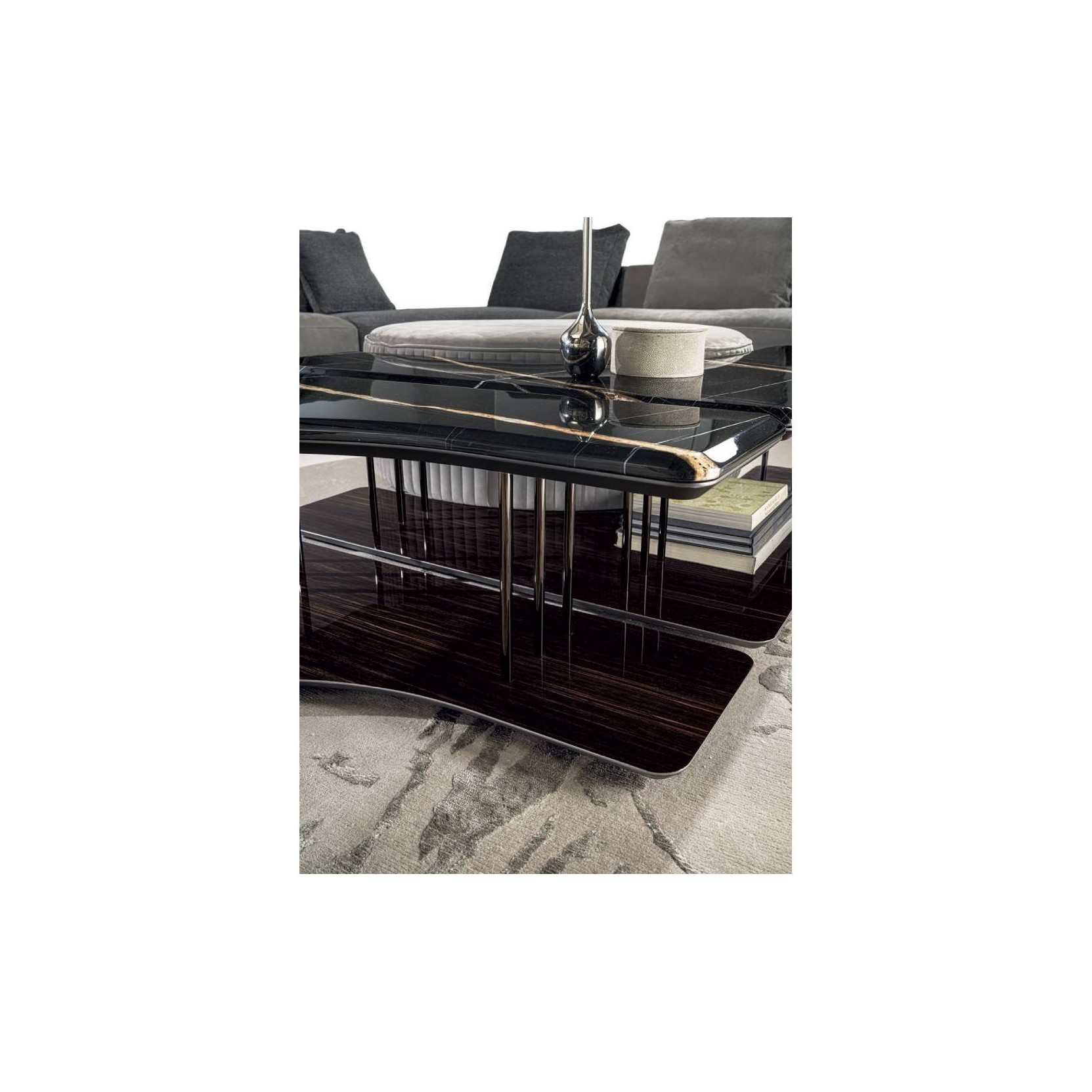 Small table with 50 cm radius concave compartment to accommodate a pouf or other accessories. The surface at the base is in wood: glossy/matt ebony, Canaletto walnut stained glossy/matt Macadamia, glossy/matt Sycamore frisè. The top surface is the finishes: bronze or smoky mirror 5 mm with bevel. 2 0mm marble with 20mm bevel: Emperador Dark marble, Guatemala Green marble, Bardiglio Nuvolato marble, Shale Rosewood marble, Silver Wave marble, Agatha Black marble, Calacatta Gold marble, Dover White marble, Red Levanto marble, Elegant Brown marble, Frappuccino marble, Corteccia marble, Panda White marble, Sahara Noir marble (polyester finish), Port Saint Laurent marble, Fusion Light marble, Patagonia marble, Explosion Blue marble, Fusion Multicolor marble, Juliet Quartz marble, Azul Macauba marble, Portoro marble (on request), Red onyx, Ivory onyx, white onyx.
