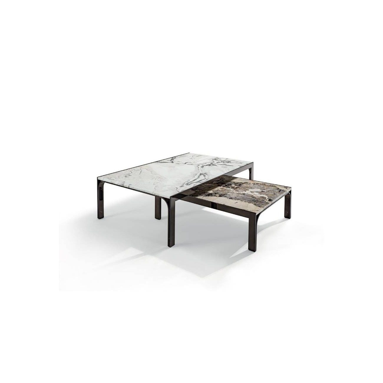 Small tables with ground laser cut metal structure in the finishes: bright shaded brown, Black Rose gold, bright light gold, matt Champagne gold, bright chrome, bright black chrome, matt satin bronze, bright pink gold, matt pink gold. Finishes of squared surfaces: double-faced 6+6 mm glass in bronze + natural, layered with Metal Mesh detail (inox+juta). Marble thickness 20 mm: Emperador Dark marble, Guatemala Green marble, Bardiglio Nuvolato marble, Shale Rosewood marble, Silver Wave marble, Agatha Black marble, Calacatta Gold marble, Dover White marble, Red Levanto marble, Elegant Brown marble, Frappuccino marble, Corteccia marble, Panda White marble, Sahara Noir marble (polyester finish), Calcite Azul marble, Port Saint Laurent marble, Fusion Light marble, Patagonia marble, Explosion Blue marble, Fusion Multicolor marble, Juliet Quartz marble, Azul Macauba marble, Portoro marble.