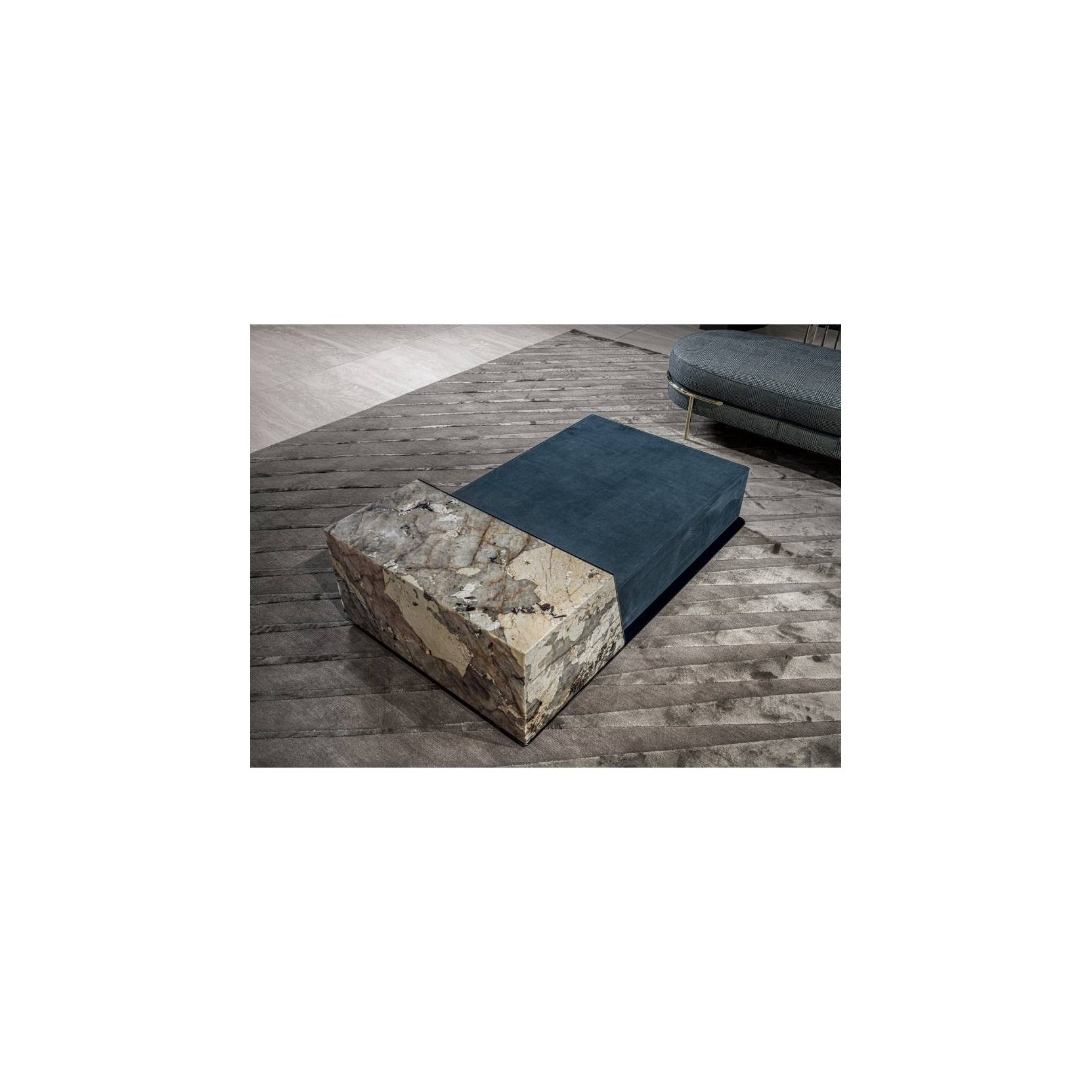 Low table made up of two box structure blocks of different heights with metal profiles in the finishes: bright shaded brown, Black Rose gold, bright light gold, matt Champagne gold, bright chrome, bright black chrome, matt satin bronze, bright pink gold, matt pink gold. The low block can be covered in: leathers from the catalogue, glossy lacquered wood in range colours, glossy/matt ebony, Canaletto walnut stained gloss/matt Macadamia, glossy/matt Sycamore frisè, Emperador Dark marble, Guatemala Green marble, Bardiglio Nuvolato marble, Shale Rosewood marble, Silver Wave marble, Agatha Black marble, Calacatta Gold marble, Dover White marble, Red Levanto marble, Elegant Brown marble, Frappuccino marble, Corteccia marble, Panda White marble, Port Saint Laurent marble, Fusion Light marble, Patagonia marble, Explosion Blue marble, Fusion Multicolor marble, Azul Macauba marble, Portoro marble, Red onyx, Ivory onyx, white onyx. The tall block can only be in marble/onyx in the finishes listed above.