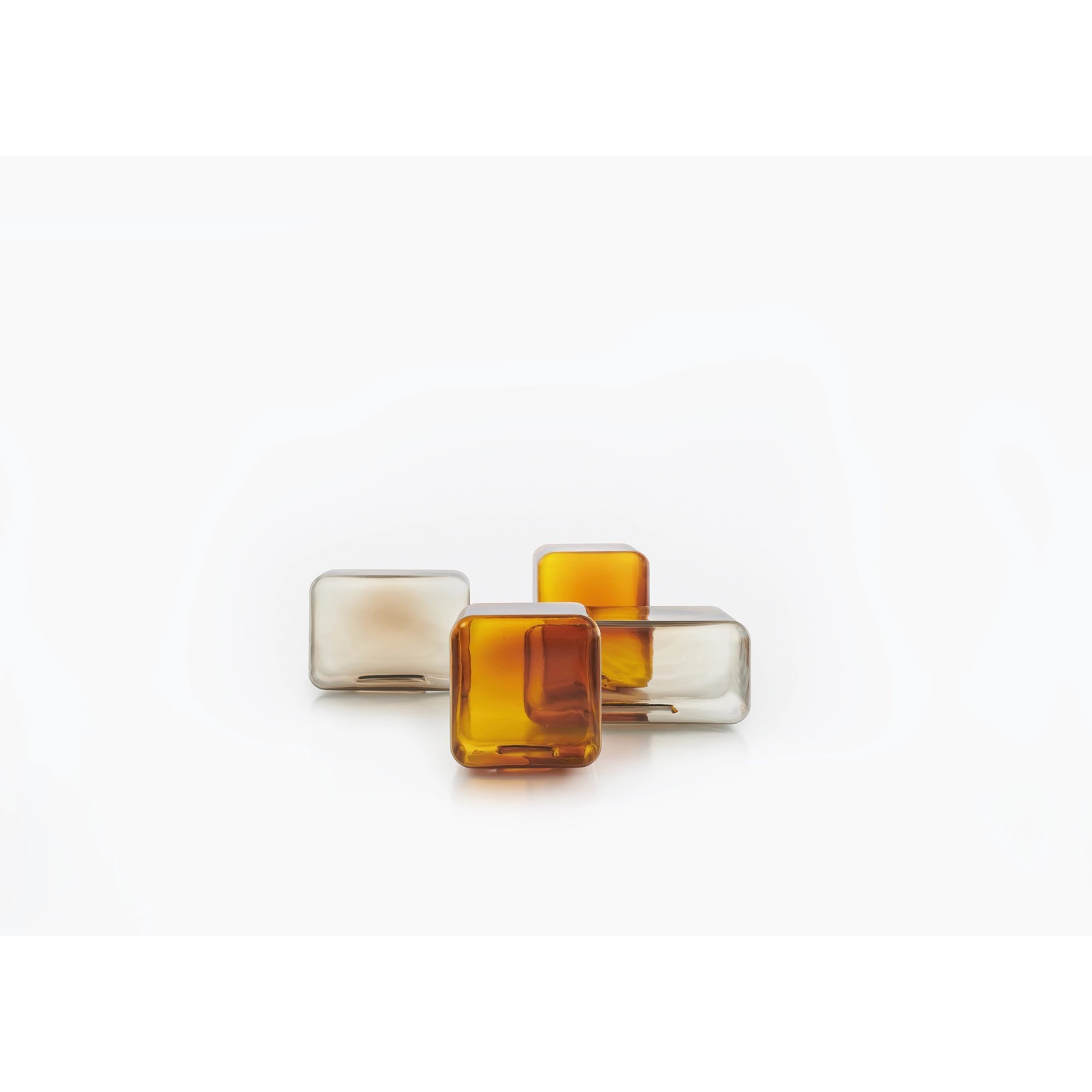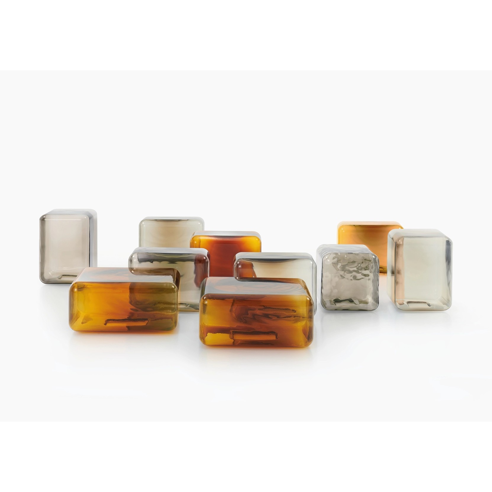 Lokum by Acerbis, designed by Sabine Marcelis, delights with geometric colored blown-glass forms in 55x55xH25 cm, 45x32xH32 cm, or 32x32xH42 cm sizes, bringing playful versatility as vibrant accents in living or relaxation areas.