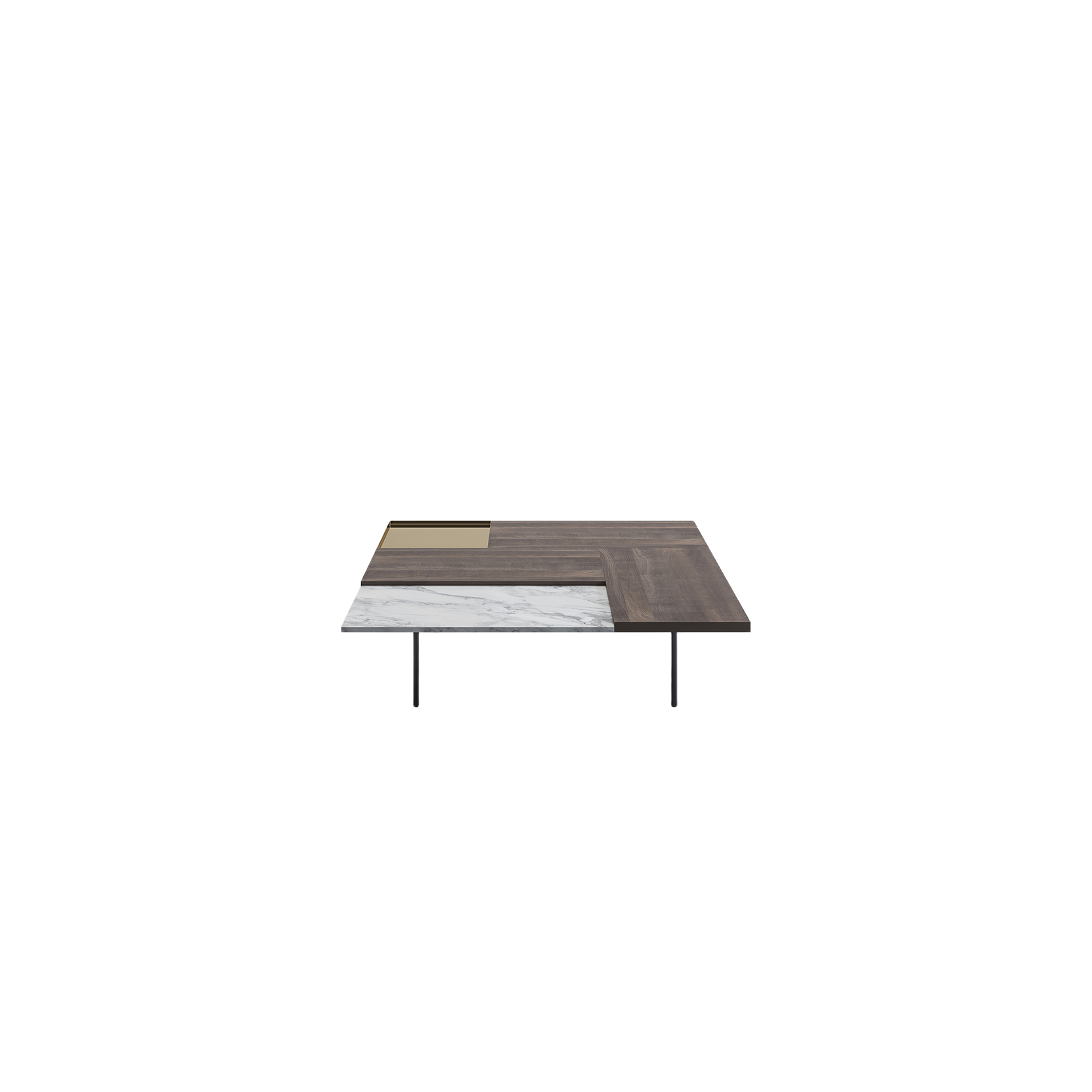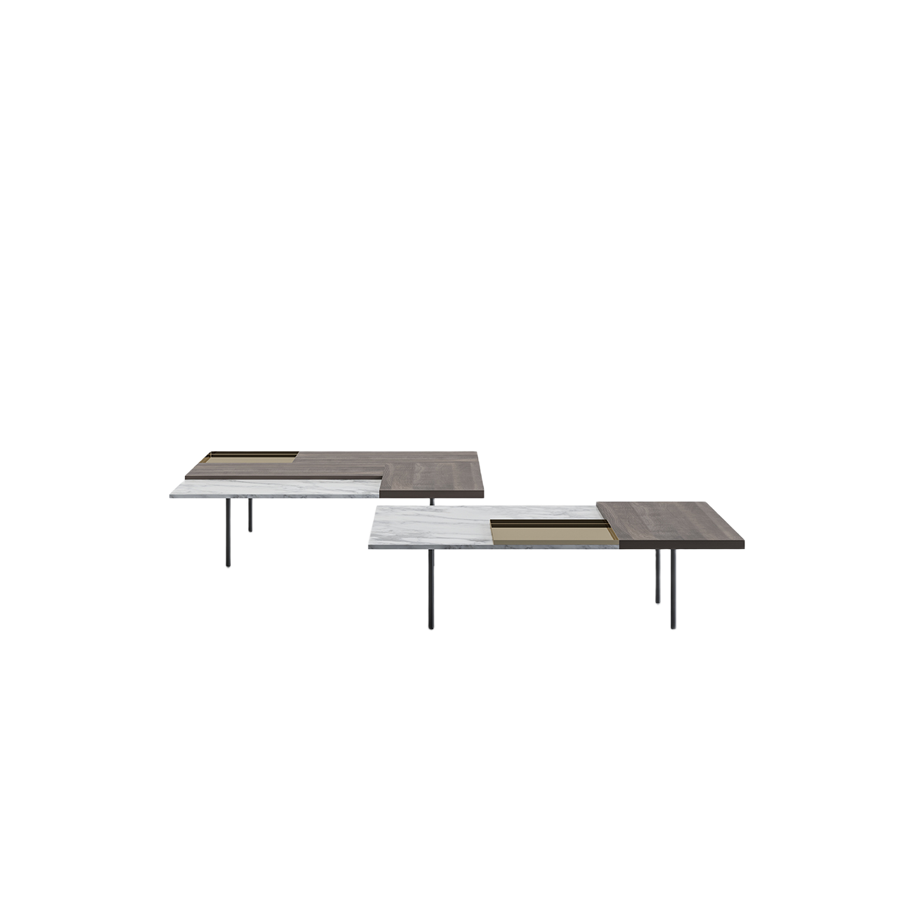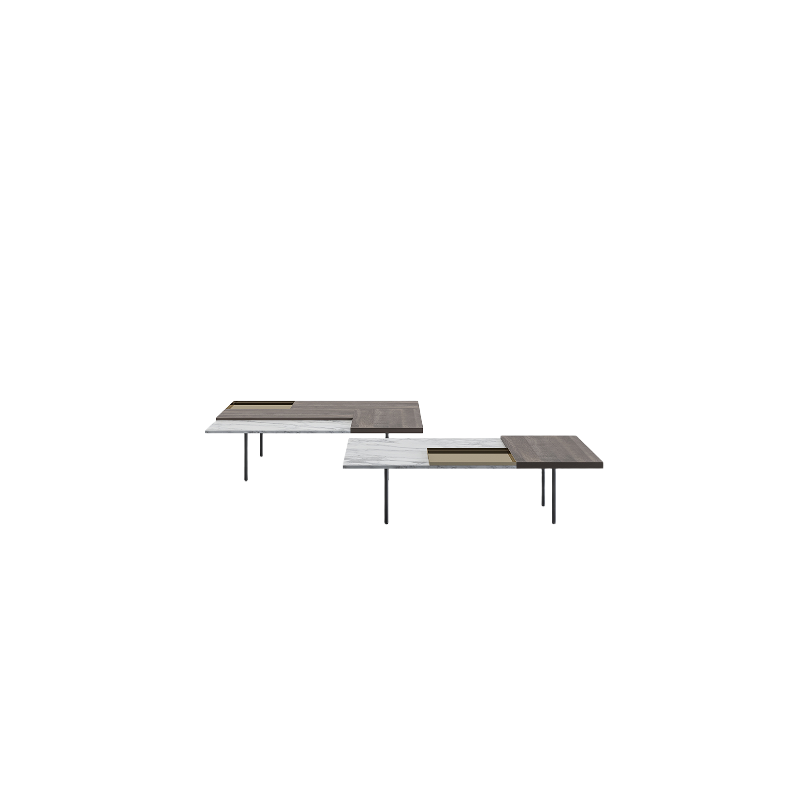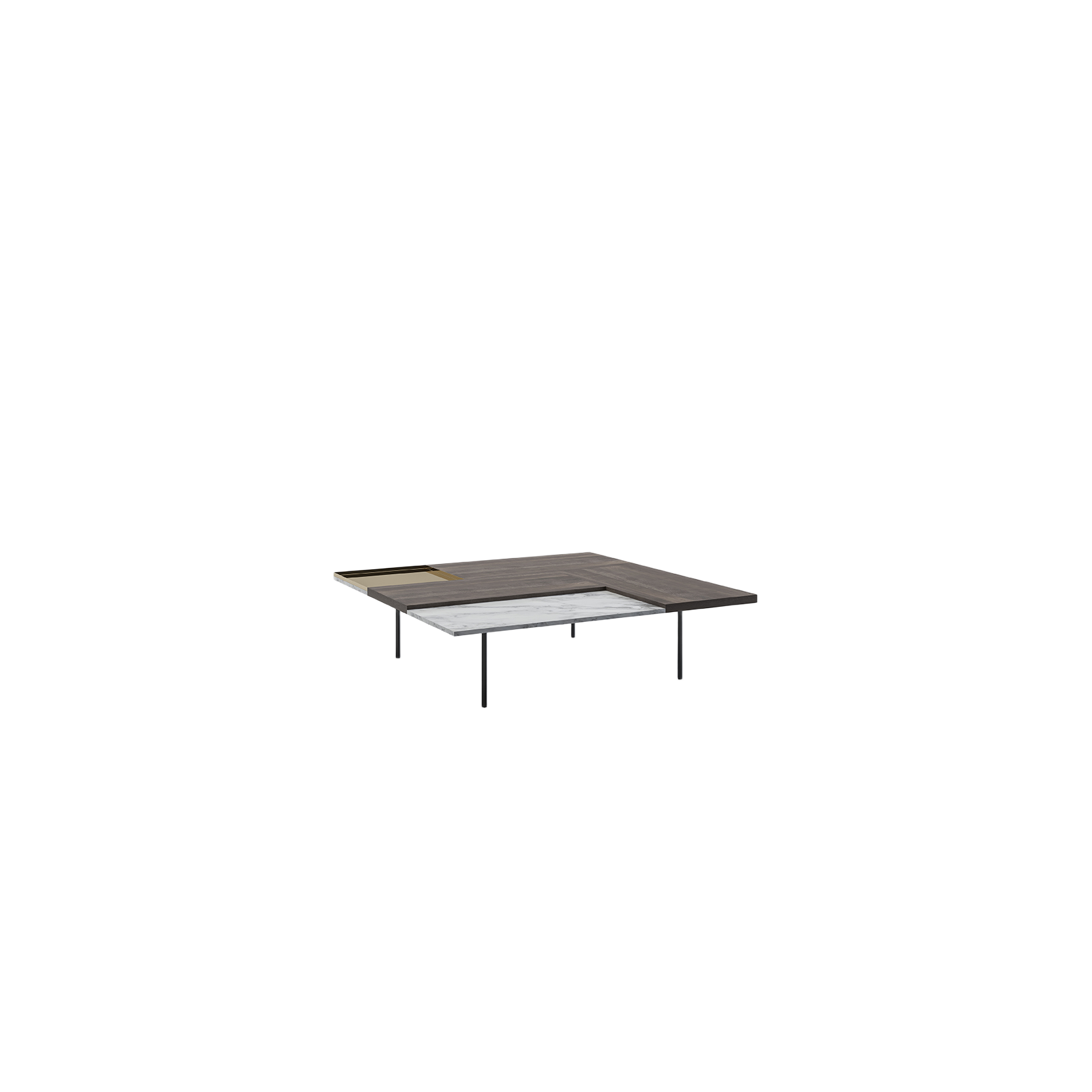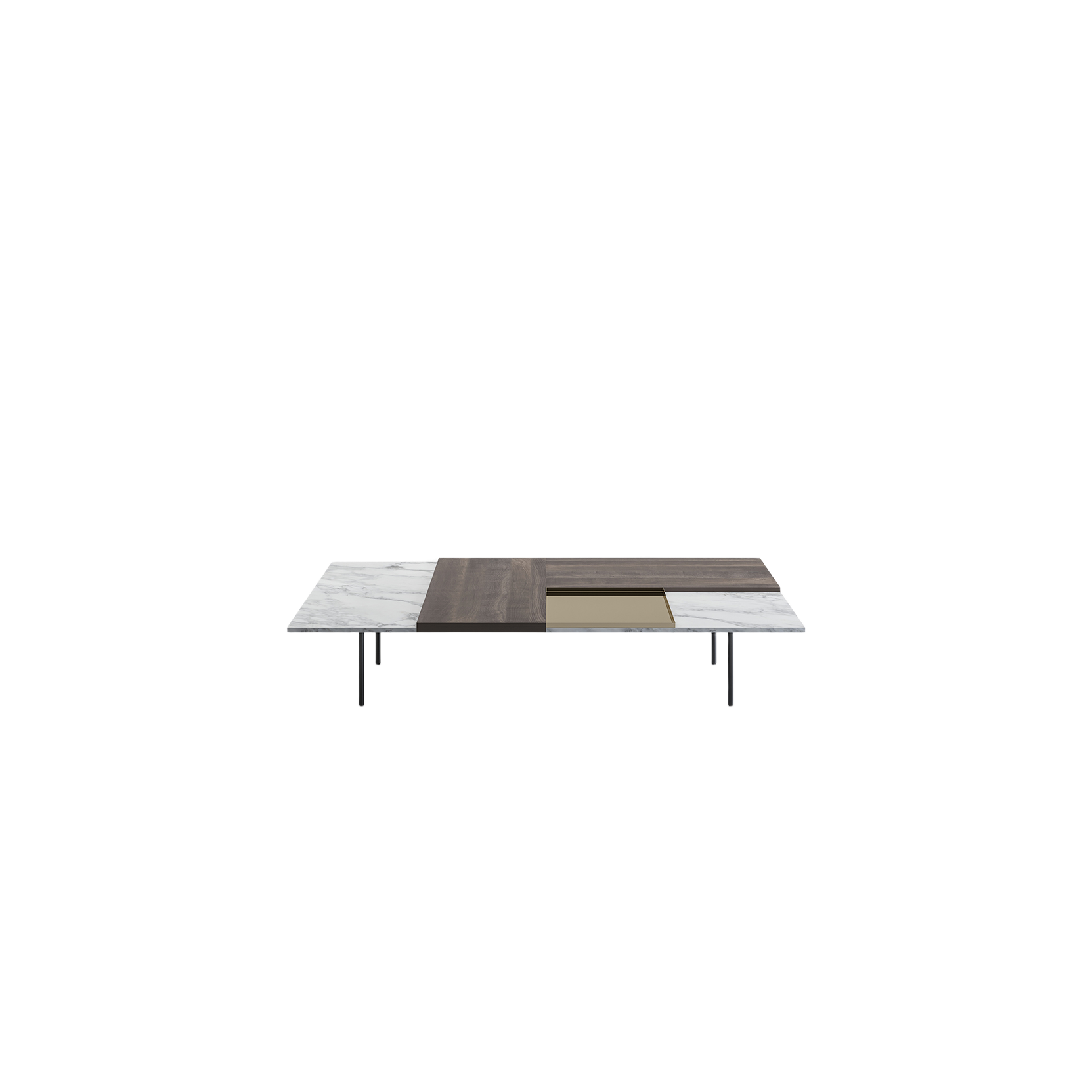 Moodboard, crafted by Massimo Mariani for Acerbis in 2018, boasts a powder-epoxy coated steel base in textured micaceous gray finish, versatile tops in dark-stained walnut or 15 mm thick opaque white Carrara statuario or graphite marble, and a practical tray in polished or antiqued steel. Offered in 120x80xH33 cm, 160x80xH33 cm, and 120x120xH33 cm options, it encourages customer service collaboration for modular designs blending woody warmth, marble coolness, and metallic sheen in functional contemporary vignettes.