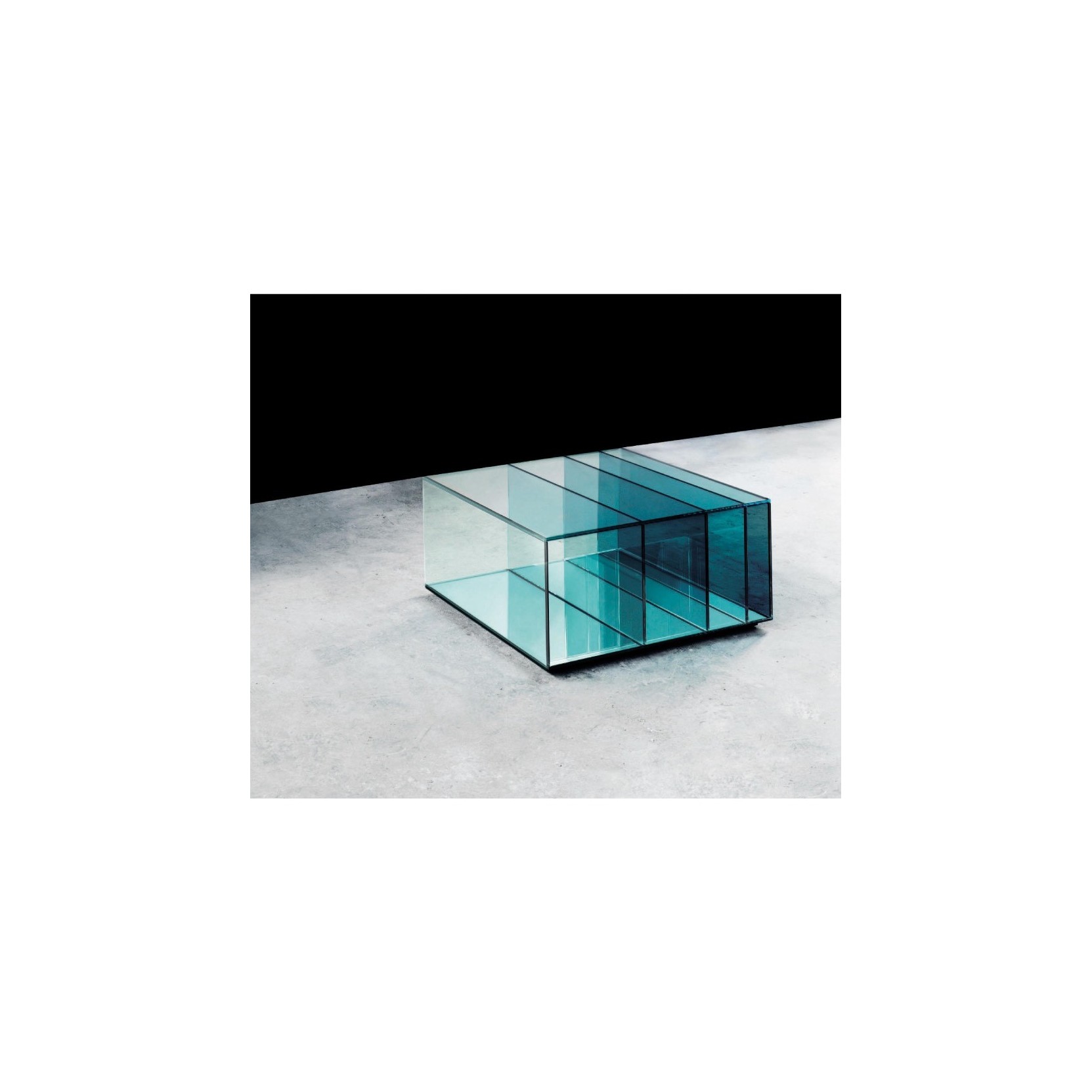 Deep Sea, Glas Italia, is a collection of low tables, designed by Nendo, in laminated extralight glass and sealed with a minimalist design. The vertical elements of the tables are clear glass colored in shades of gray or blue. Passing from one element to another, the distance between them gradually decreases, while the intensity of the color becomes more and more charge. This color effect, associated with the bases of mirror pieces gives great depth and a game of magical reflections.