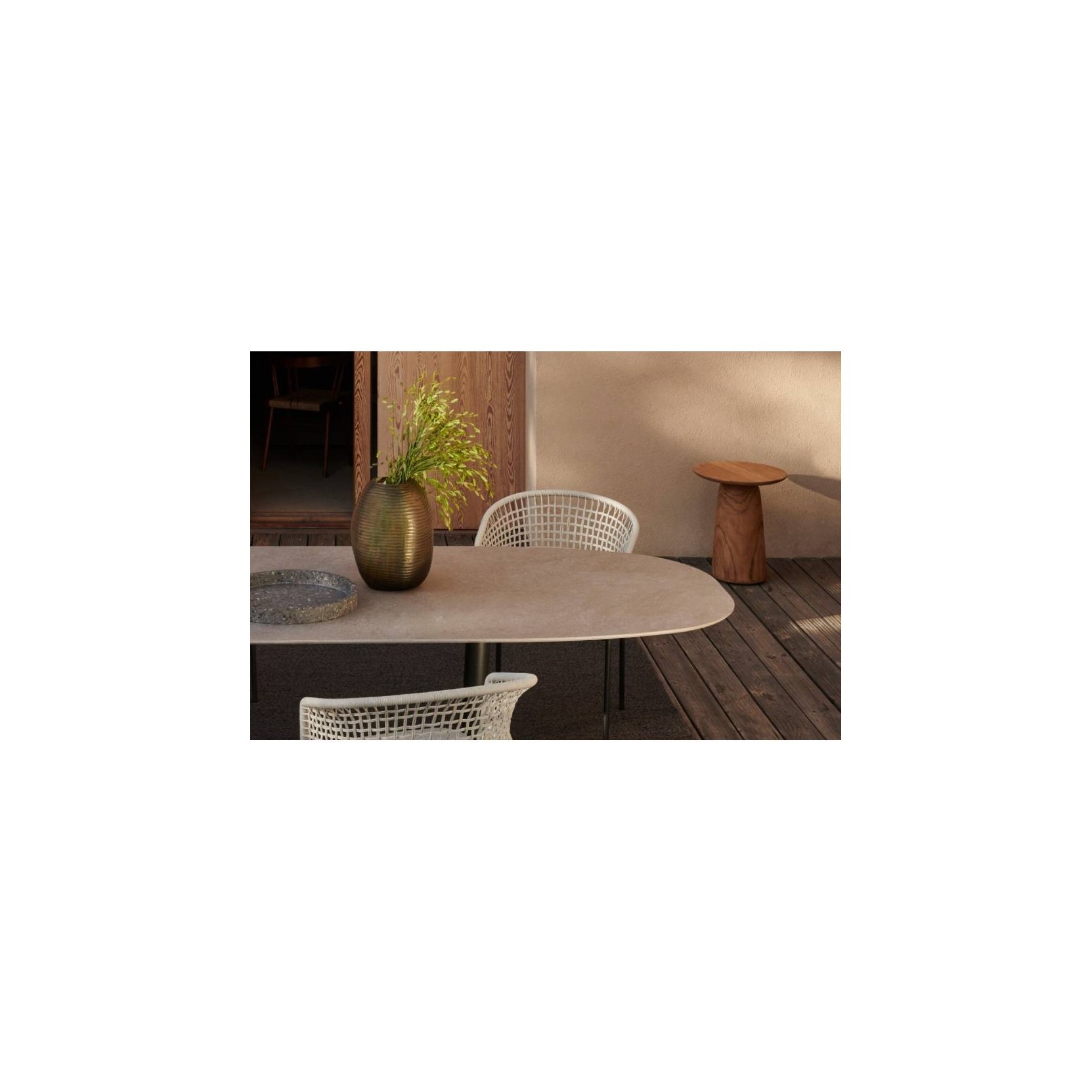 A slender, powdercoated tube supports the floating top of this elegant dining table, which is available in a round, oval and square version. The table top comes in three luxurious finishes: firstly, three shades of hand-glazed, 400-year old lava stone from Vesuvius, which mirrors the sky and is reminiscent of rippling water. For a contrasting look, smooth, solid, sustainably harvested teak. Lastly, there are five subtle, natural shades of ceramic. The stainless-steel frame is powder-coated in three subtle colours and the table is available in different lengths and heights.