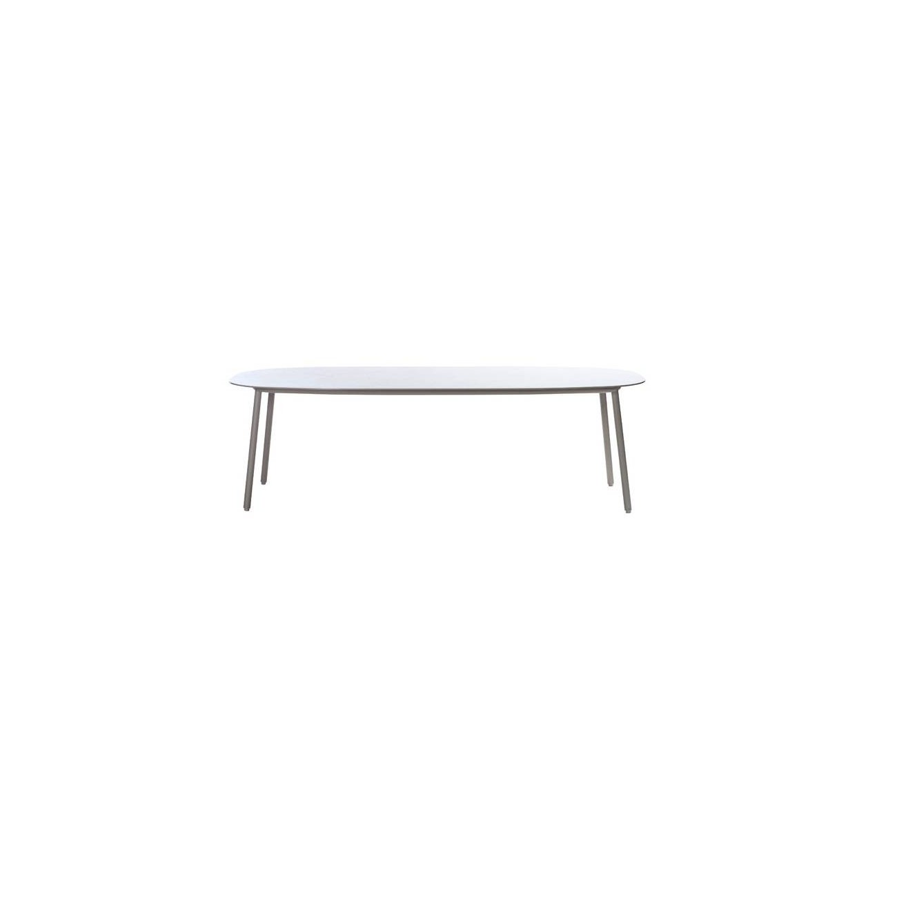 To complete the exclusive Tosca collection, Monica Armani designed a refined dining table with the same elegant, tapered legs and a ceramic table top with a unique oval shape. It is the perfect combination of technical perfection and sophisticated beauty. The ceramic, adorned with a subtle pattern, is laminated on glass, water-jetted in an oval shape and then CNC-milled. Ceramic is an ideal outdoor material, as it is completely UV-resistant, frostproof, extremely scratchproof and completely stain-repellent, not to mention easy to maintain.