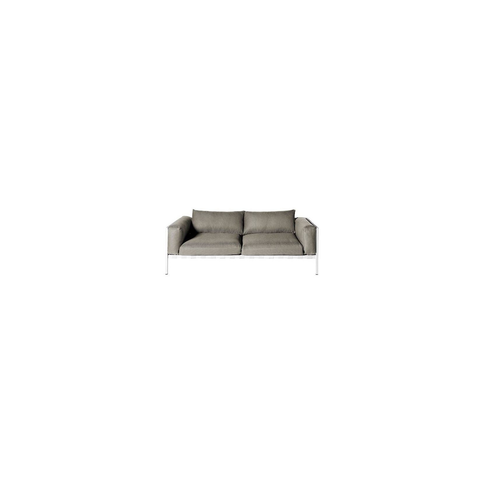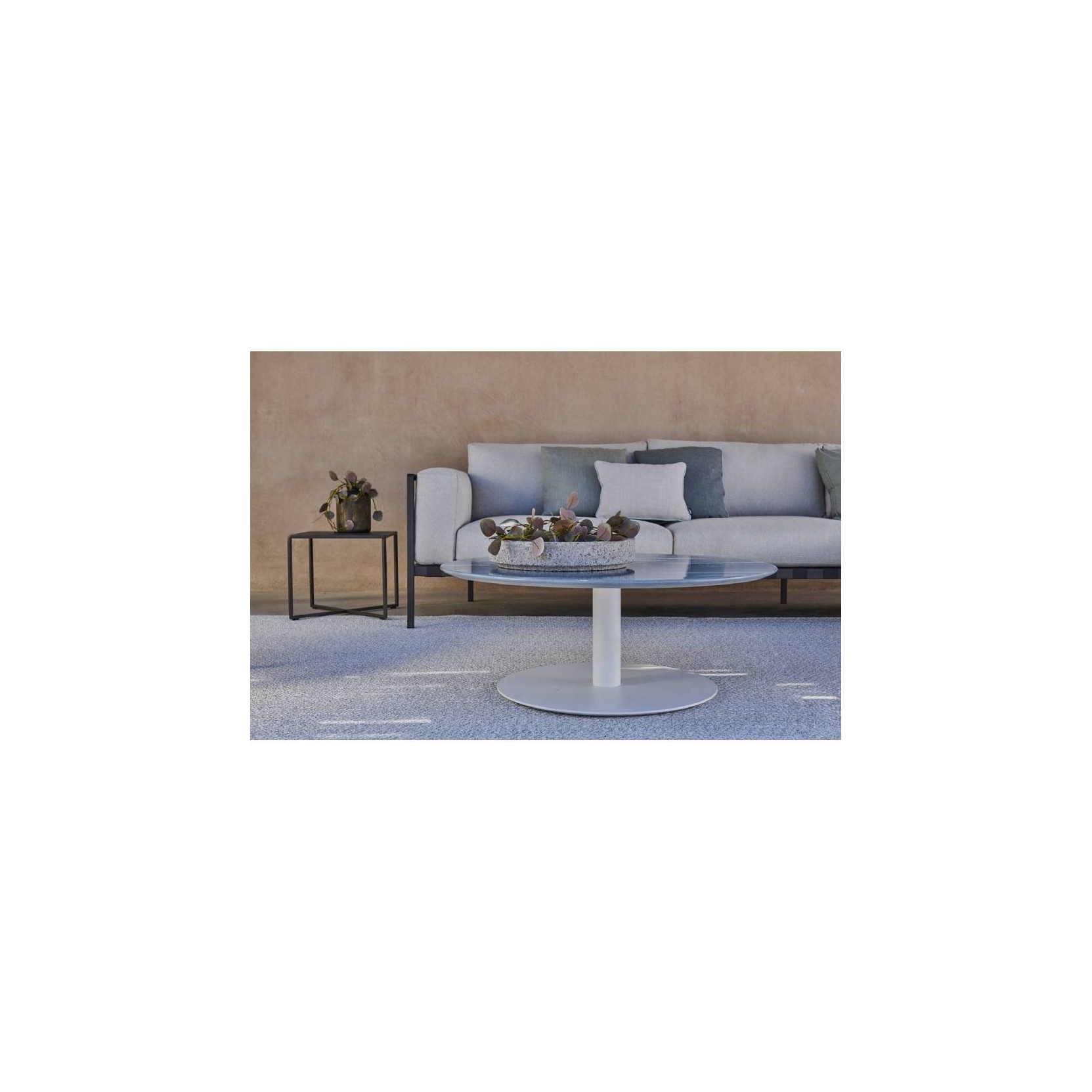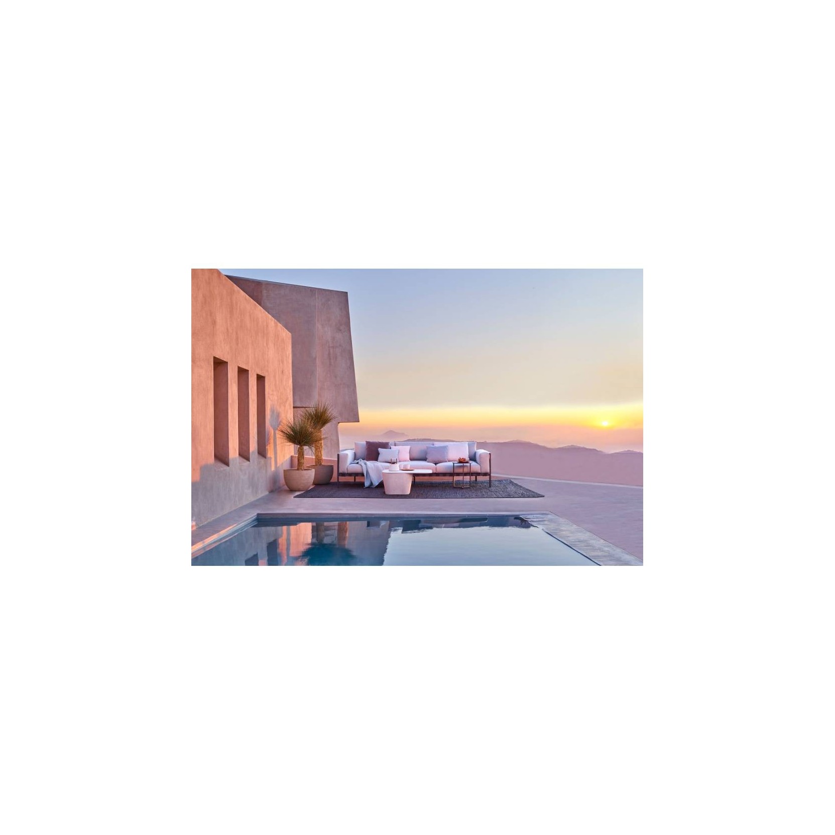 A subtle frame with curved armrests contrasts beautifully with the volume of the cushions, supported by a weave of wide textile straps. Timeless and elegant, the Natal Alu Sofa is an outdoor sofa that looks great on any patio. With nineteen different modules, two different seat depths, two available frame colours and more than 100 fabrics to choose from, the possibilities are endless. The aluminium frame is powder coated with ultra-durable, UV- and scratch resistant textured lacquer which provides a beautiful matte look. Special attention has been paid to the outdoor cushions, which have a ventilating, water-repellent filling, so they can easily handle a sudden downpour. The seams have an extra inside cover and the thread used to stitch the seams, swells when wet to further prevent water from penetrating.