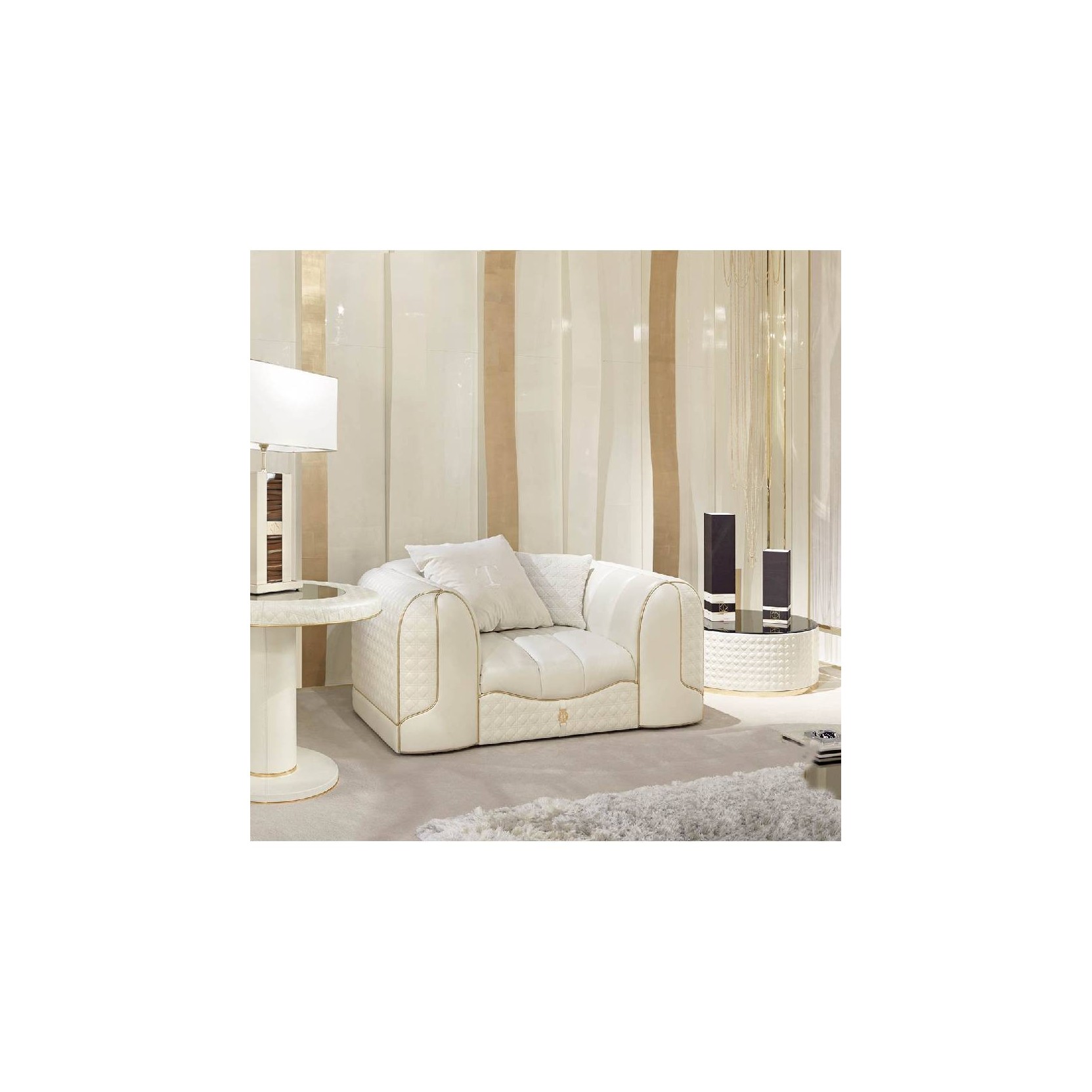 The armchair of Caractere collection has a strong glamorous personality, its distinctive feature is the quilting, a rhombus motif taken from the world of fashion, which contrasts with the smooth seat with vertical stripes. The wealth of details and harmonious lines evoke a refined and modern elegance.