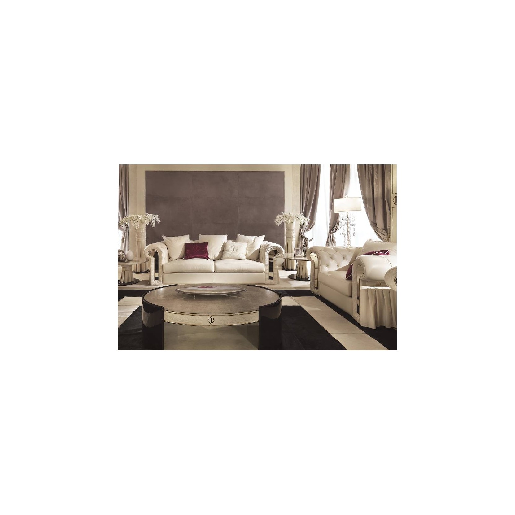 The sofa of Couture collection expresses a concept of design and elegance that arises from the desire to create fluid shapes with references to classicism. The sofa is made with capitonné backrest and with the application of leather skirts around the perimeter, a distinctive element of the whole Caractere collection. To further embellish the living room are the golden metal inserts applied to the armrests.