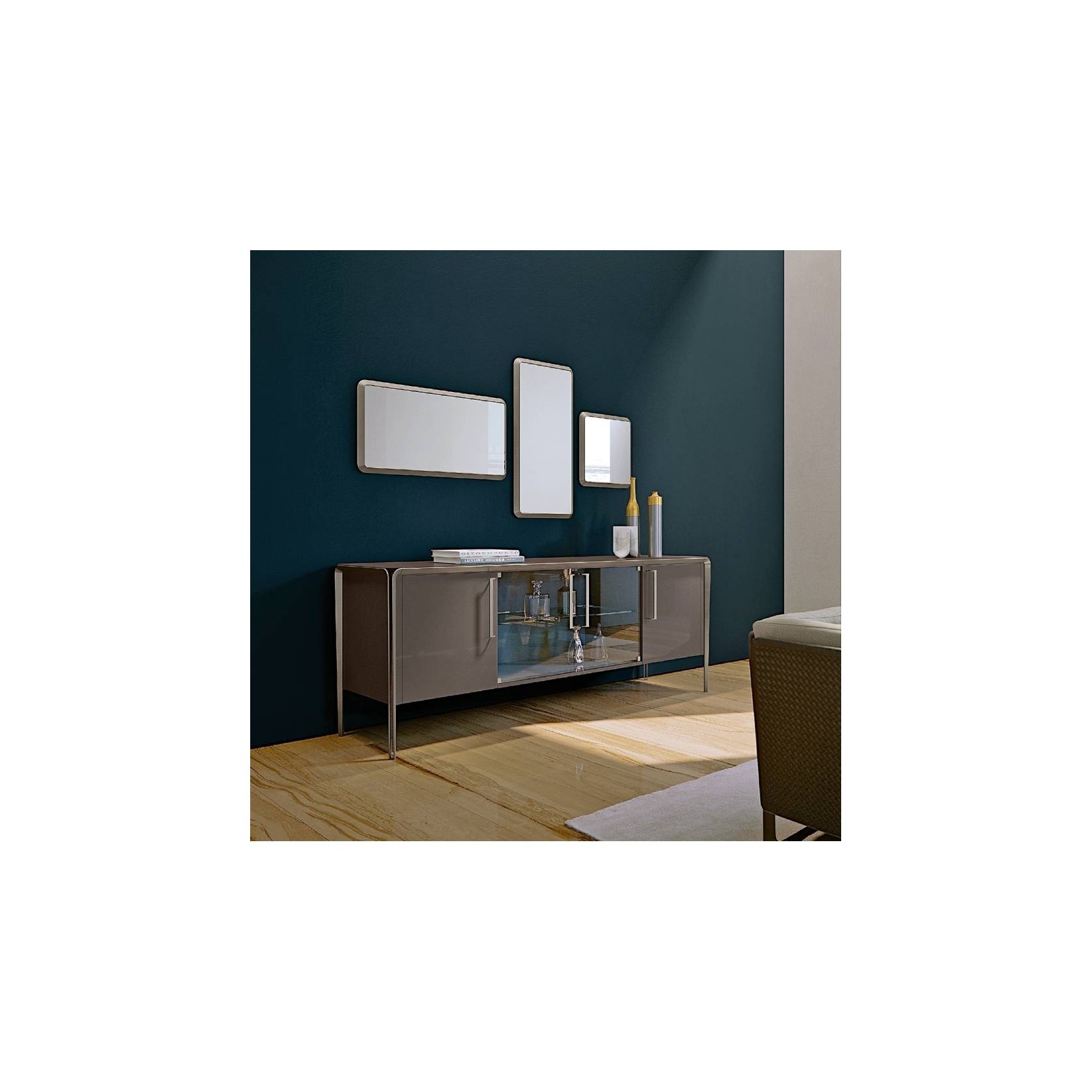 The sideboard of the Milano collection is a sophisticated product designed to convey elegance. The storage unit has a lacquered wooden structure supported by thin metal legs which hide leather inserts. The container consists of shelves and glass doors in the central part, and lacquered wooden doors on the sides, to which curved metal handles are applied. The Milano sideboard is an indispensable element for storing objects and giving the rooms in the home a sophisticated atmosphere. The Milano sideboard is available in different finishes as per sample book.