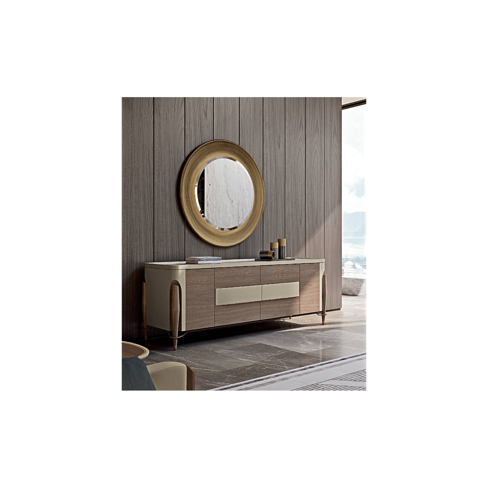 The sideboards of the Melting Light collection are available in two models, one with sliding front doors, one with 4 hinged doors. The sideboard with sliding doors has an upper compartment with flap doors, the front part is available with leather or natural wood upholstery. The sideboard with hinged doors has a natural wood structure and a marble top, with leather applications to embellish the structure.