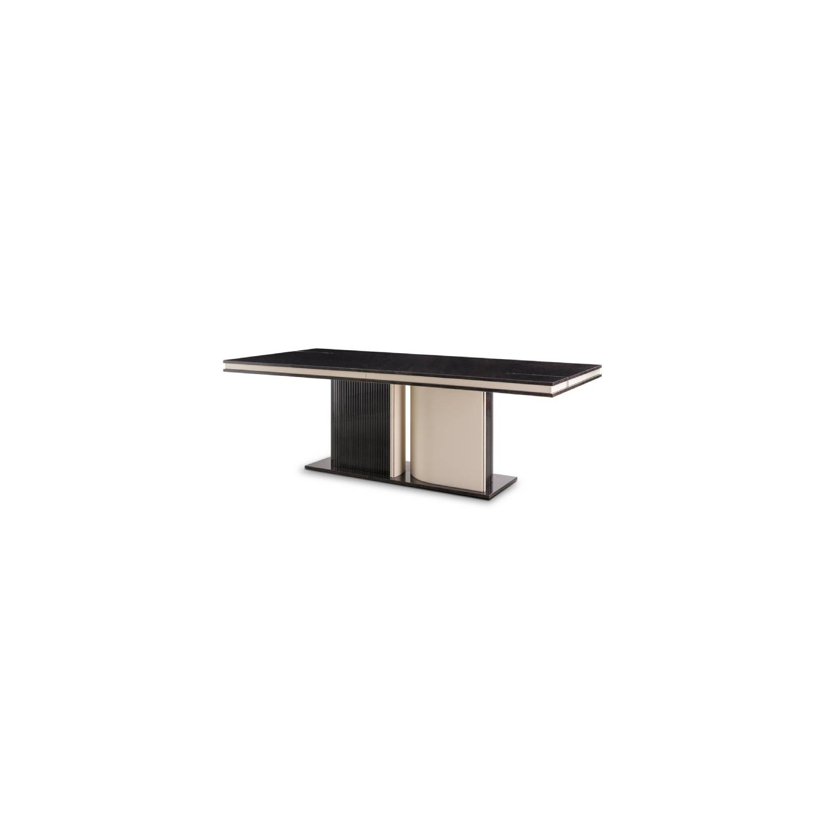 The rectangular table with central base from Eclipse collection features the same stylistic code of the whole collection. It has a single base placed in the center with leather inserts and grooved wood, which supports the rectangular top. The gold metal details enhance the design of the model highlighting the shapes.