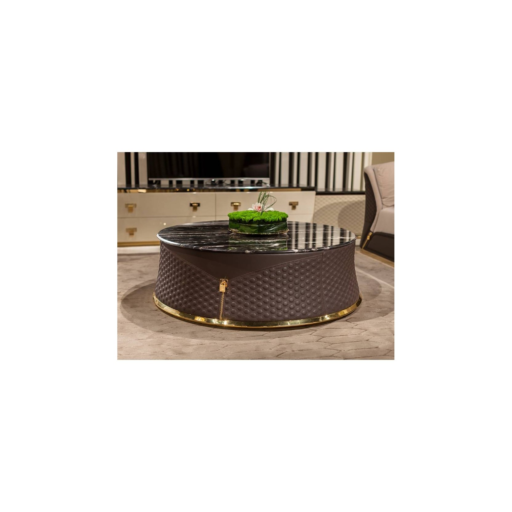 Coffee table from Vogue collection is distinguished by refined and sophisticated details that highlight the exclusivity of the shape, the lightly flared structure is covered with embroidered leather with application of decorative zip in gold metal and a basement in gold metal characterized by his diamond shape. Top can be chosen between marble and glossy lacquered wood.
