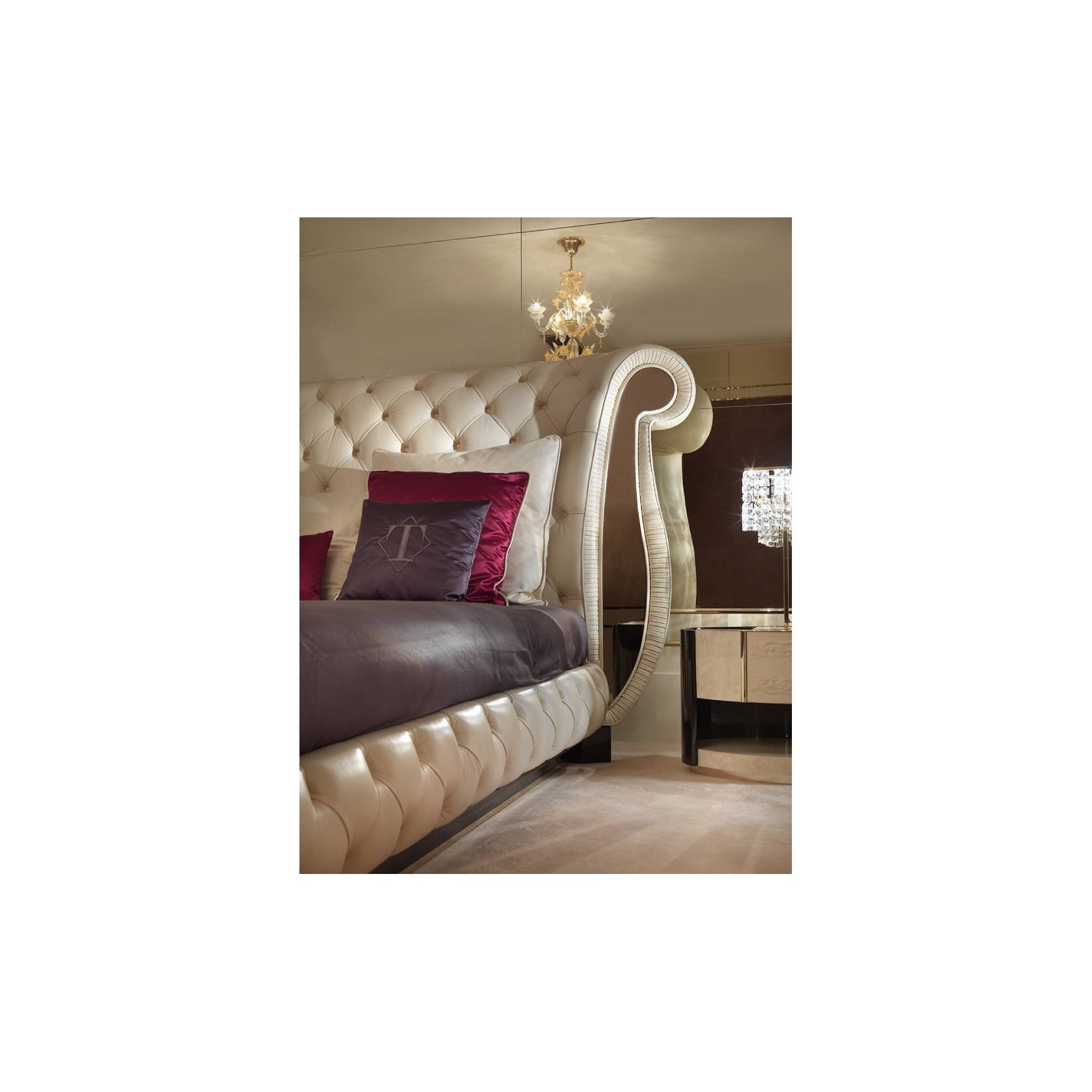 The bed from Couture collection has an important and luxurious design; it is entirely upholstered, covered in leather or fabric. The headboard with gold metal inserts, and the bedframe, are worked with capitonne, with elegant leather buttons.