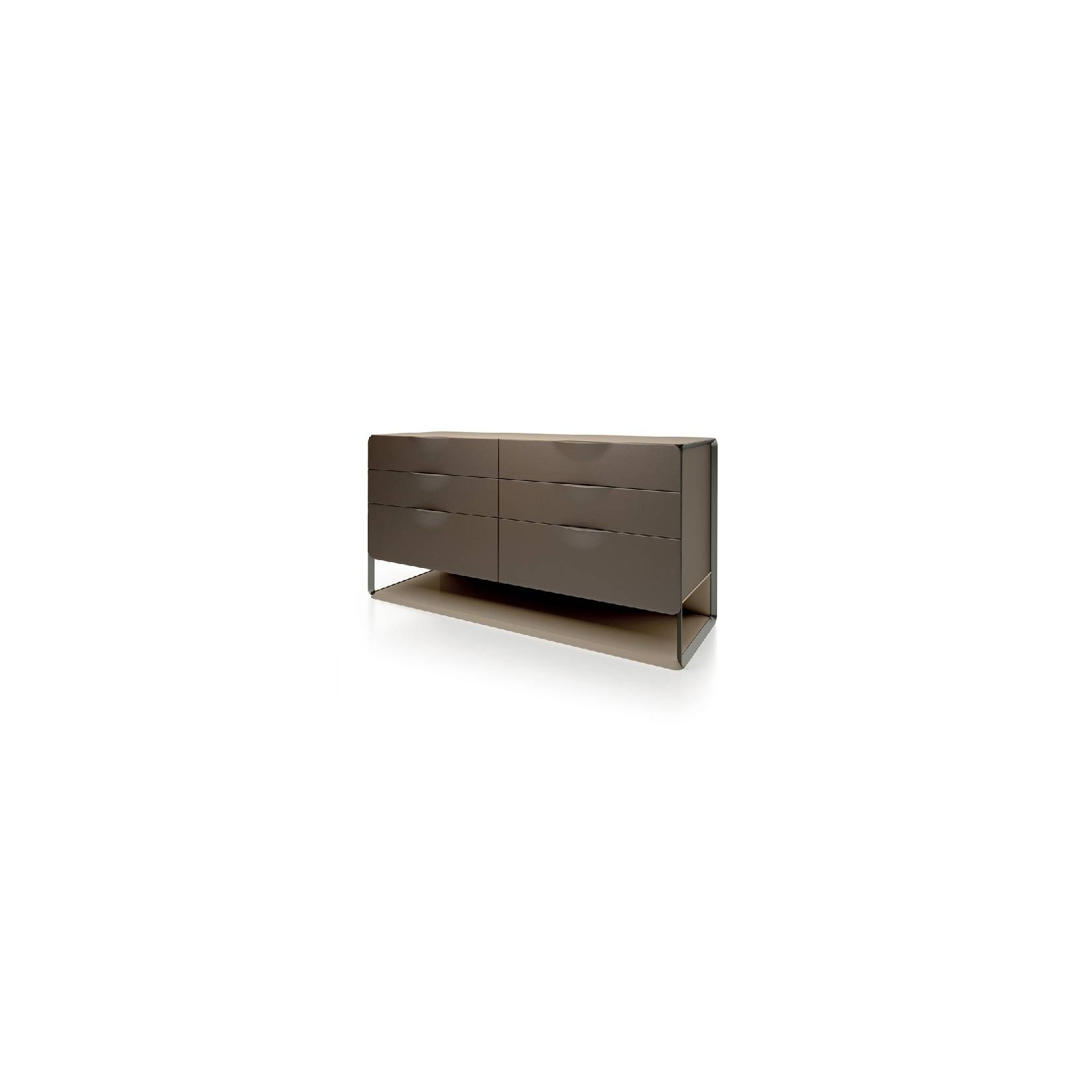 The chest of drawers of the Milano collection has a compact and solid structure covered almost entirely in leather, the shapes of the structure are highlighted by side elements in satin nickel metal. The chest of drawers has six large drawers covered externally in leather and internally in microfiber, the top is in wood, glossy lacquered finish. The Milano chest of drawers is available in two versions: lower and higher.