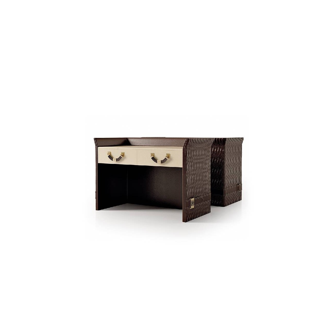The dressing table of the Numero Tre collection is a complement designed to perfectly match with the other elements of the sleeping area, it has a structure covered in diamond-embroidered leather, except for the two drawers and the top which are in wood in glossy lacquered finish, the top it is equipped with an hidden tilting mirror. The handles are made of woven leather with gold metal details or entirely in metal.