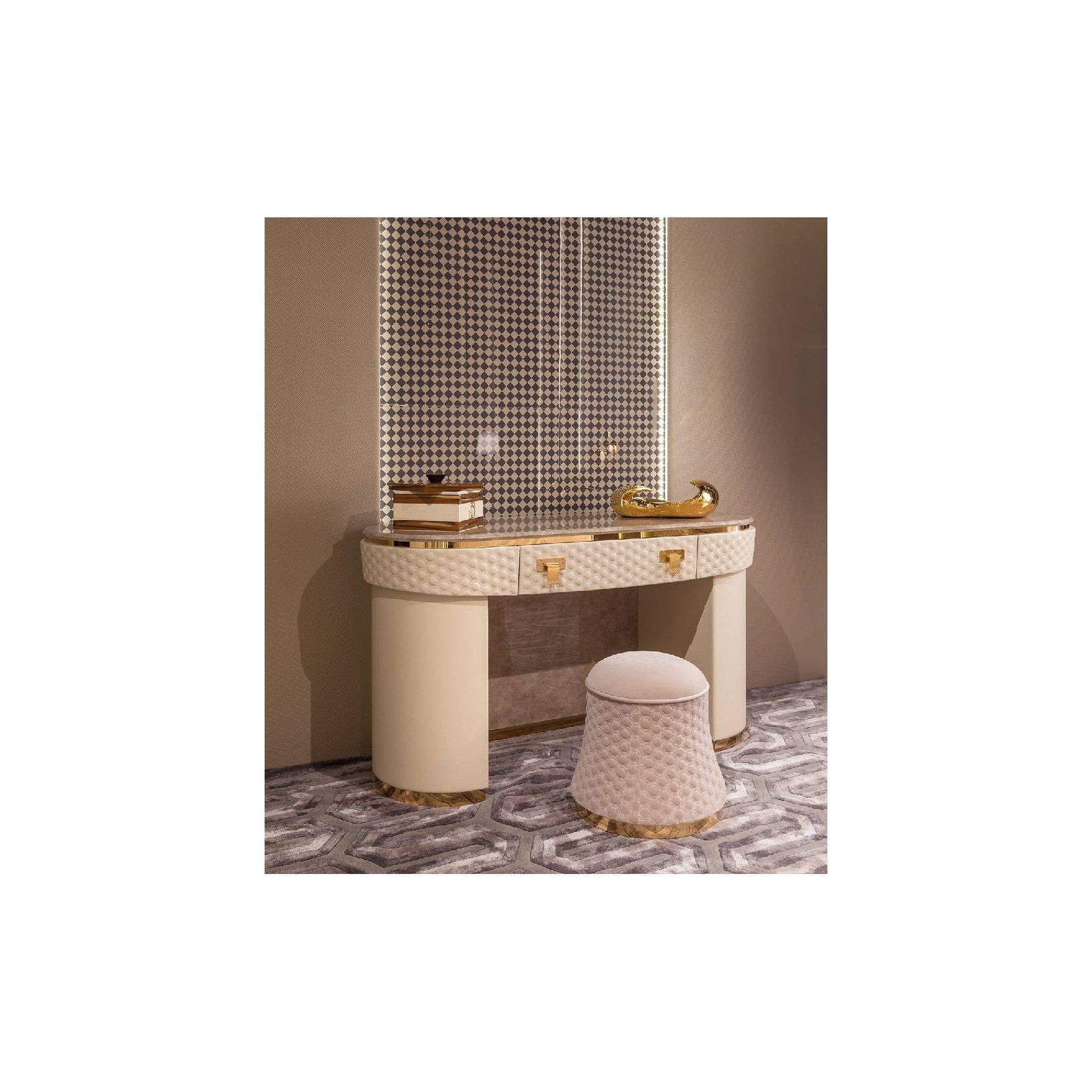 Pouf from Vogue collection is a luxury accessory with a fully upholstered structure and a metal base. The round structure is covered in leather or fabric with hexagonal pattern embroidery, the seat cushion is plain.