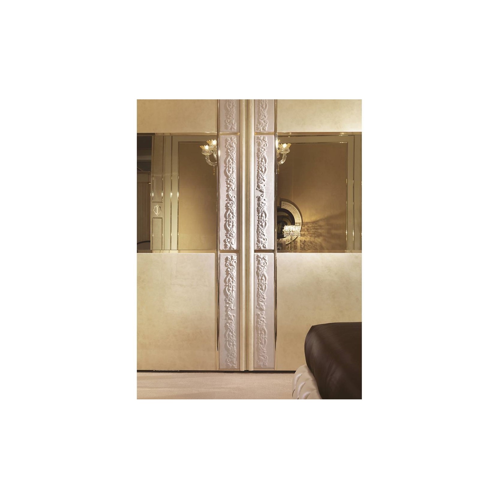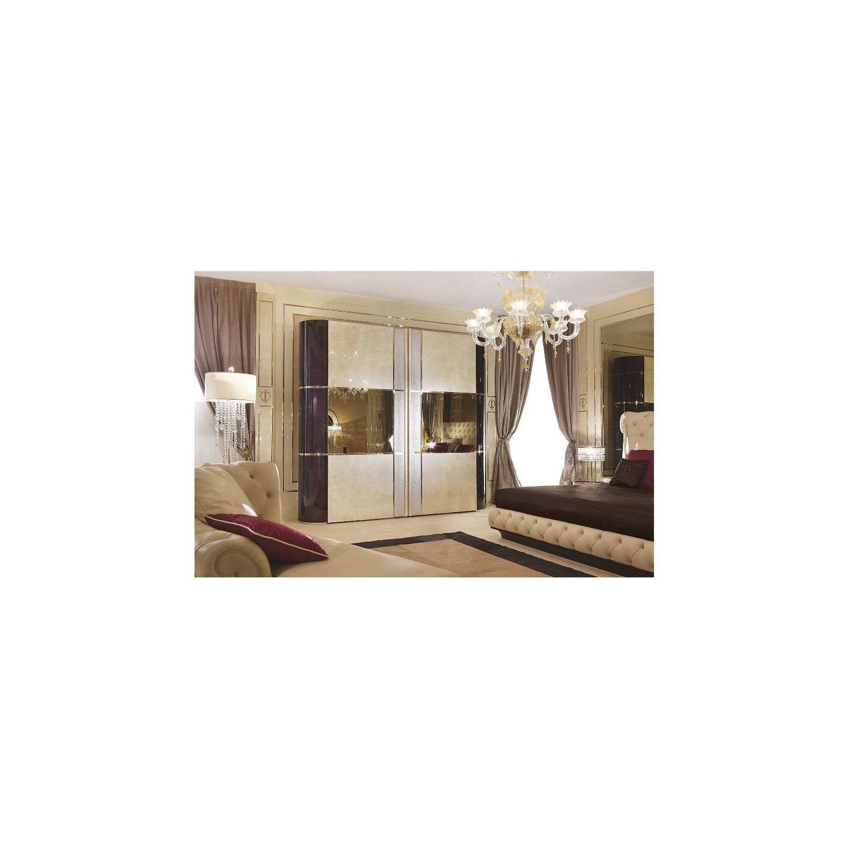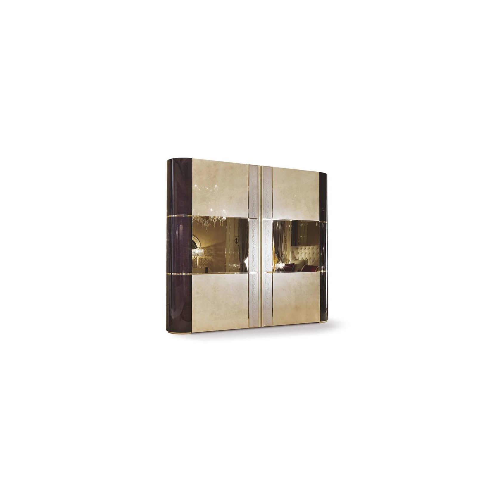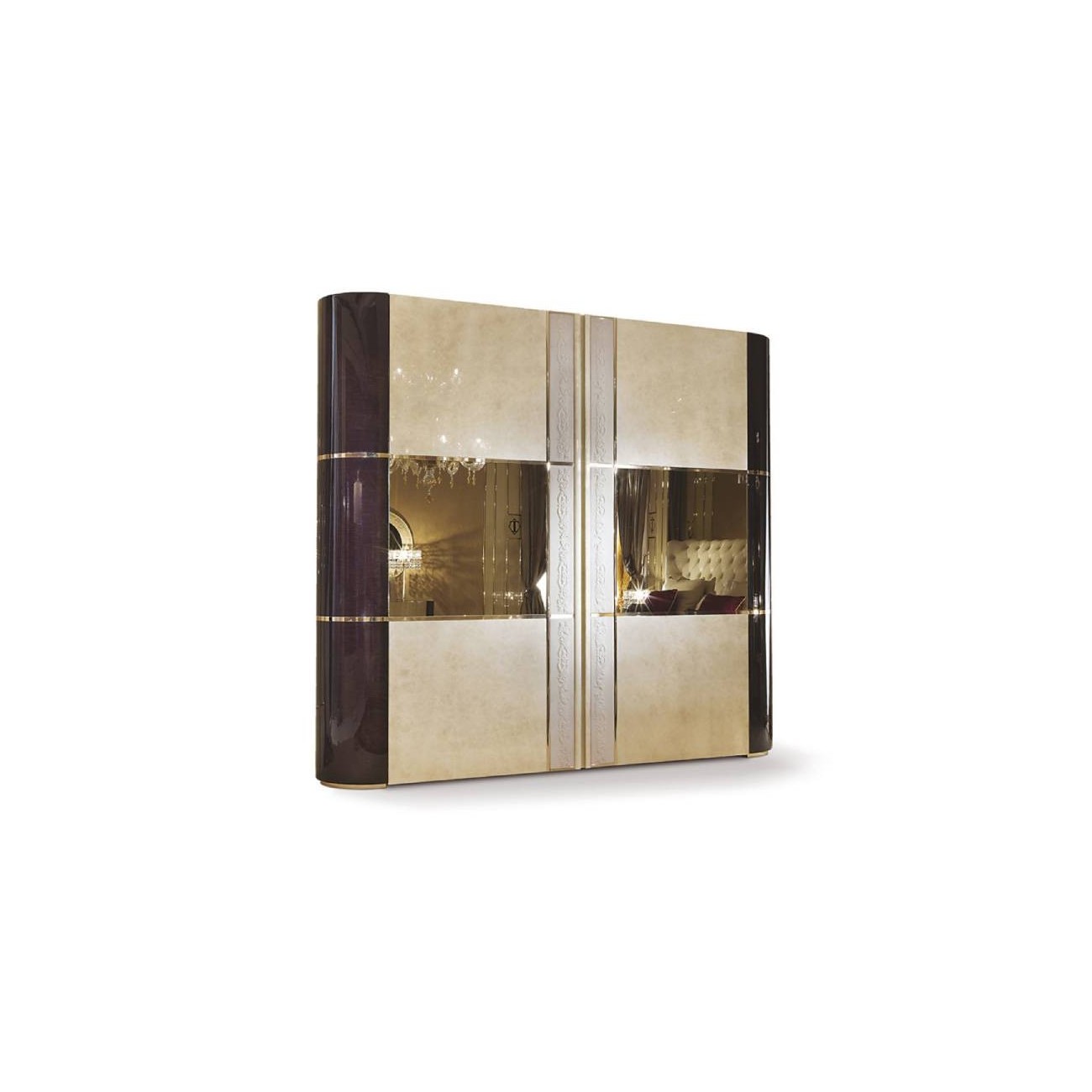 The Couture Wardrobe evokes contemporary luxury, the glossy lacquered structure is divided into sections allowing for a contrast of colours. The sliding doors have a horizontal bronzed mirror with a gold coloured metal frame.
