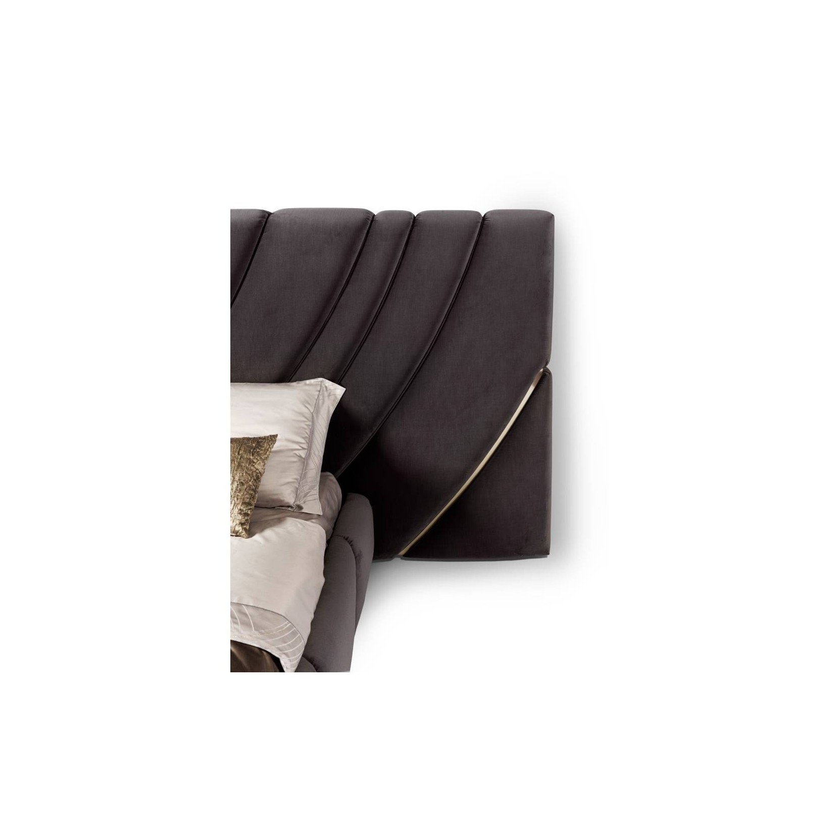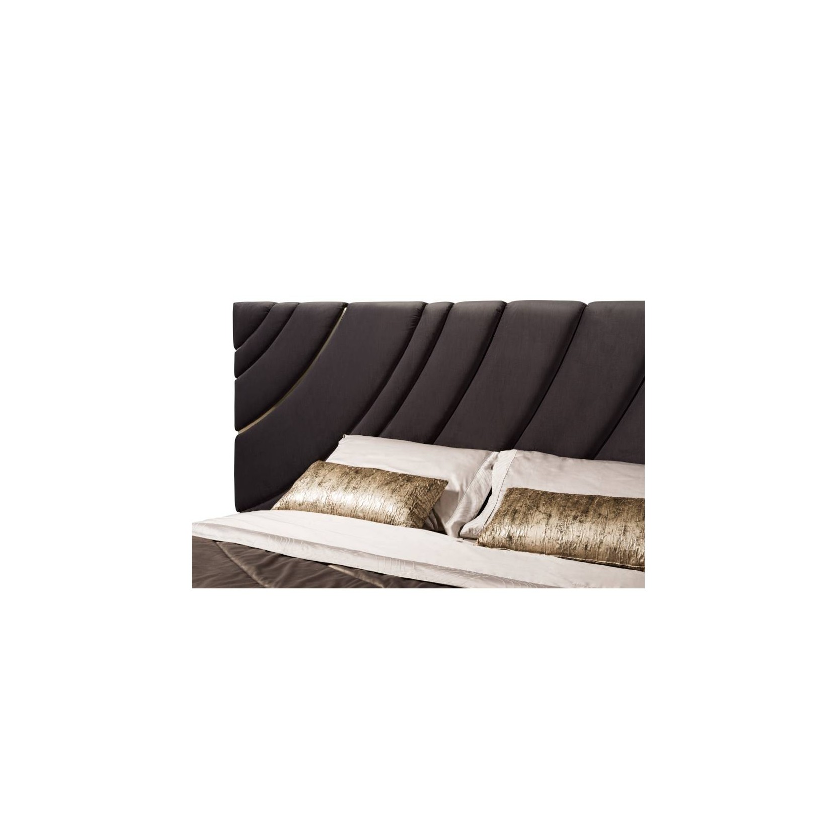 Bed upholstered in leather or fabric, headboard composed by a structure in poplar plywood and bands padded and upholstered one by one, creating a three-dimensional patter decorated with polished stainless steel friezes. To be wall mounted. Bed frame with structure in plywood, padded in polyurethane foam and decorated with quilting. Bed can be provided disassembled. Plinth in polished stainless steel. Wooden slats supported by four corner brackets and one central rod, with adjustable height. The metal parts are available with any finish included in the metal finish selection.