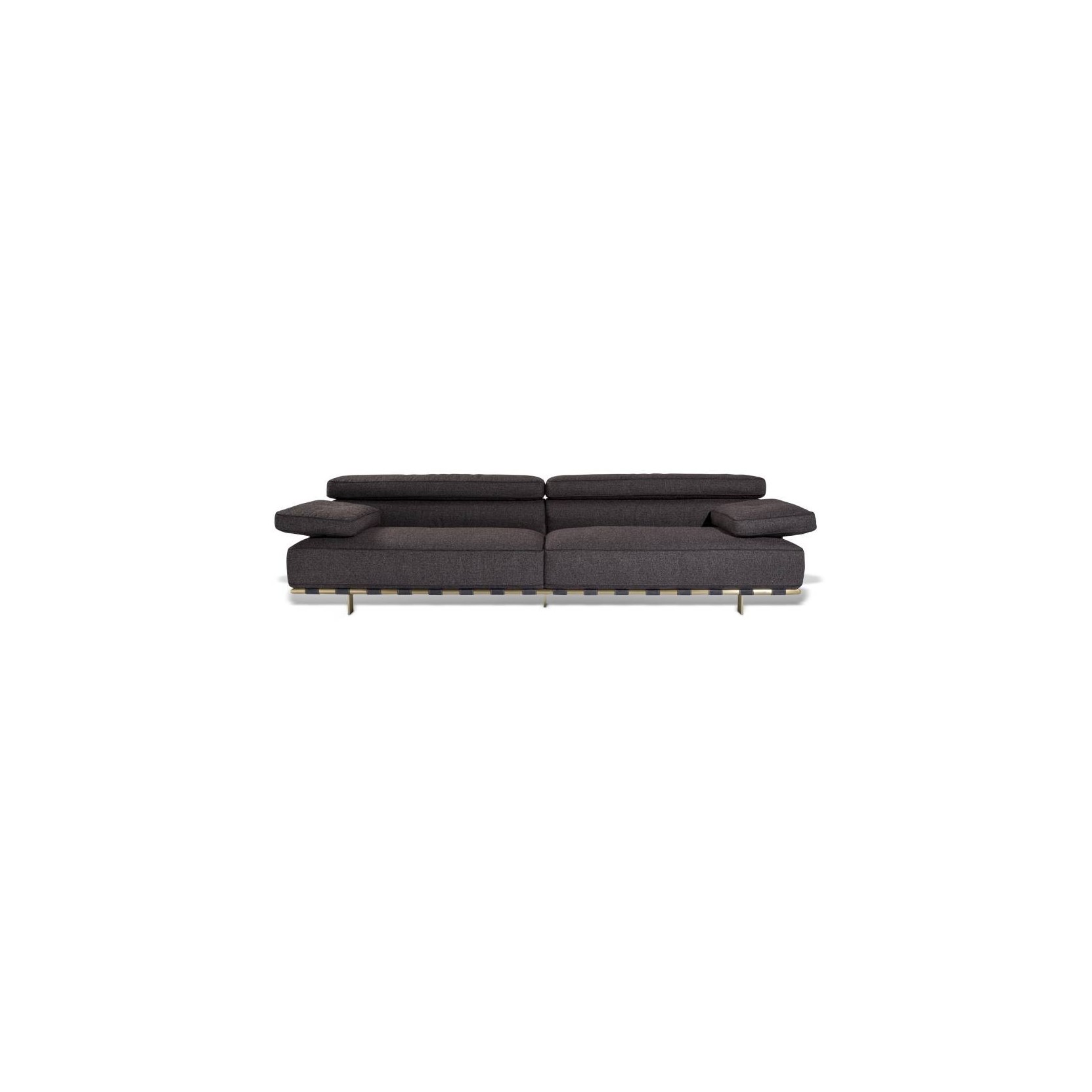 Sofa upholstered in leather or fabric, structure in wood with elastic spring belts, aluminium feet connected by means of crews to a frame in tubular metal with conic section, decorated with belts in leather or fabric Faber, gand, Kale, Eco-Skin. External structure in solid wood and plywood padded in polyurethane foam with different densities. Headrest padded in polyether and acrylic fiber, internal metal structure with adjustable inclination. Seat cushions and armrests in polyrethane foam, Memory Foam® and feather. When upholstered in fabric, piping and belts can be made in fabric Faber, Gand, Kale or Eco-Skin, or in Soft leather.